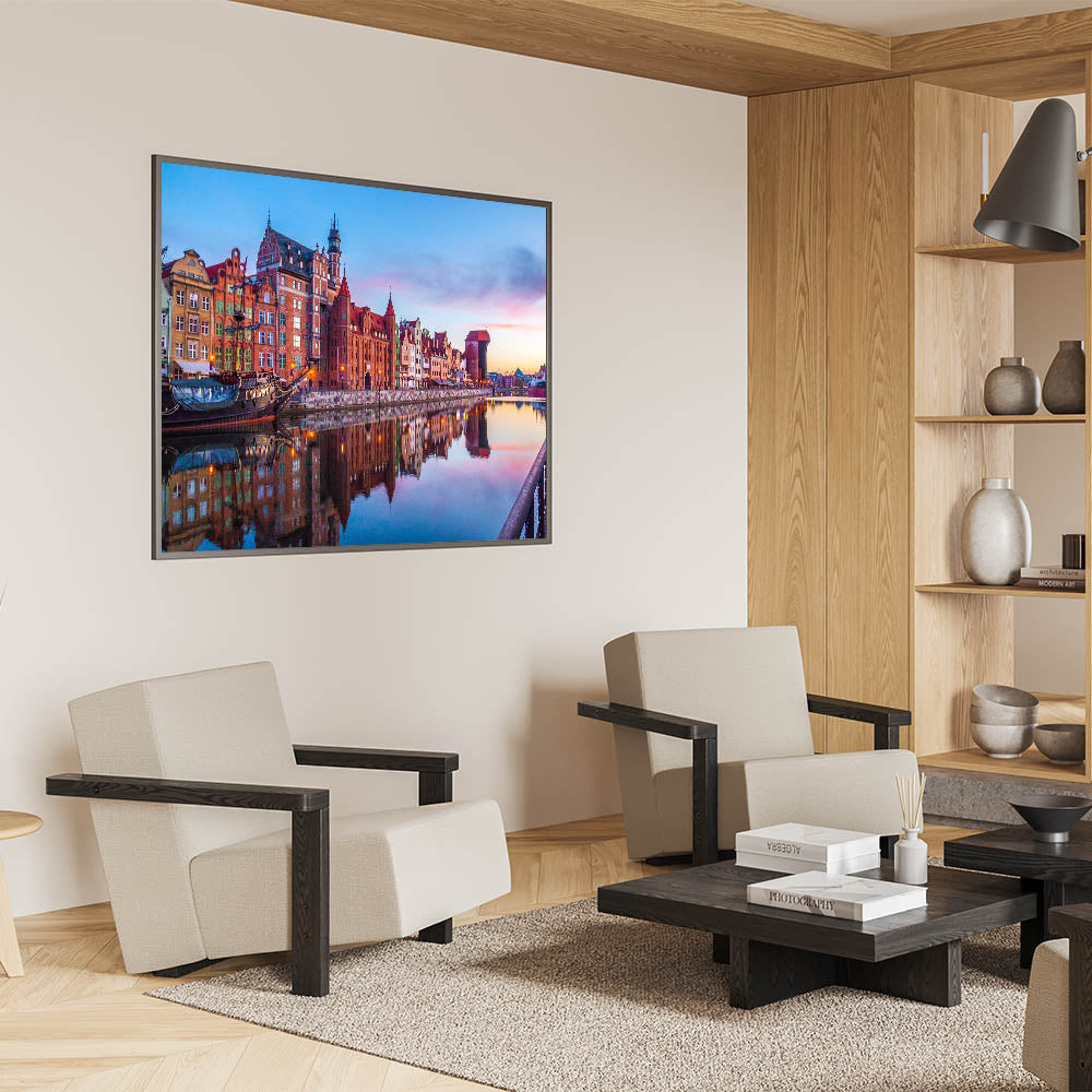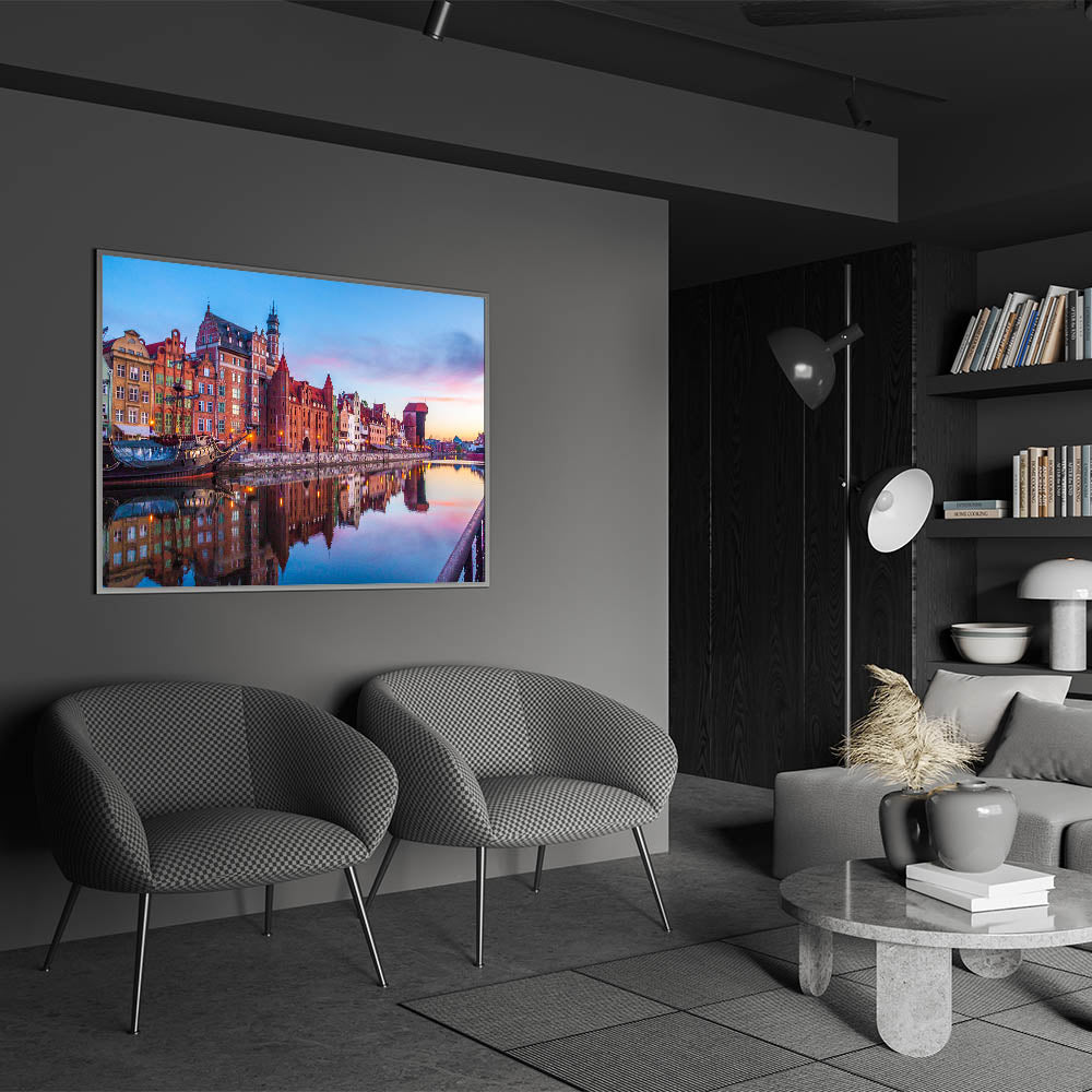 Add a sense of calm and historic charm to your home with this beautiful depiction of Gdańsk at dawn. Whether you're drawn to the city's colorful buildings or the serene reflection in the water, this artwork brings the magic of Poland’s historic cities into your space.