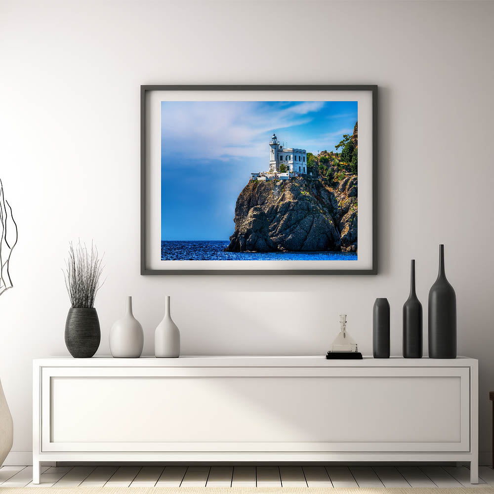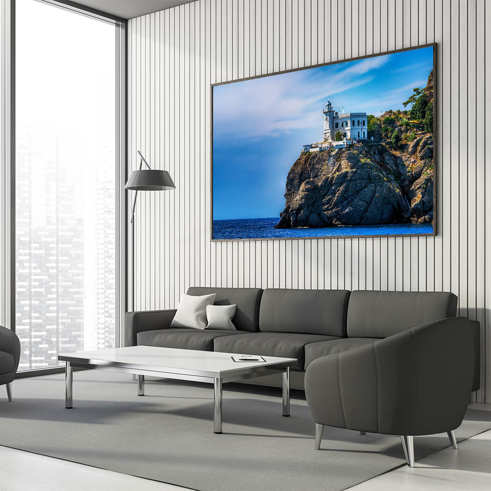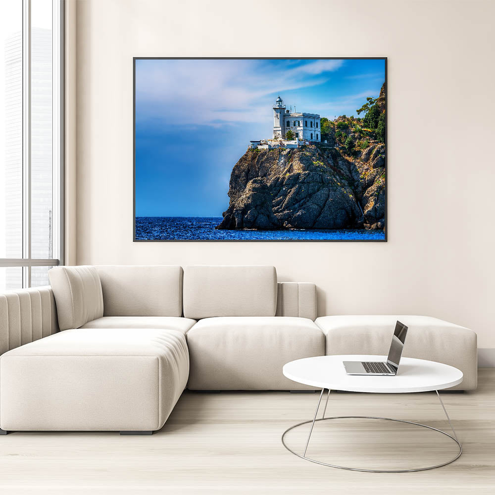 Bring the dramatic beauty of the Italian coast into your home with this stunning artwork featuring a lighthouse perched atop the rugged cliffs of Portofino. The brilliant blue sky and deep azure waters create a striking contrast with the rocky landscape, making this Portofino wall art perfect for those who love coastal decor. This Scenic Portofino canvas captures the timeless charm of the Italian Riviera, providing a serene yet powerful addition to any room.