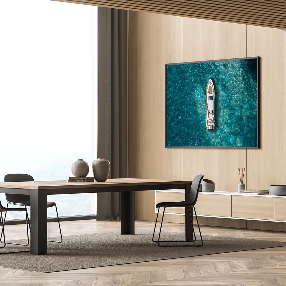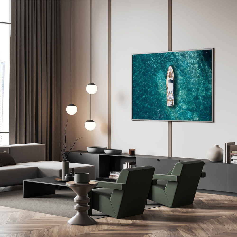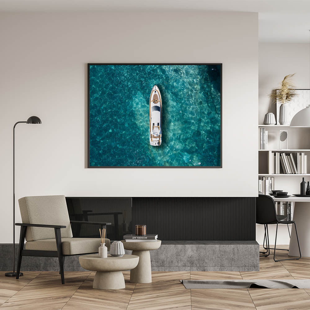 Bring the calm and luxury of the Italian coast into your space with this stunning aerial view of a yacht floating on the crystal-clear waters near Portofino. The vibrant blue hues and the sleek design of the yacht create a serene yet sophisticated vibe, making this Portofino wall art an ideal addition to any modern home or office. This piece evokes the tranquil beauty of the Mediterranean, perfect for those seeking to add a touch of elegance and coastal charm to their decor.