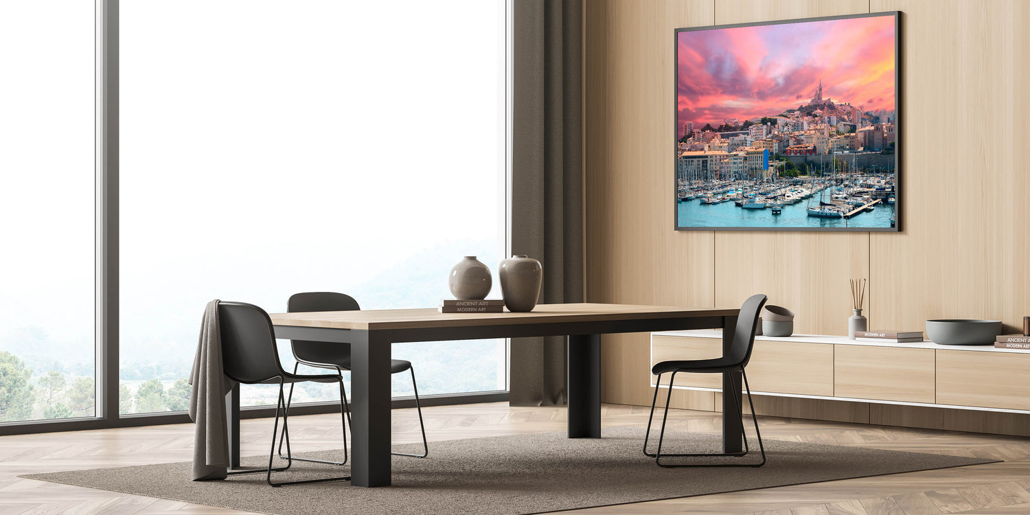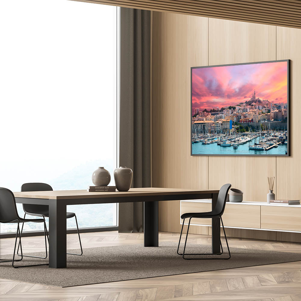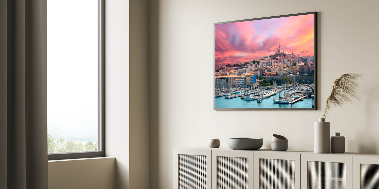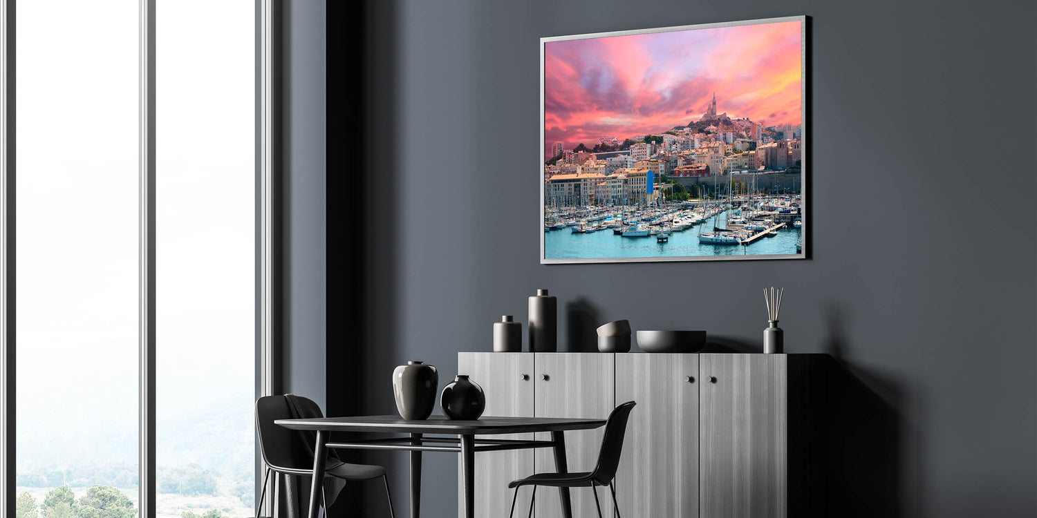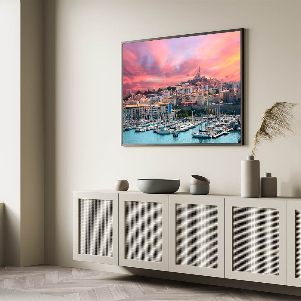 Capture the stunning beauty of Provence with this exquisite wall art, featuring a vibrant sunset over a bustling harbor and city skyline. The fiery hues of the sunset reflect off the water, creating a serene yet dramatic atmosphere. The image showcases the charming mix of modern and historic architecture, with sailboats gently resting in the harbor. This artwork is perfect for anyone who loves coastal landscapes or seeks to bring the essence of the Mediterranean into their home decor.