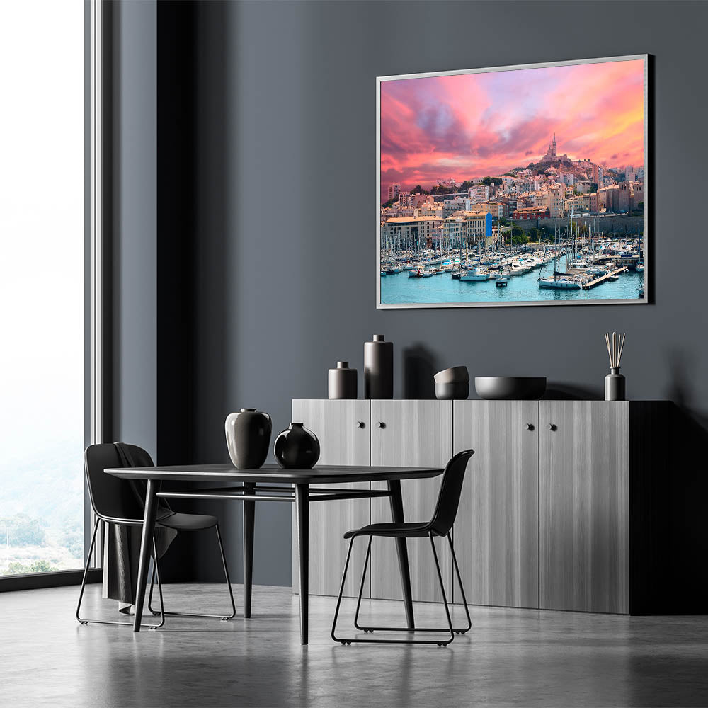 - High-resolution print of a Provence harbor at sunset with the city skyline