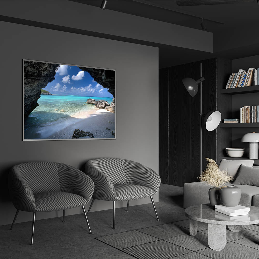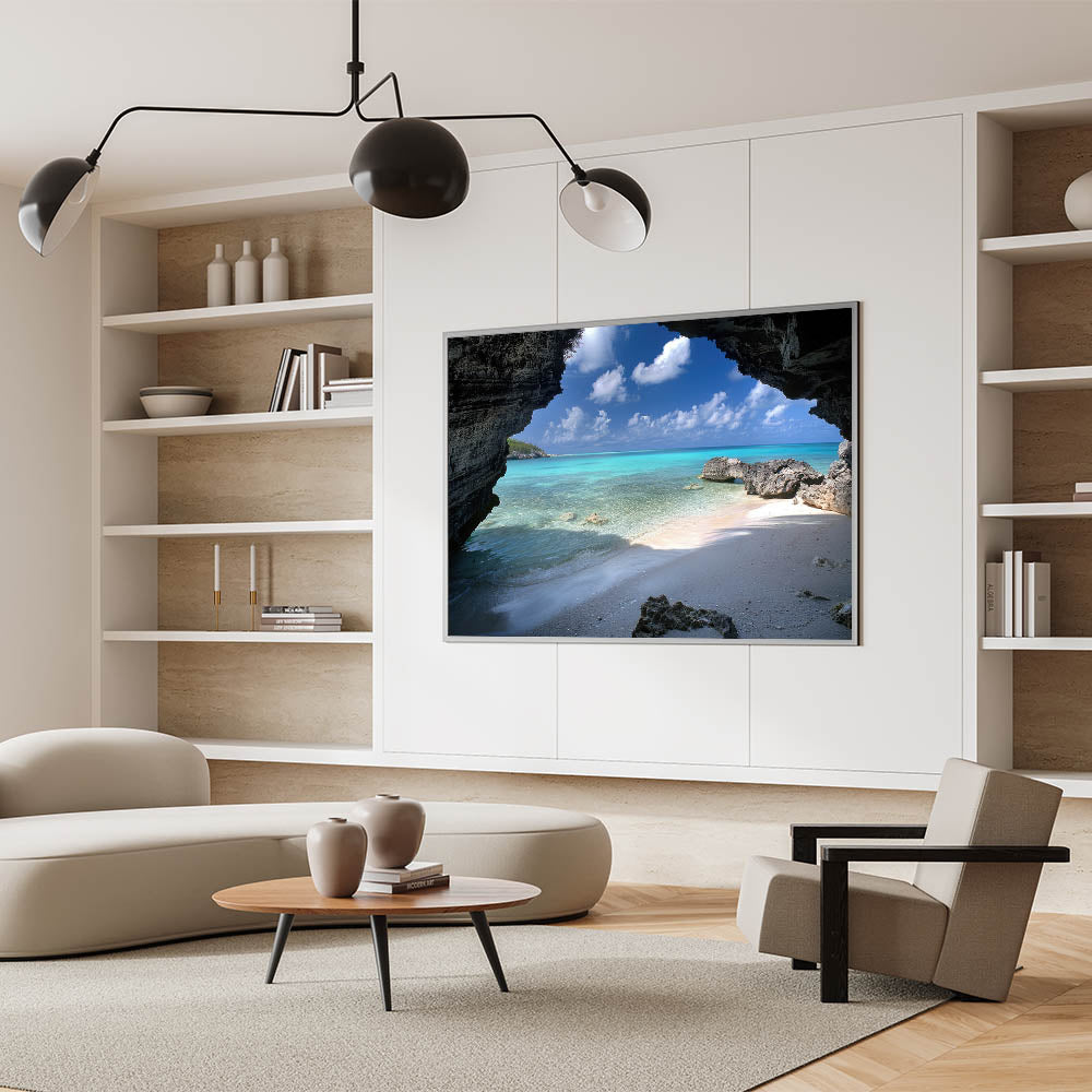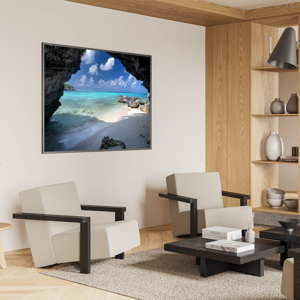 Uncover the hidden charms of Providenciales with our "Hidden Cove Mystery" wall art, part of the Turks and Caicos Scenery By Region Collection. This piece presents a stunning beach view seen through a natural rocky archway, offering a frame to the turquoise waters and white sands that make the Caribbean a paradise on earth.