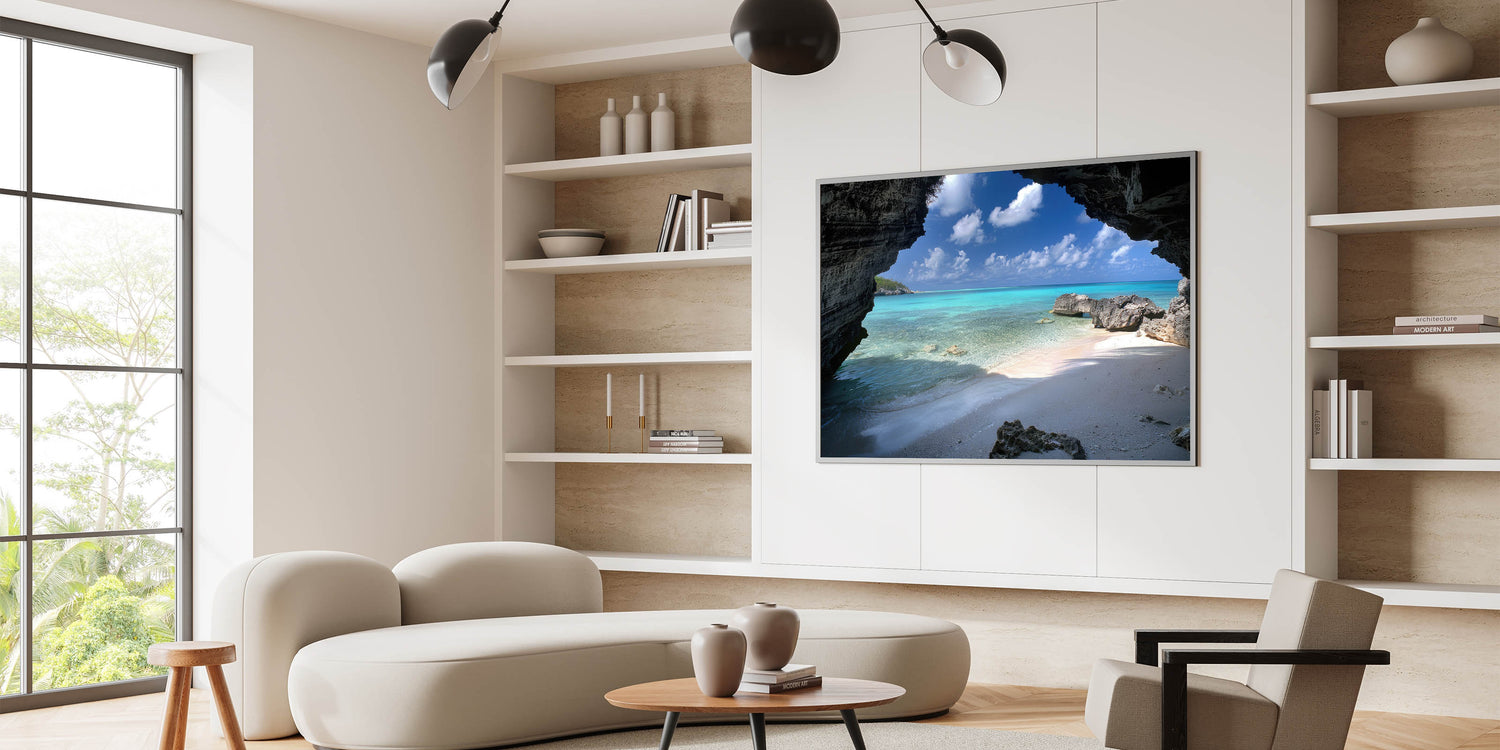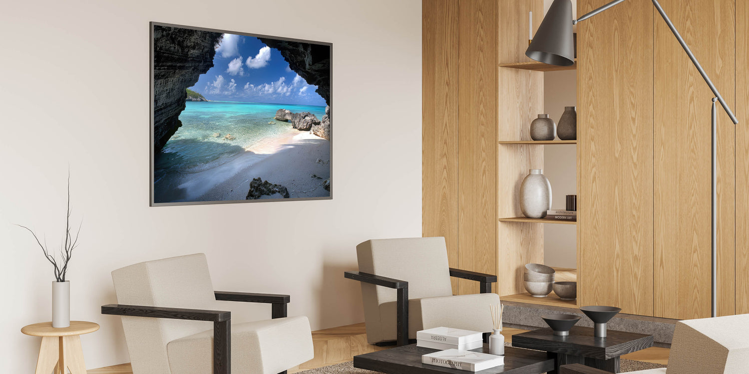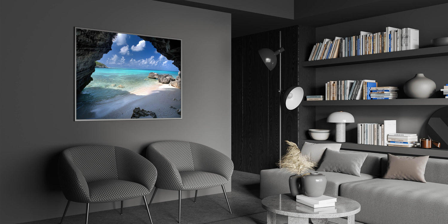 Uncover the hidden charms of Providenciales with our "Hidden Cove Mystery" wall art, part of the Turks and Caicos Scenery By Region Collection. This piece presents a stunning beach view seen through a natural rocky archway, offering a frame to the turquoise waters and white sands that make the Caribbean a paradise on earth.
