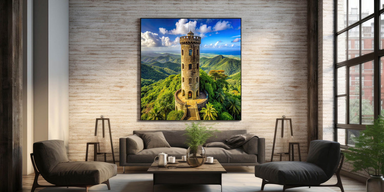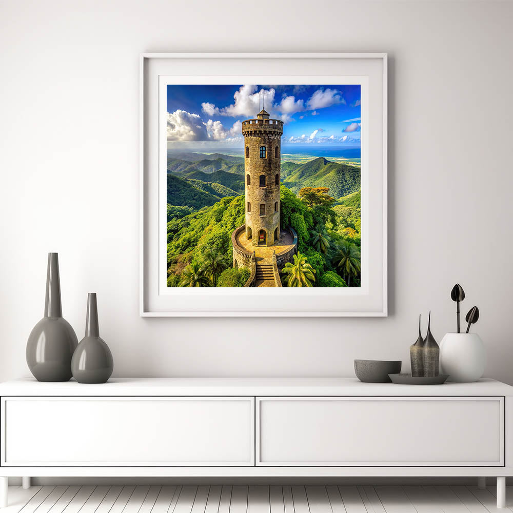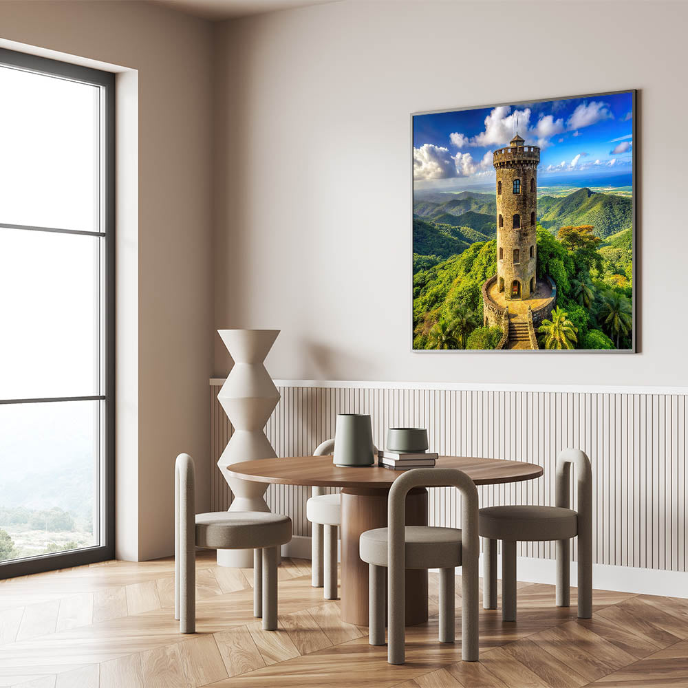 Bring the natural beauty of Puerto Rico into your home with this stunning artwork featuring a majestic tower in the heart of El Yunque Rainforest. This captivating scene showcases the rich green mountains and vibrant sky, offering a view of Puerto Rican Scenery that combines history and nature. The tower stands tall amidst lush greenery, making it the perfect piece for those looking to add a sense of adventure and natural beauty to their space. This Tropical Paradise Wall Decor is ideal for anyone who loves nature, history, and the magic of the Caribbean landscape.
