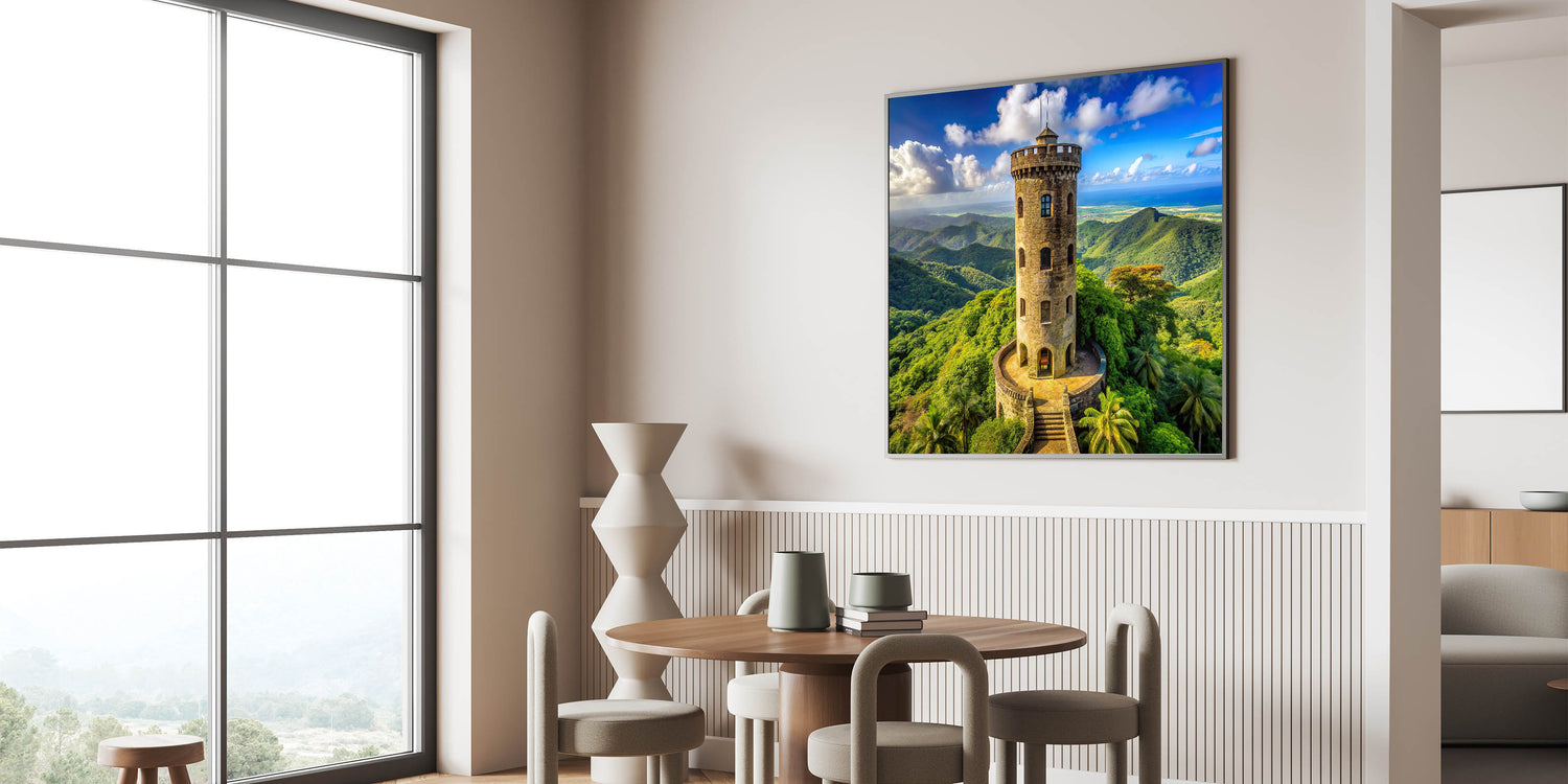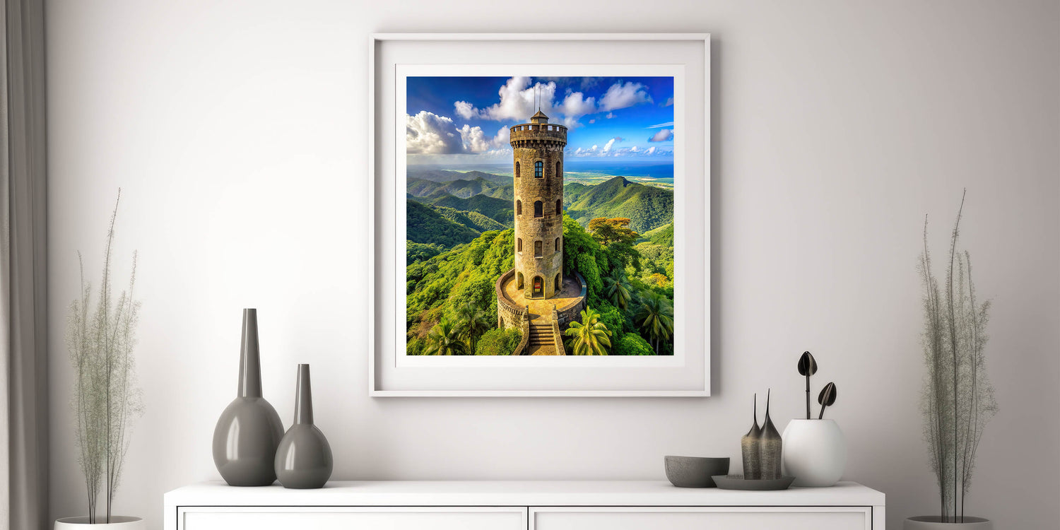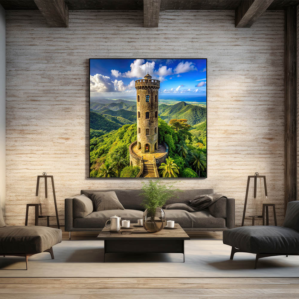 Bring the natural beauty of Puerto Rico into your home with this stunning artwork featuring a majestic tower in the heart of El Yunque Rainforest. This captivating scene showcases the rich green mountains and vibrant sky, offering a view of Puerto Rican Scenery that combines history and nature. The tower stands tall amidst lush greenery, making it the perfect piece for those looking to add a sense of adventure and natural beauty to their space. This Tropical Paradise Wall Decor is ideal for anyone who loves nature, history, and the magic of the Caribbean landscape.