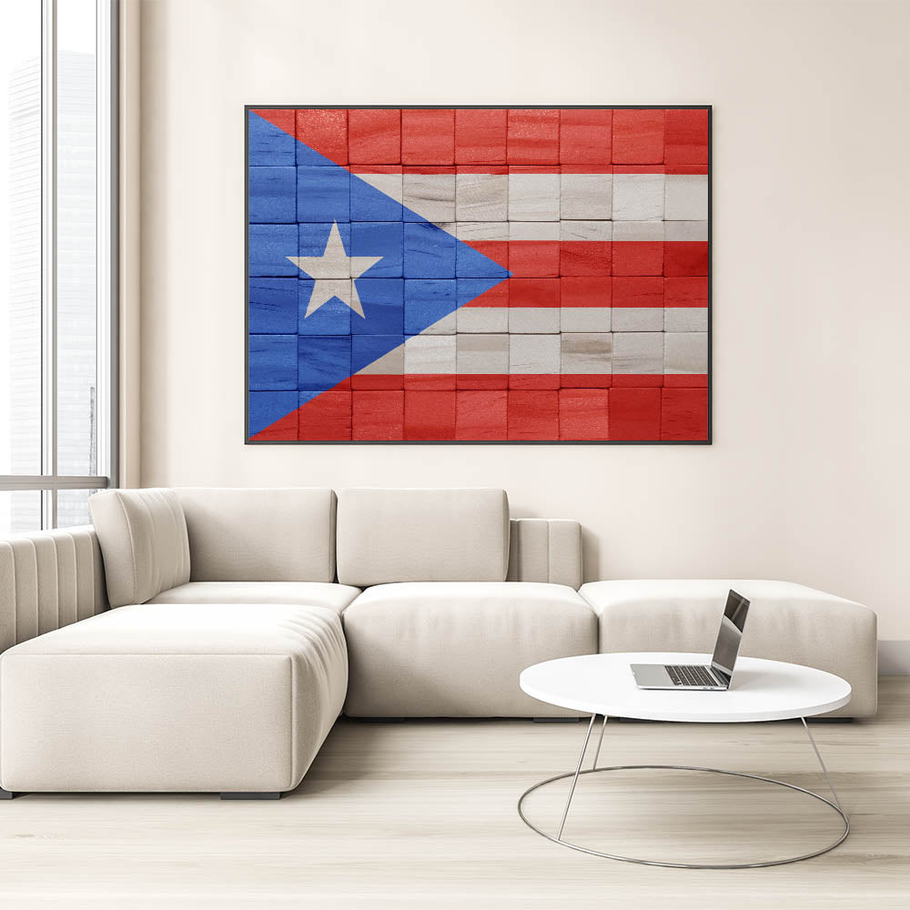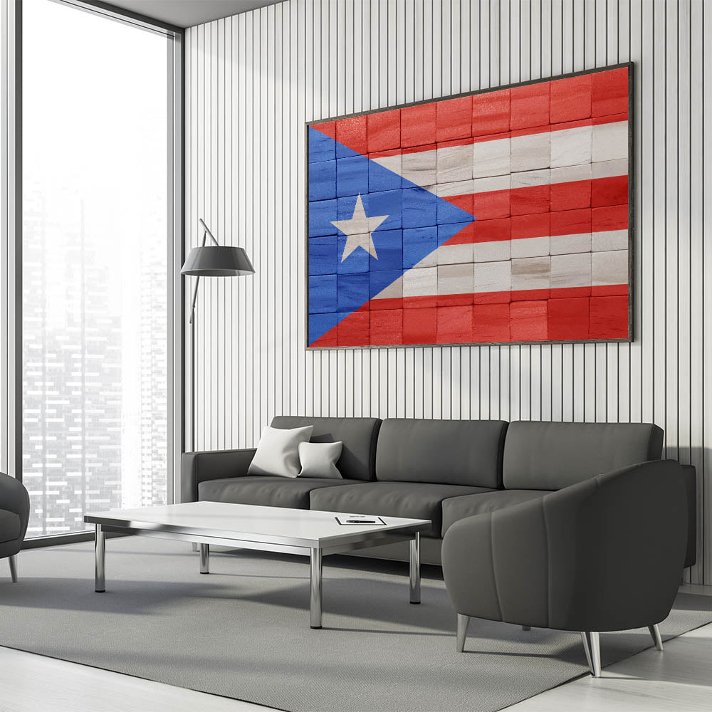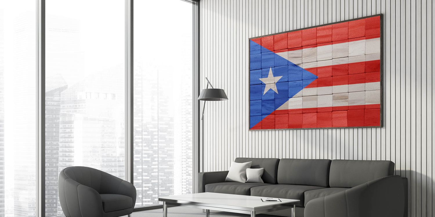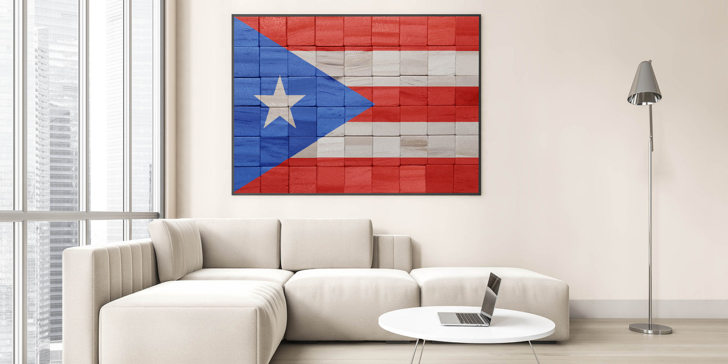 Celebrate the spirit and culture of Puerto Rico with this stunning piece of Puerto Rican Scenery. Featuring a rustic rendition of the Puerto Rican Flag, this artwork adds a touch of island pride to any space. The unique wooden block design offers a textured and modern look that pairs beautifully with traditional or contemporary decor. Perfect for any room, this San Juan Wall Decor brings the vibrant energy of Puerto Rico into your home.