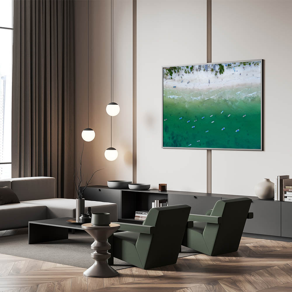 Capture the tranquil beauty of Mexico’s Quintana Roo with this stunning aerial view wall art. Featuring a scenic stretch of sandy beach lined with boats floating gently in the calm green waters, this artwork brings a sense of serenity and coastal charm to any room. The peaceful waves rolling onto the shore and the vibrant colors of the boats provide a unique perspective of Mexico’s coastal paradise.
