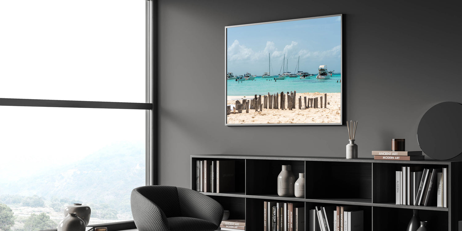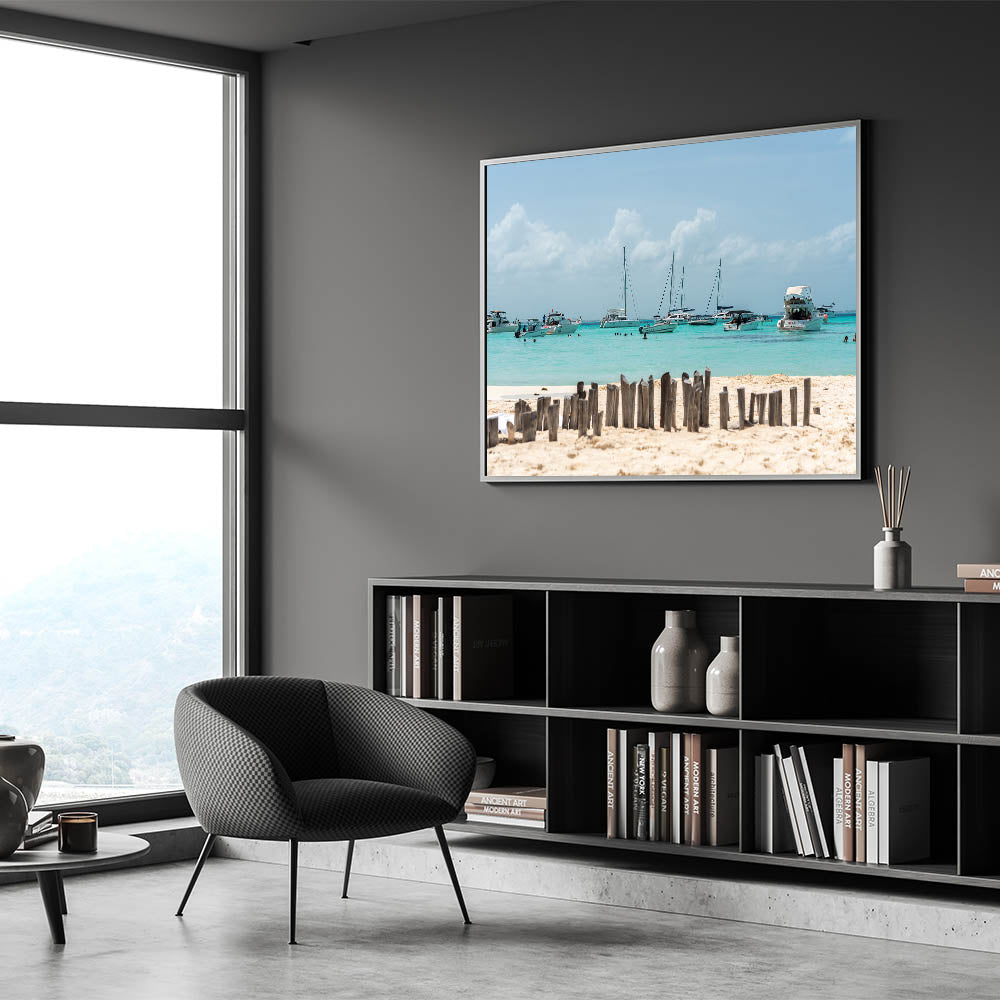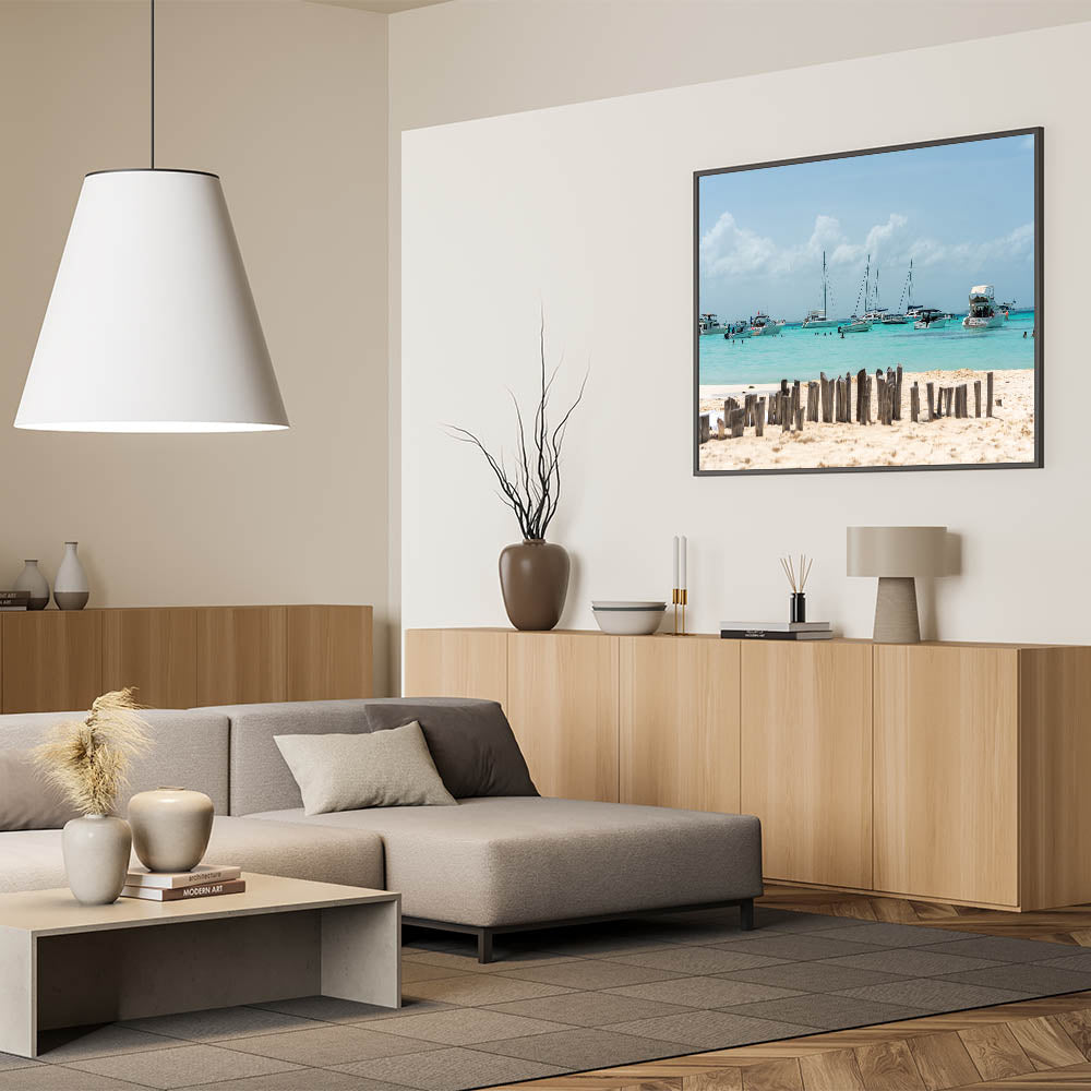 Immerse yourself in the tropical beauty of Cancun with this captivating Quintana Roo wall art. Featuring a picturesque view of the serene turquoise waters, dotted with sailboats, this piece perfectly captures the tranquil atmosphere of Mexico’s famous Riviera Maya. The wooden posts in the foreground add a rustic, authentic touch to this coastal landscape, making it ideal for beach-inspired home decor.
