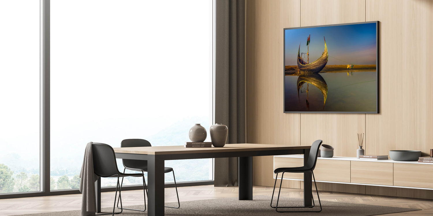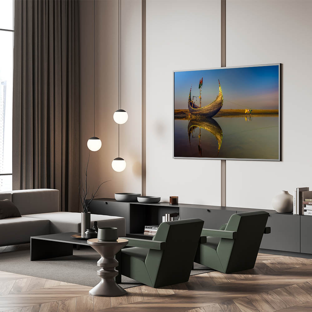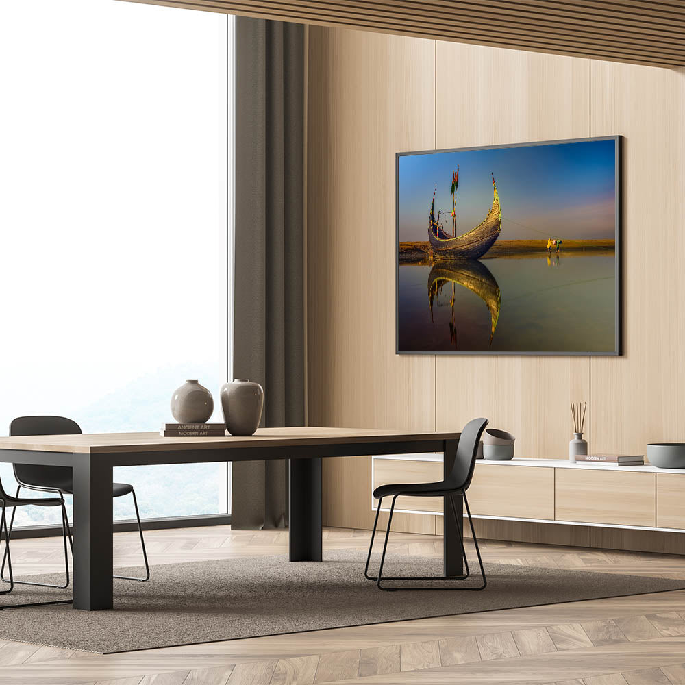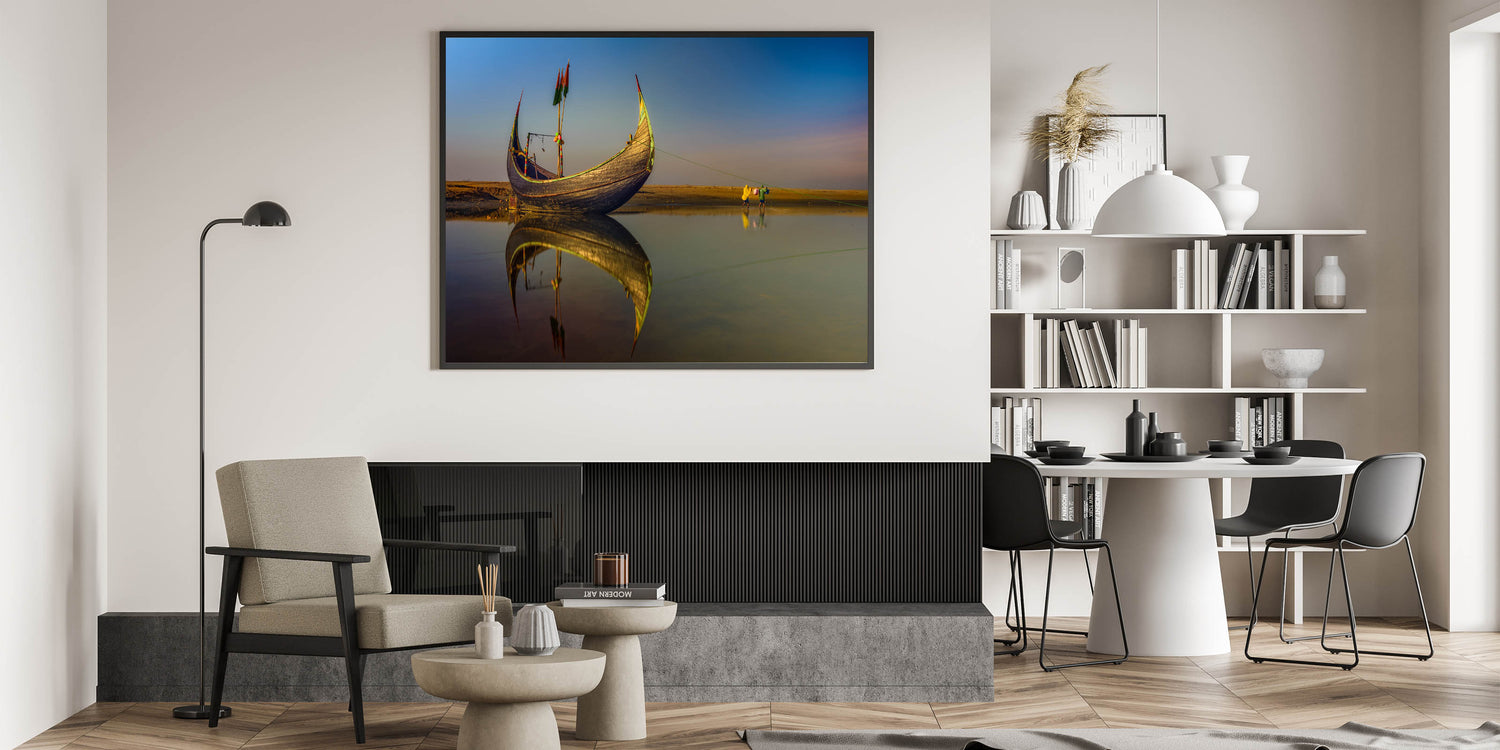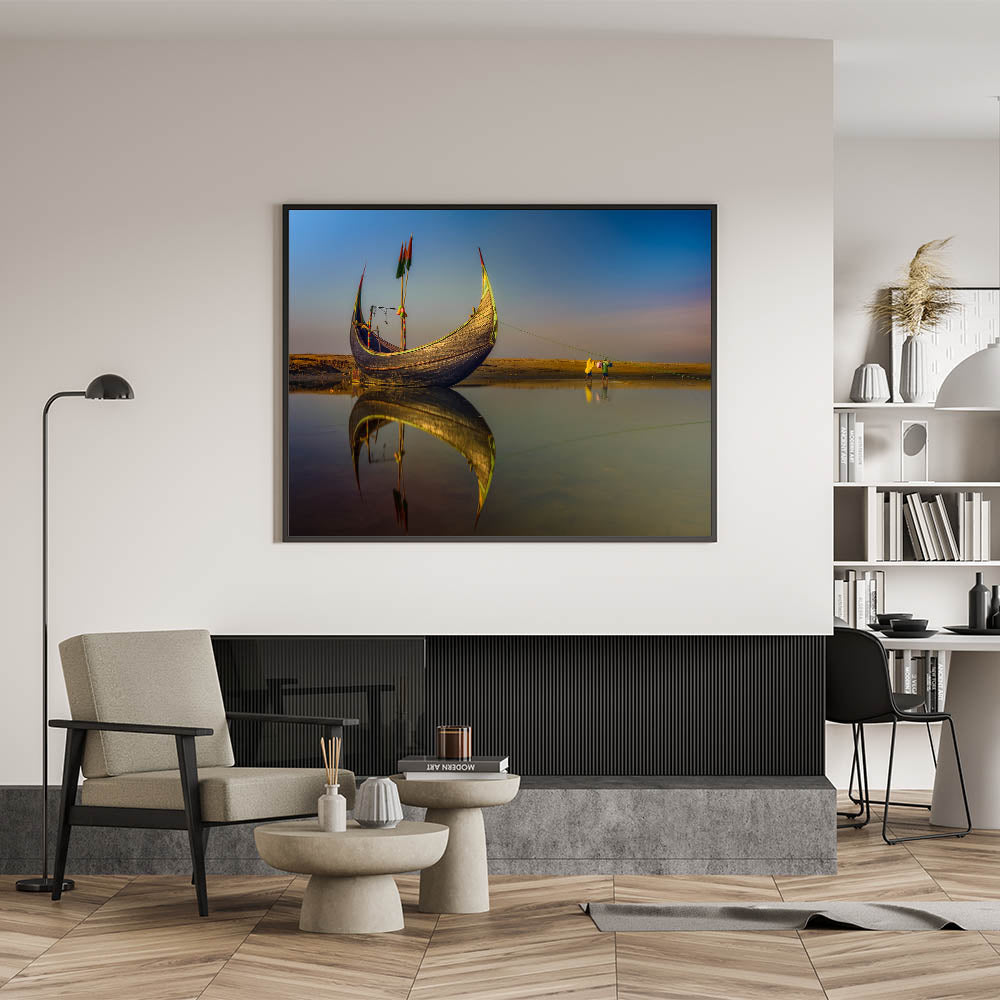 Embrace the calm and tranquility of Bangladesh’s coastal life with this captivating wall art, featuring a traditional fishing boat reflected perfectly on still waters at dusk. The artwork captures the serene beauty of the coastline, where the soft light of the setting sun bathes the scene in warm hues of gold and blue. The simplicity and elegance of the scene evoke a sense of peace and contemplation, making it an ideal piece for creating a relaxing atmosphere in any space.