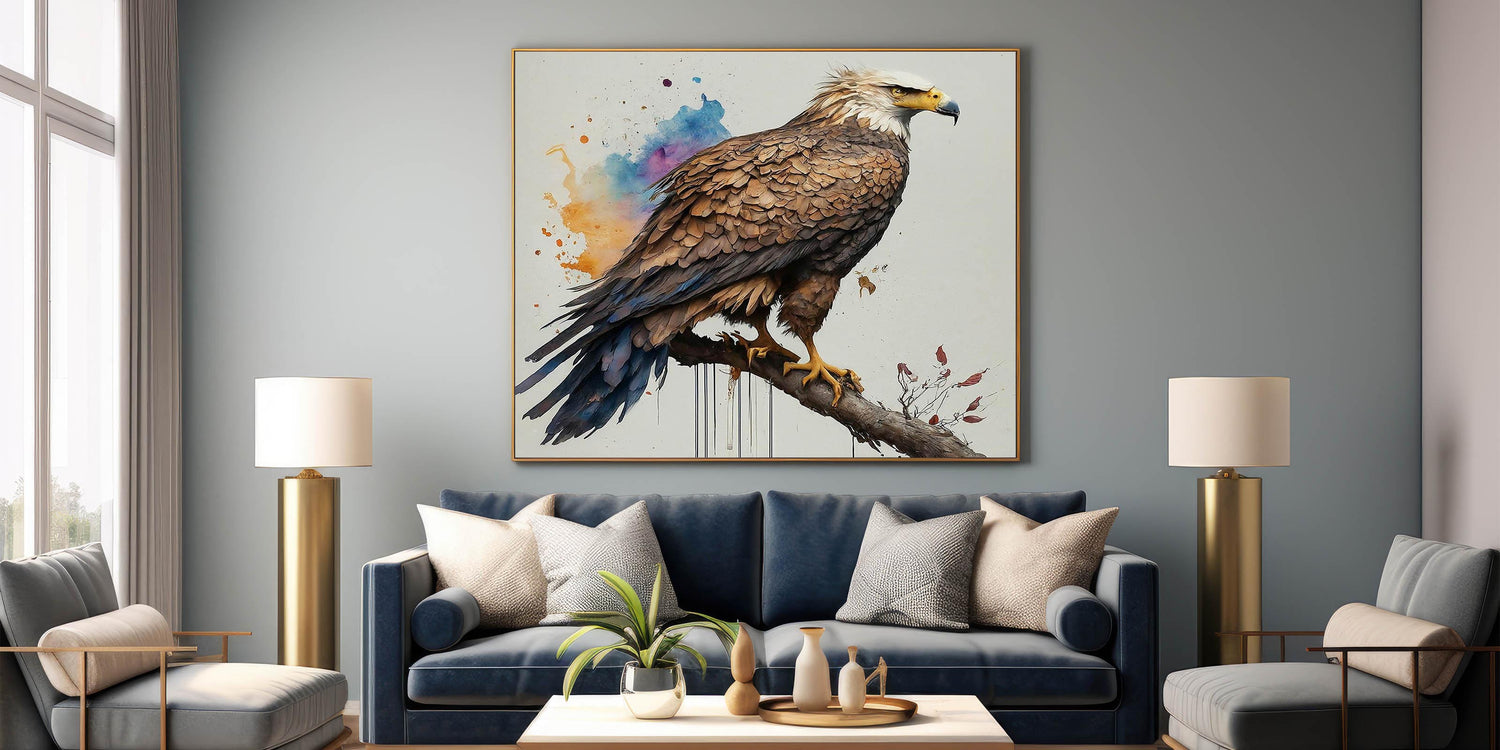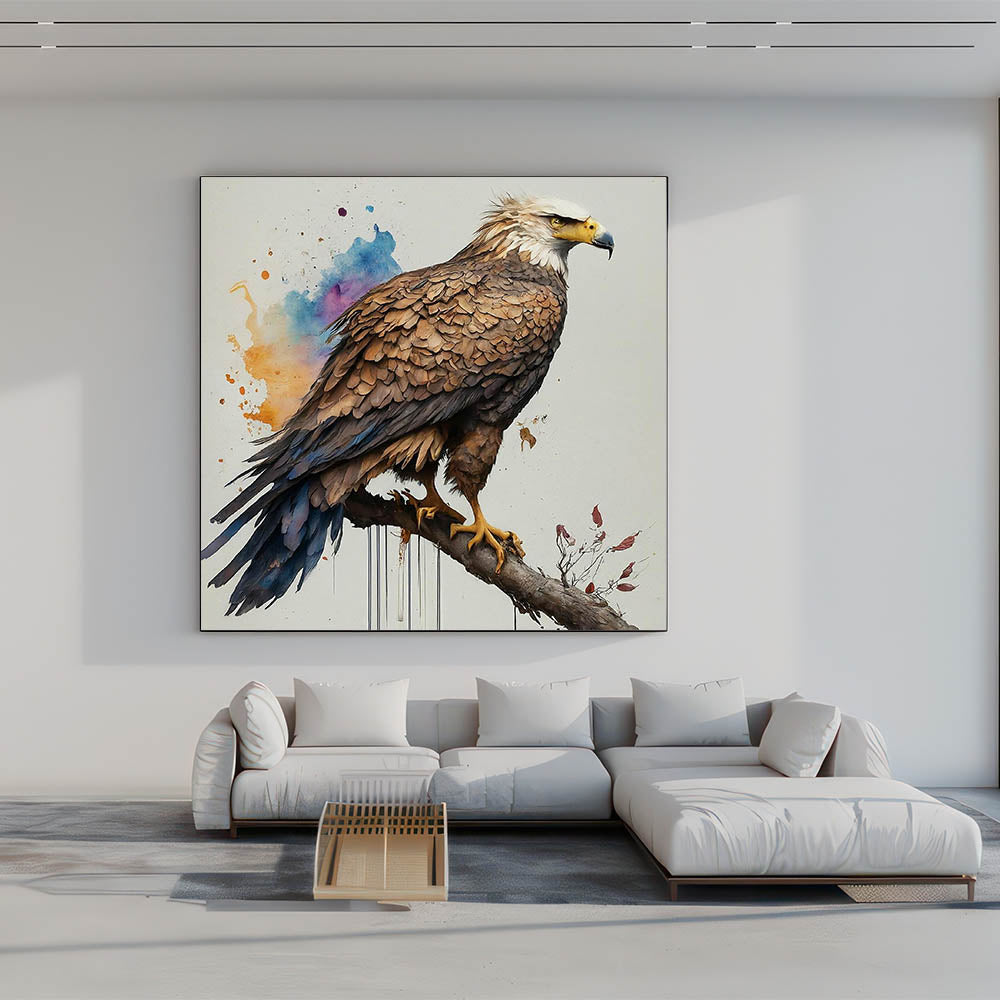 Elevate your interior decor with this stunning portrayal of a majestic eagle from our Birds of Prey collection. This exquisite artwork captures the eagle in a proud, commanding stance, perched gracefully on a branch. The detailed textures of the feathers and the eagle's focused gaze bring a sense of realism and power to the piece, while the vibrant background splashes of orange, blue, and purple add a modern, artistic flair.