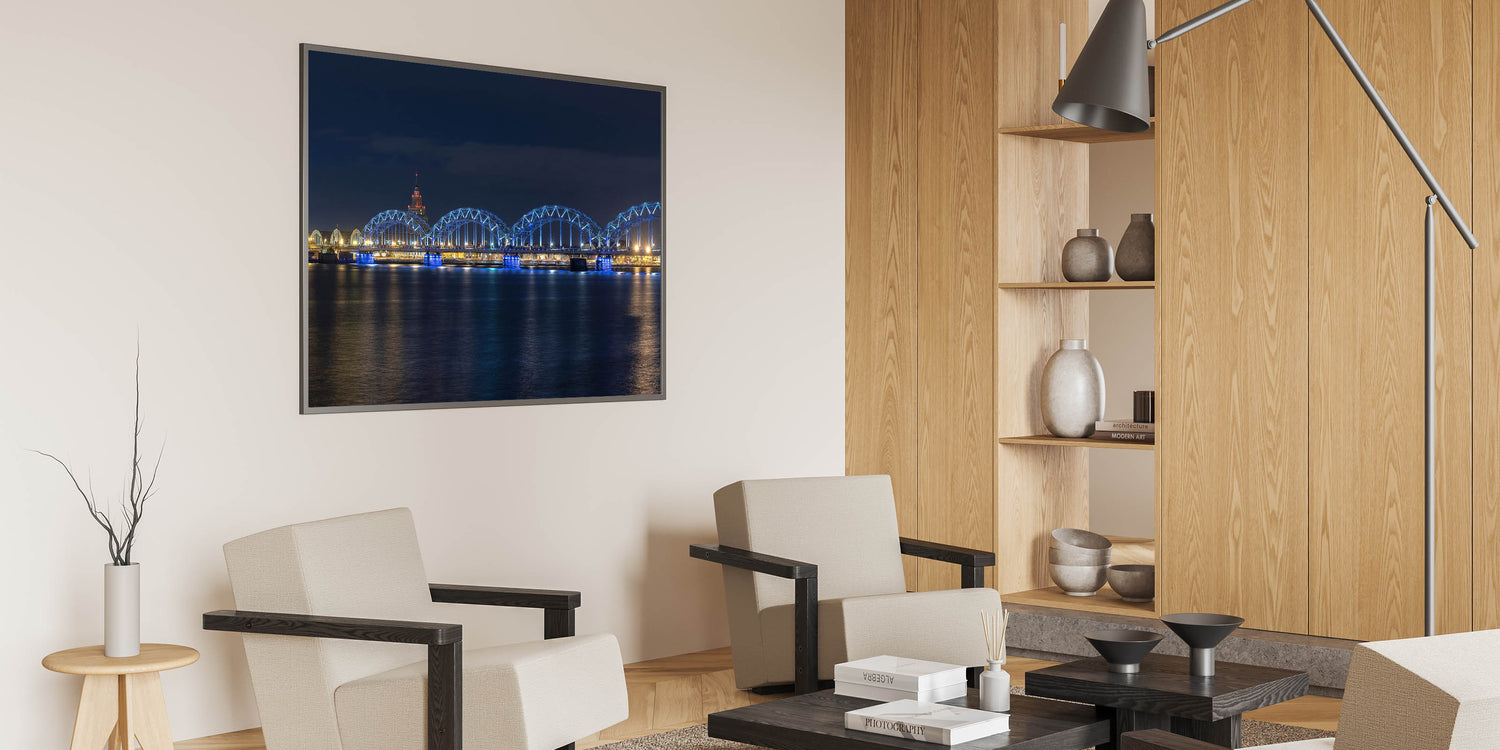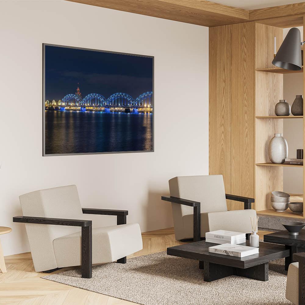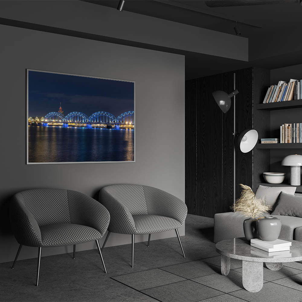 - Showcases high-quality Latvia prints of the illuminated railway bridge in Riga.