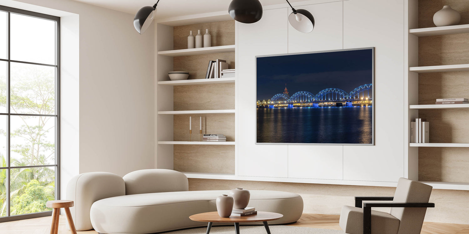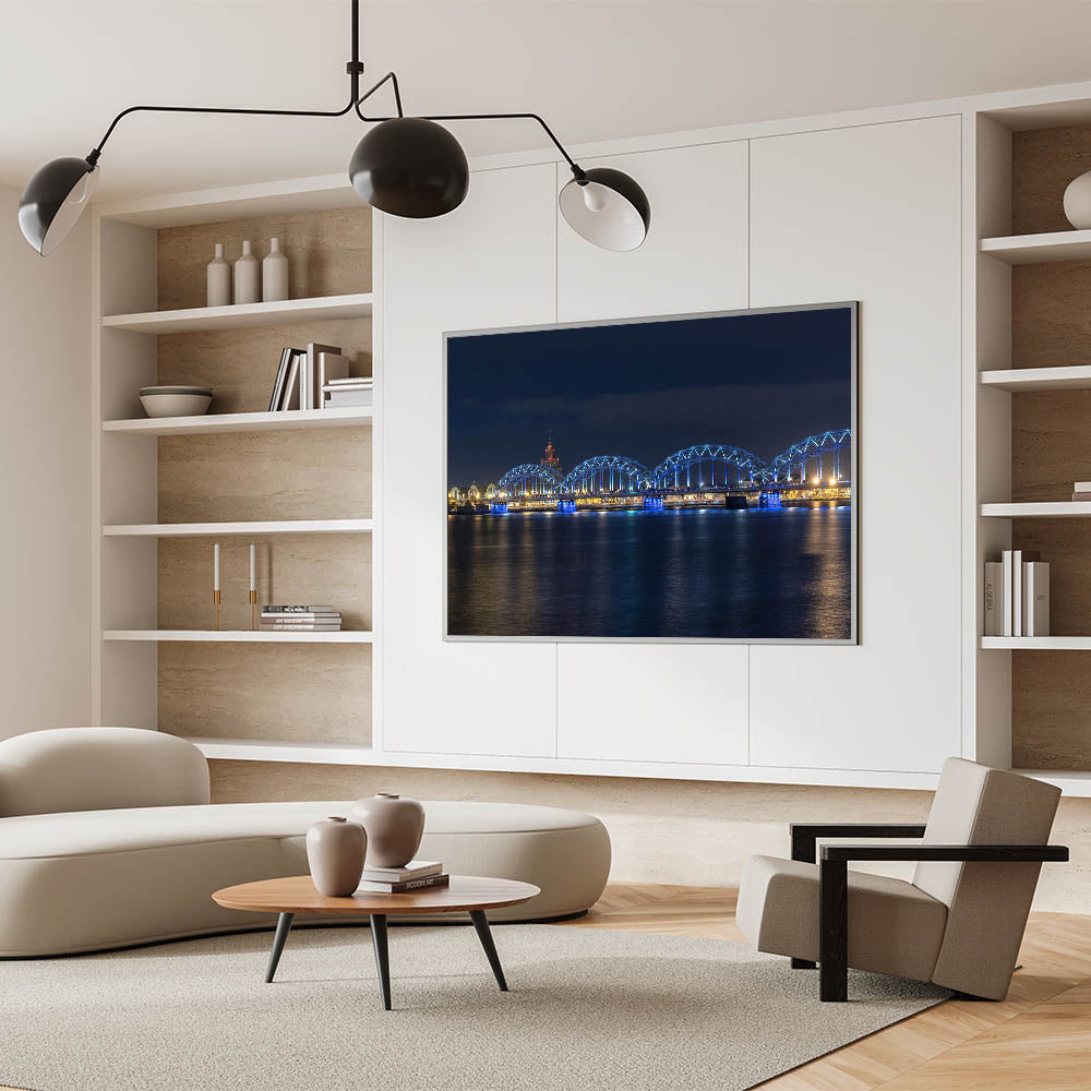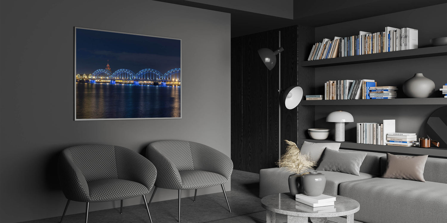 - Showcases high-quality Latvia prints of the illuminated railway bridge in Riga.
