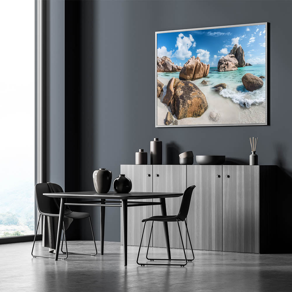 Bring the rugged beauty of a secluded beach into your home with our Rocky Beach Paradise Wall Art. This stunning piece captures the serene contrast between massive, weathered boulders and the crystal-clear turquoise waters that gently lap against the shore. The unique composition and natural elements make this artwork a perfect addition to any room, infusing your space with a sense of tranquility and timeless beauty.
