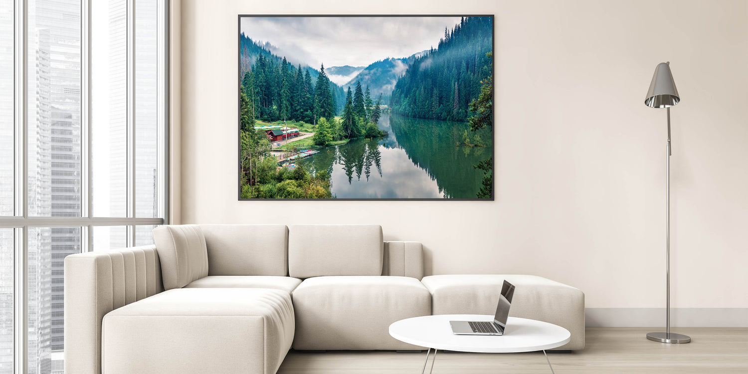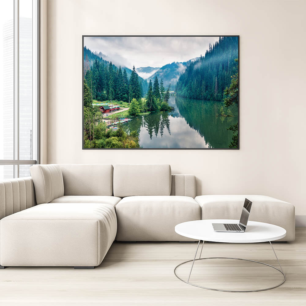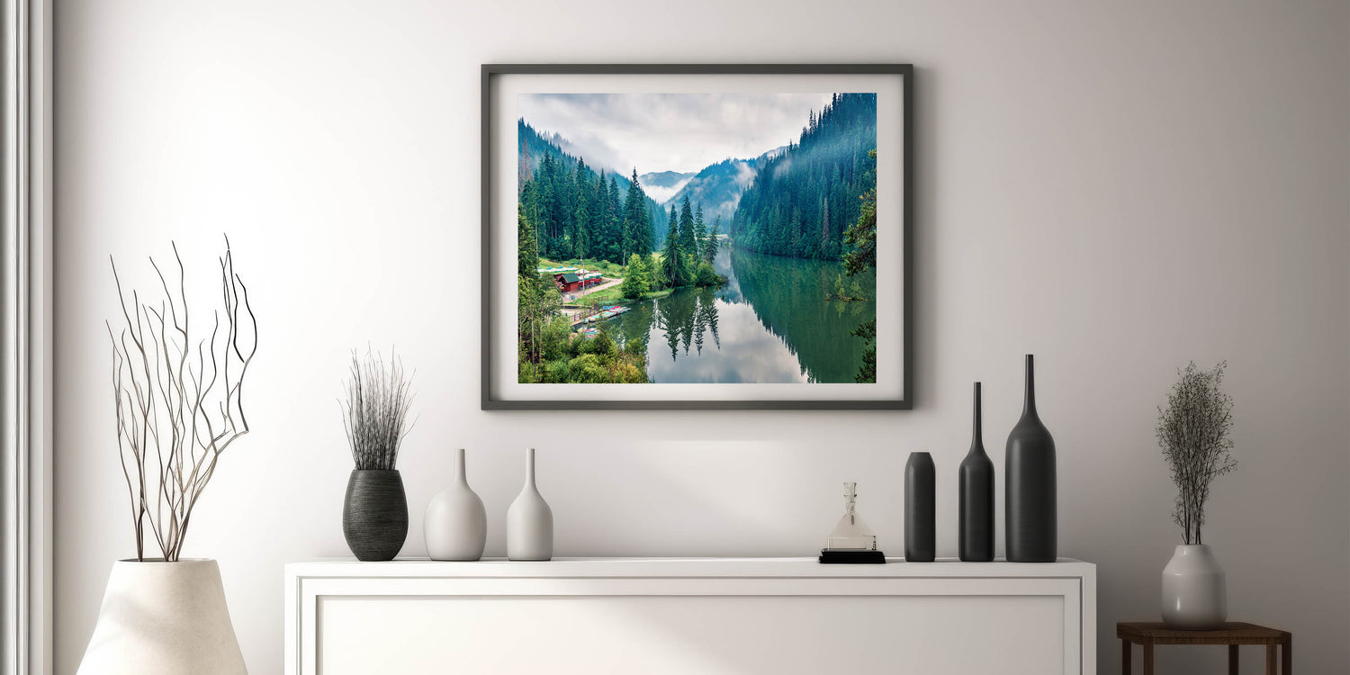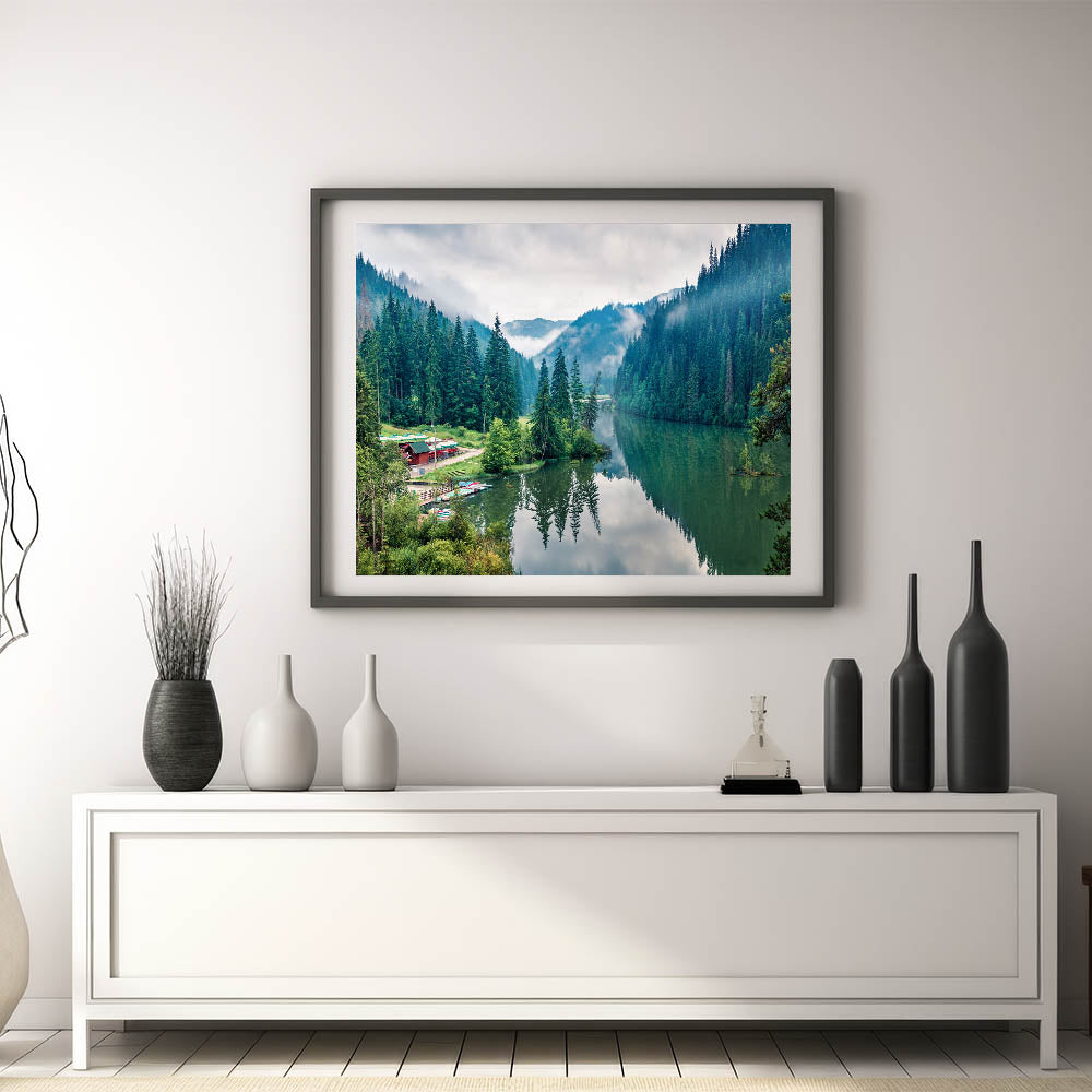 Immerse yourself in the peaceful beauty of Romania’s natural landscapes with this breathtaking wall art. This serene print showcases a tranquil lake surrounded by towering pine trees, with mist rolling over the distant mountains. The calm water reflects the lush greenery, offering a soothing and relaxing view that will bring a sense of calm to any space.
