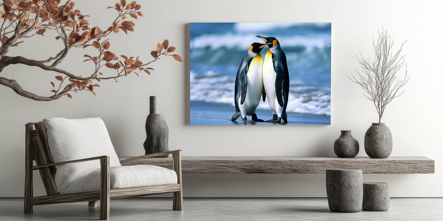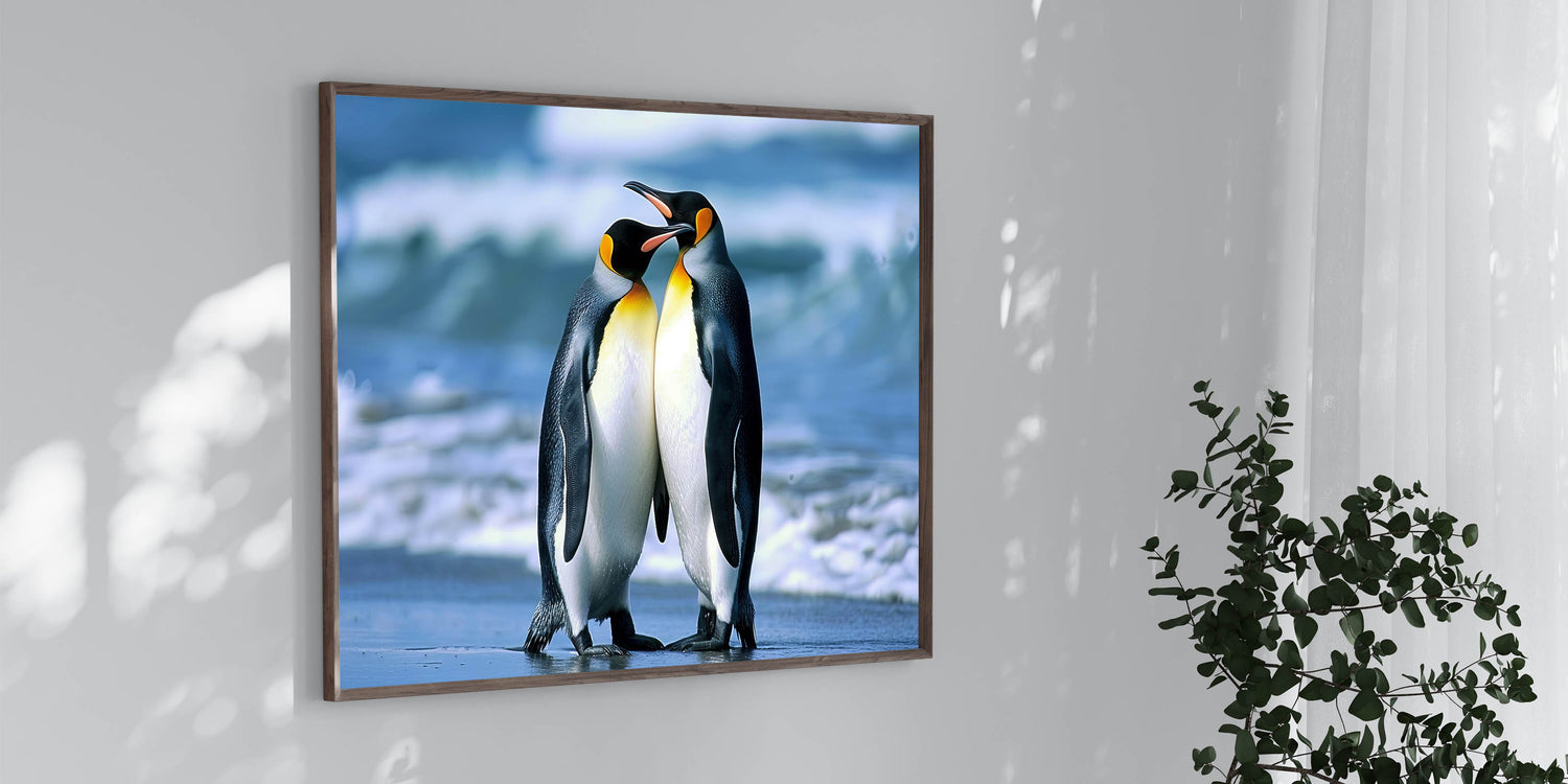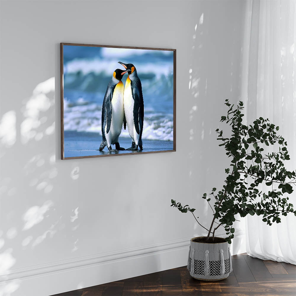 - Heartwarming Design: The gentle interaction between the penguins, set against a tranquil beach background, brings a sense of calm and love to any room.