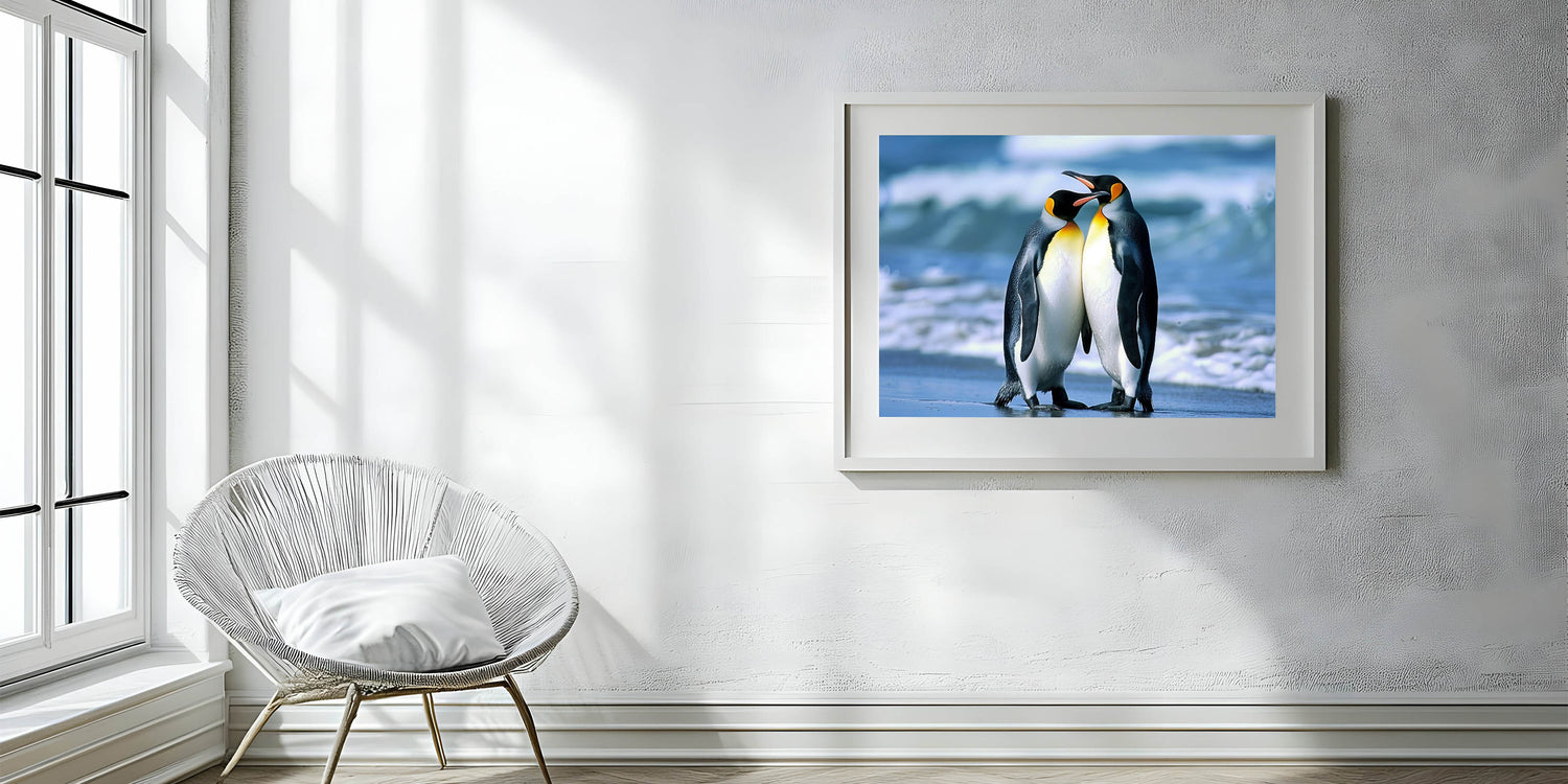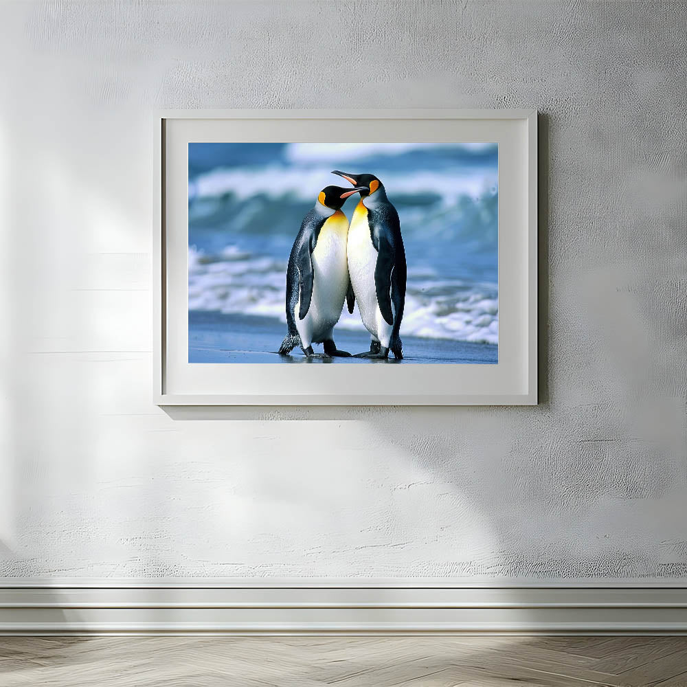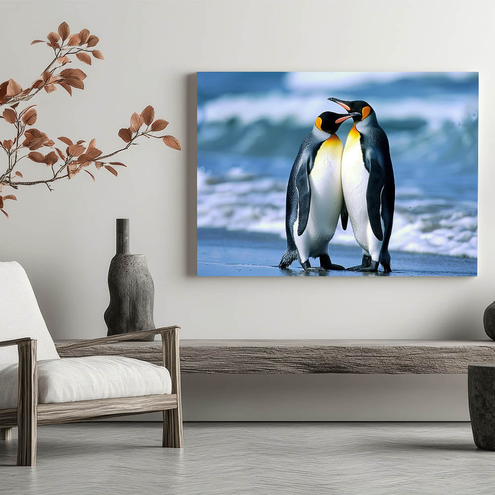 Capture a moment of tender connection with this beautiful romantic penguin wall art. This captivating piece features two penguins standing close together on a serene beach, their beaks gently touching as they share a quiet moment by the ocean. The calming blue tones of the sea and sky contrast with the vivid colors of the penguins, creating a peaceful and heartwarming scene that is perfect for any space.