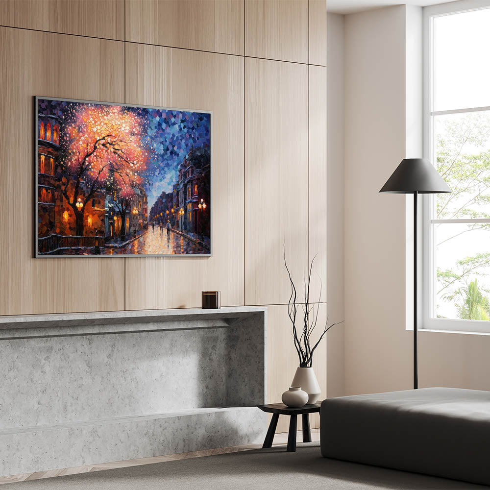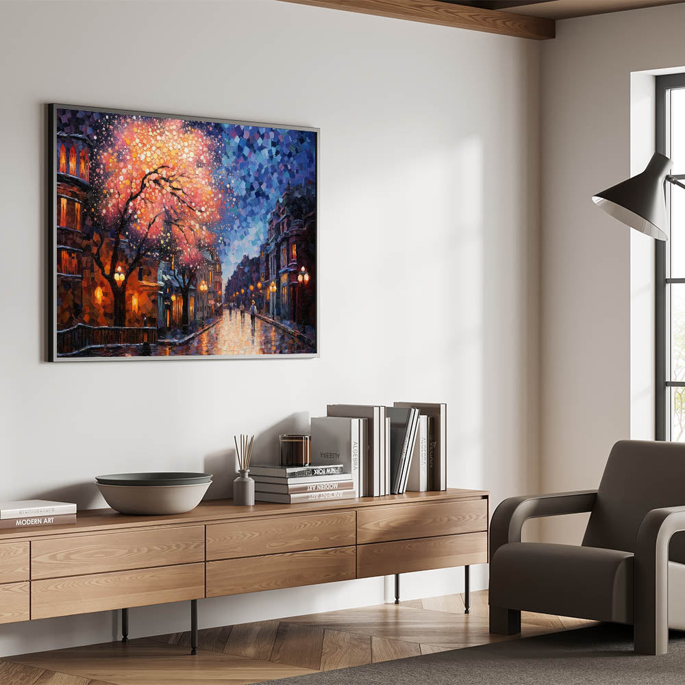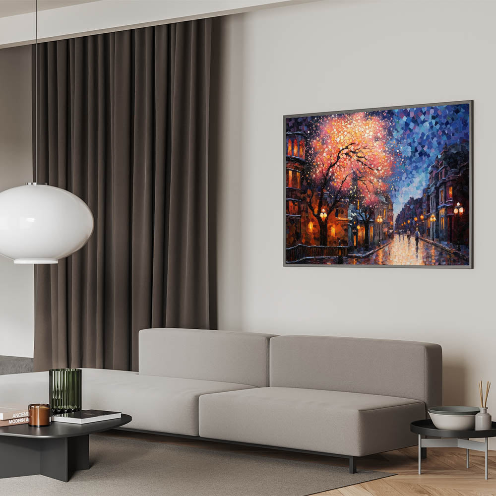 Illuminate your space with this Romantic Street Scene Art Print, capturing the mesmerizing beauty of a city night drenched in vibrant colors. This artwork showcases a dreamy cityscape, where warm street lights and a cascade of pink and orange hues blend seamlessly with the cool blues of the night sky. The intricate mosaic-like details add a touch of modern artistry, making this piece a stunning focal point in any room.