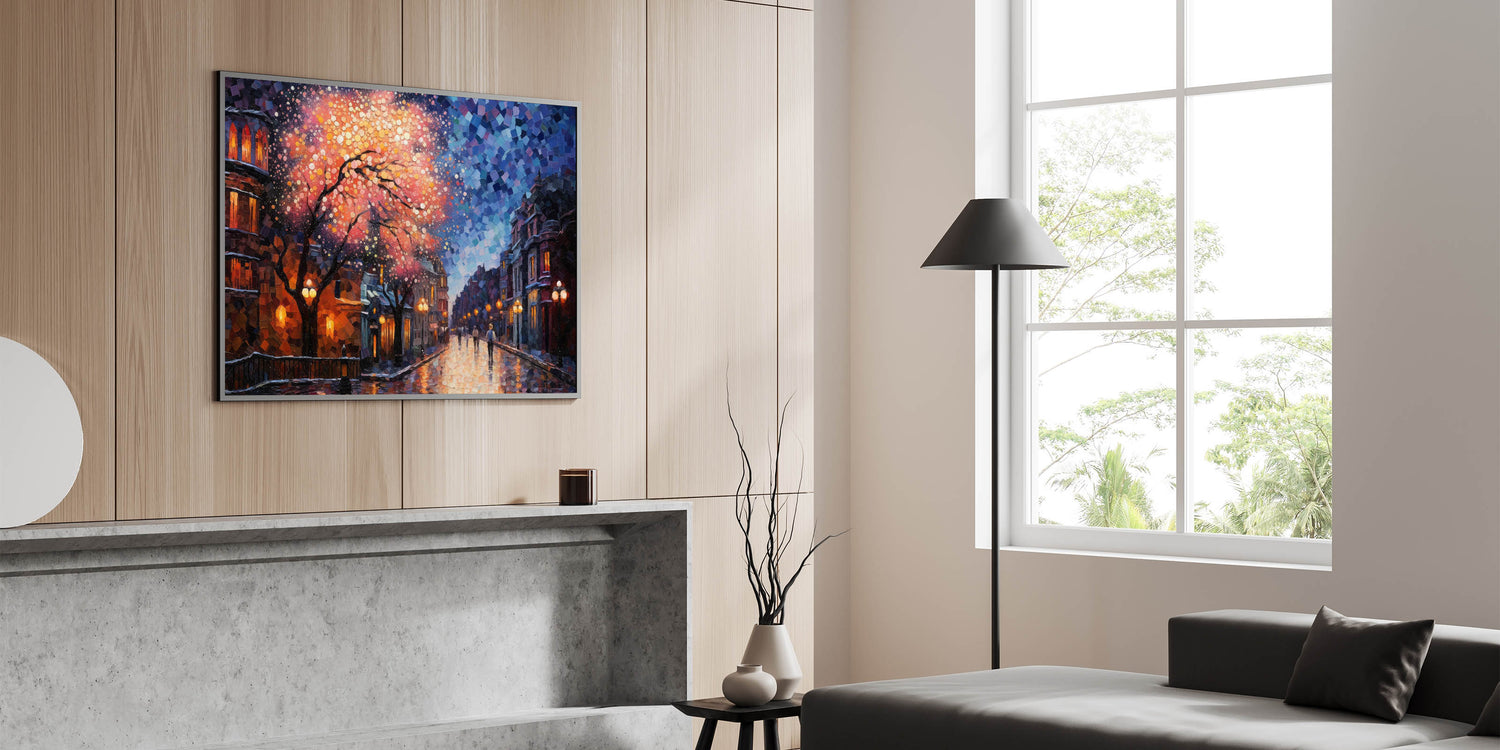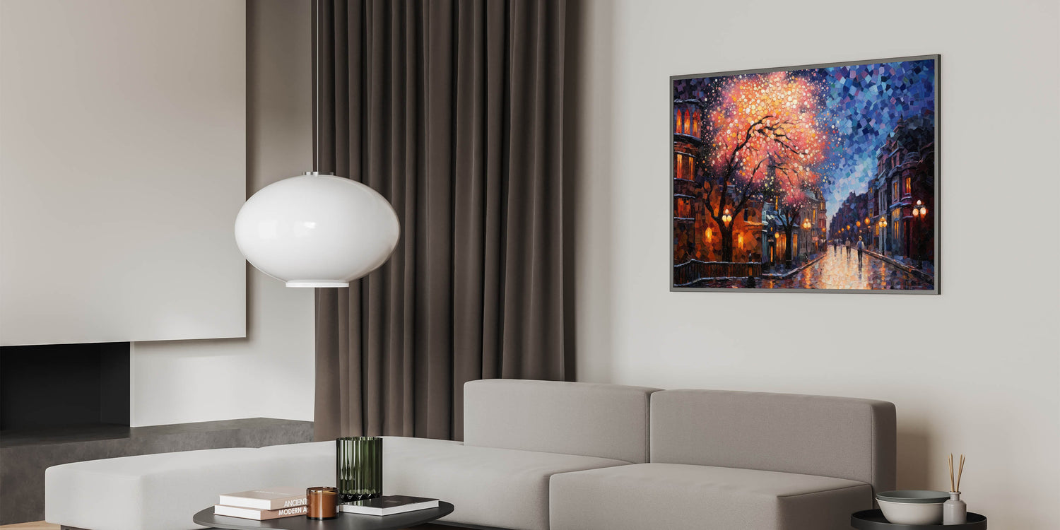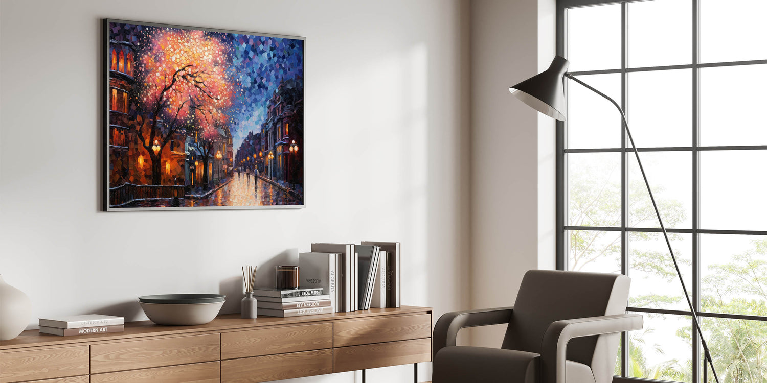 Illuminate your space with this Romantic Street Scene Art Print, capturing the mesmerizing beauty of a city night drenched in vibrant colors. This artwork showcases a dreamy cityscape, where warm street lights and a cascade of pink and orange hues blend seamlessly with the cool blues of the night sky. The intricate mosaic-like details add a touch of modern artistry, making this piece a stunning focal point in any room.