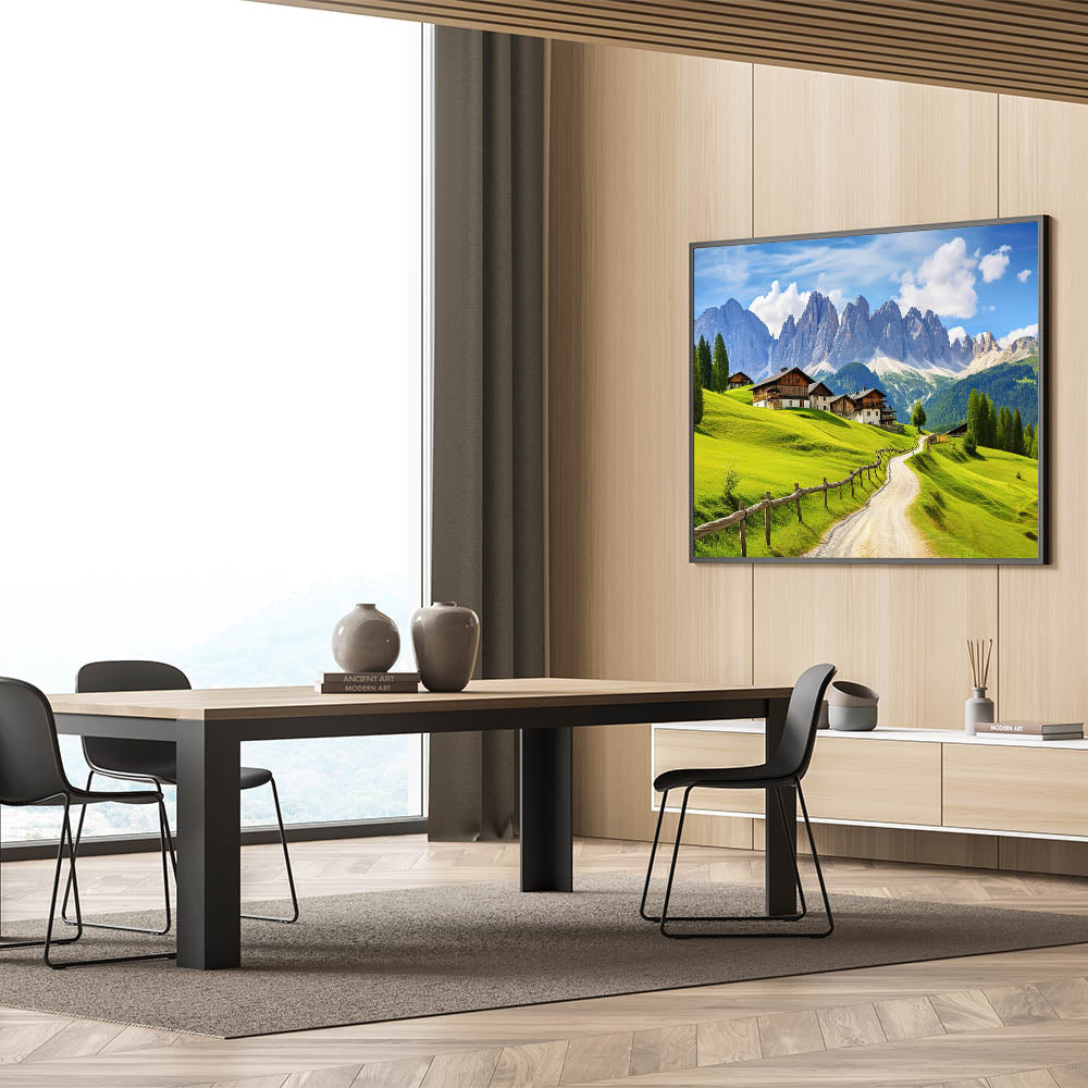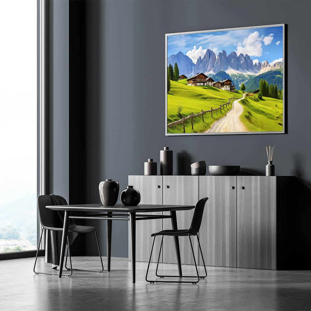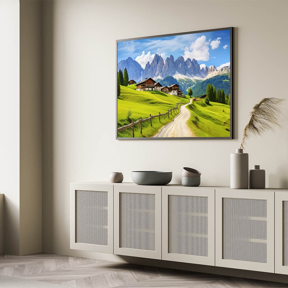 - Vivid Colors: The lush green fields, clear blue sky, and detailed mountain scenery make this artwork a striking addition to any room.