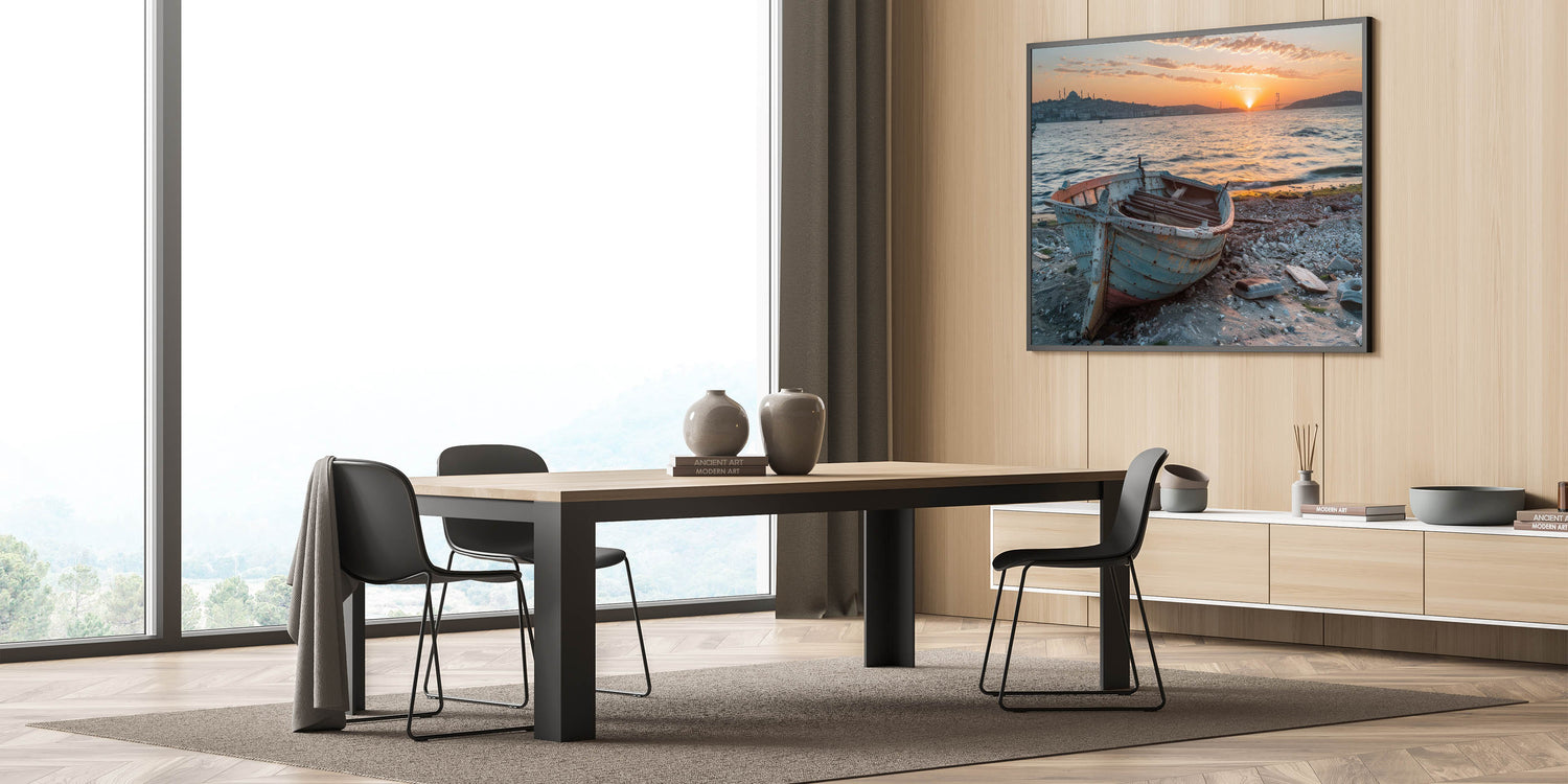 Capture the essence of a coastal journey with this stunning rowboat wall art. This piece features a weathered rowboat resting on a sandy shore, with the backdrop of rolling hills and a vast, tranquil ocean. The rustic texture of the boat, combined with the serene blue sky and distant mountains, evokes a sense of adventure and nostalgia. Perfect for those who love the sea or nautical-themed decor, this handcrafted boat art is available in various high-quality materials, including Stretched Canvas, Framed Canvas, Acrylic Glass, Framed Acrylic Glass, Framed Print, Rolled Canvas, and Rolled Print.