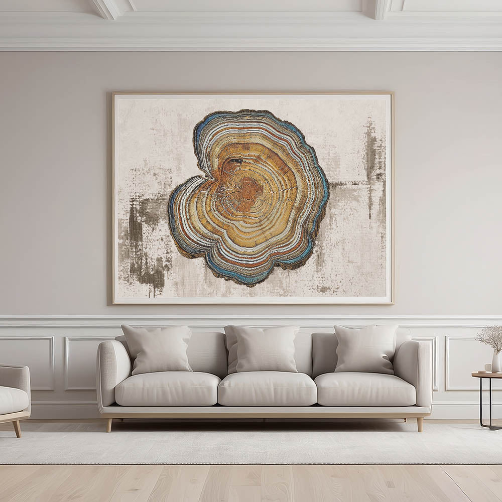 Introduce the beauty of nature's timeless patterns into your living space with this captivating "Rustic Tree Slice Strokes & Lines" abstract wall art. This artwork showcases the intricate rings of a tree slice, rendered in warm, earthy tones, and accented with modern strokes that highlight the natural texture and grain. The combination of rich browns, soft blues, and warm golds creates a visually appealing contrast, making this piece a perfect addition to any room with a rustic or contemporary theme.
