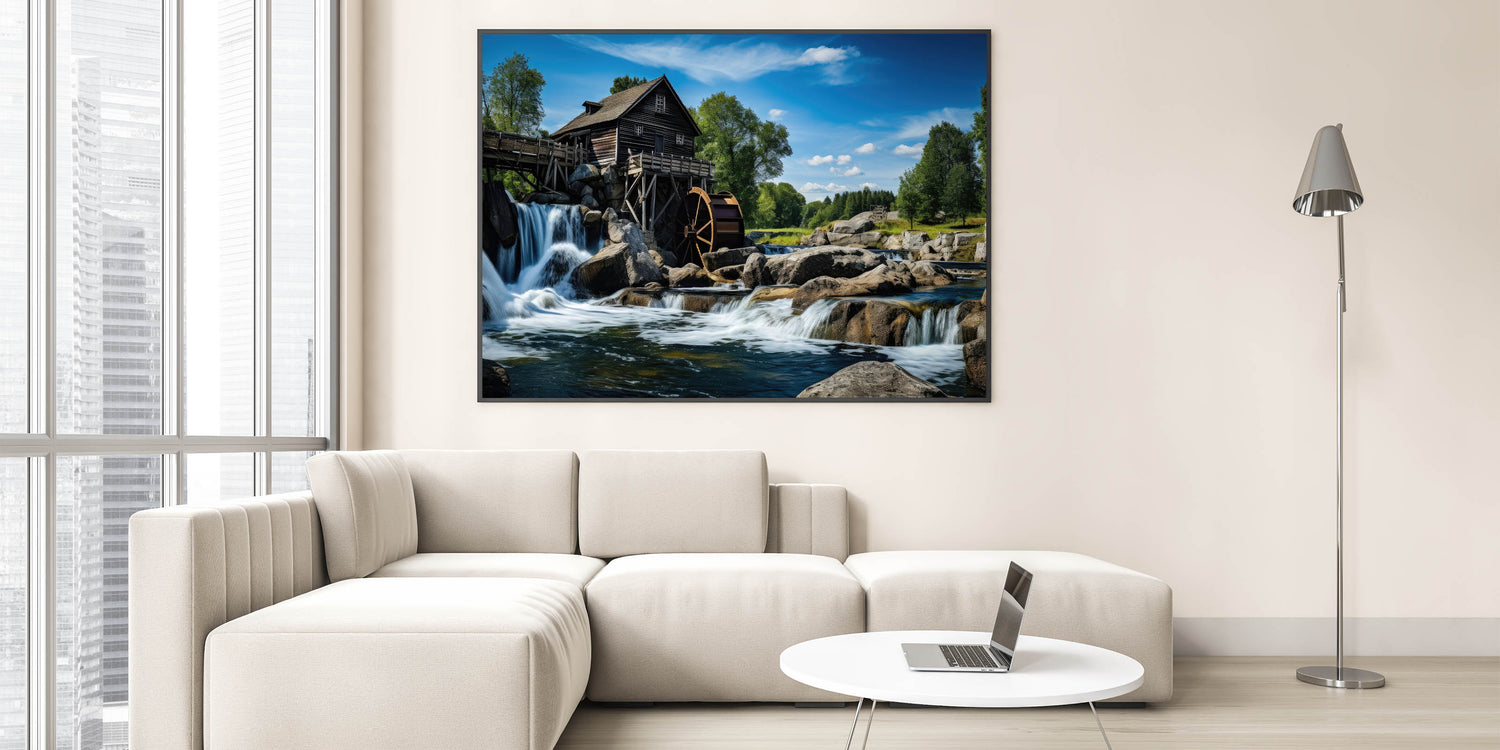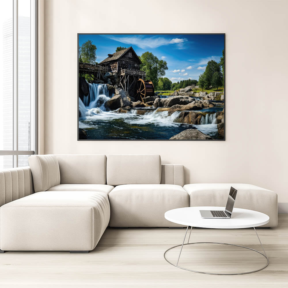 Elevate your space with the majestic beauty of this rustic watermill canvas print. The artwork features a stunning watermill perched above a cascading waterfall, set against the backdrop of a clear blue sky and lush greenery. The powerful flow of the water and the rugged rocks surrounding the mill create a dramatic and serene scene, perfect for adding a touch of natural grandeur to any room.