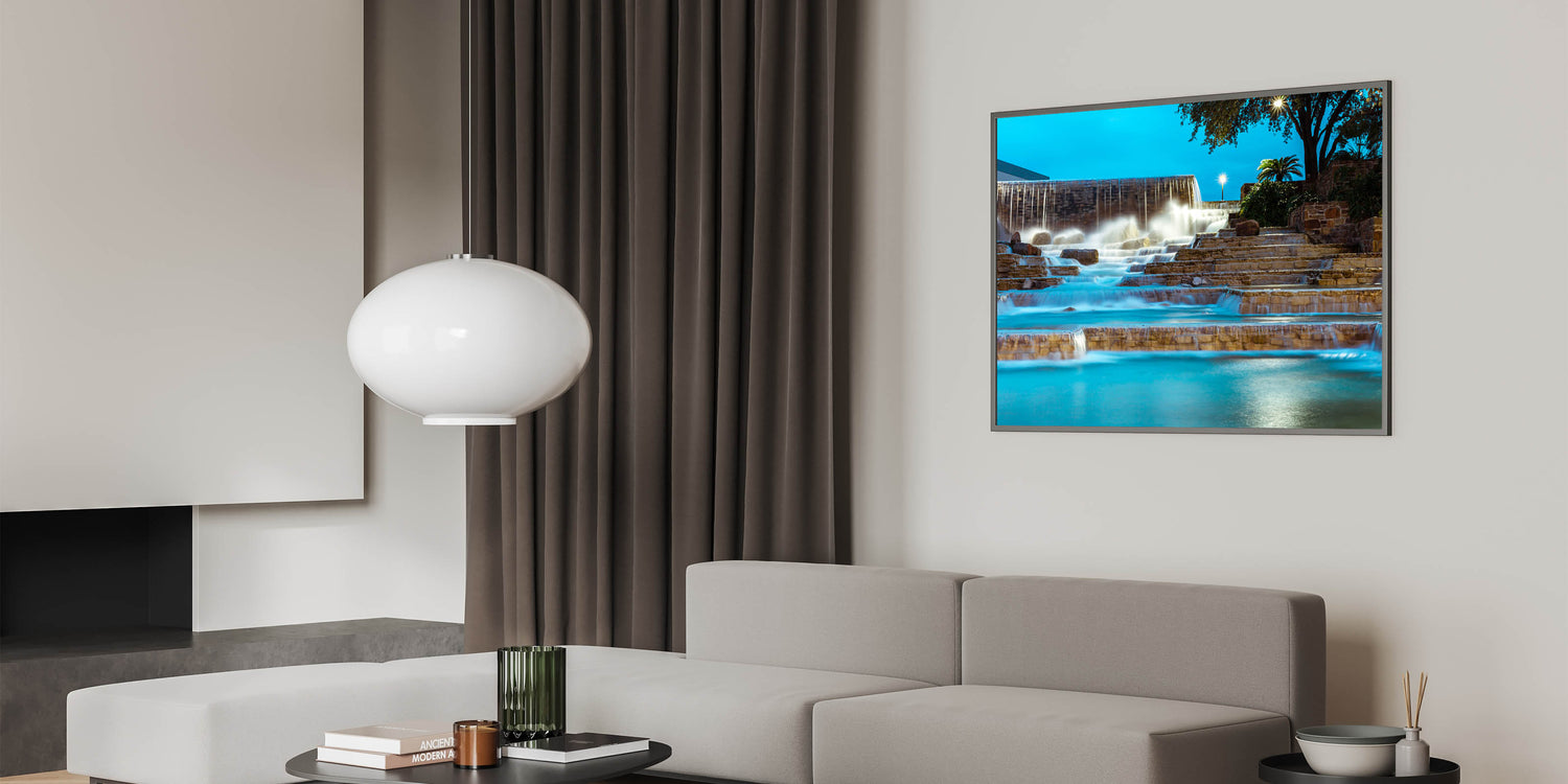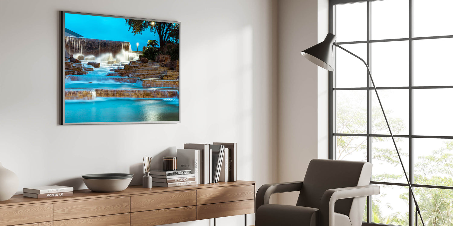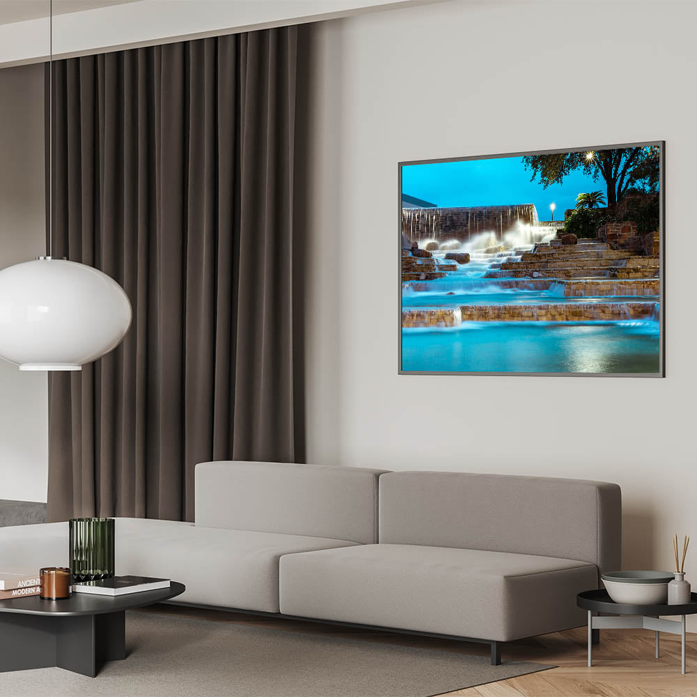 This premium Riverwalk canvas print is a must-have for anyone who loves the fusion of nature and cityscape. The beautiful cascade of water and the surrounding natural landscape make this piece a perfect addition to any Texas-inspired decor.
