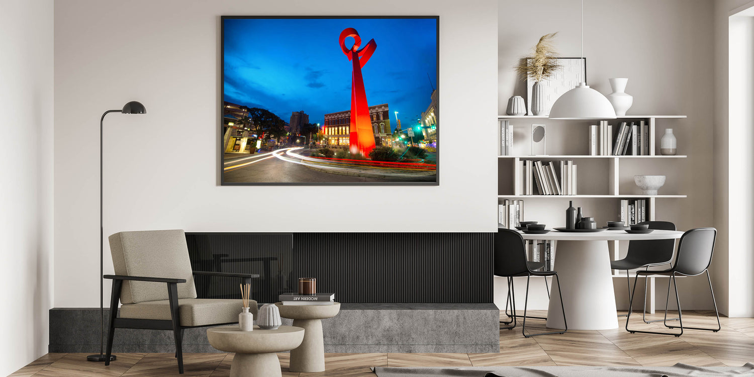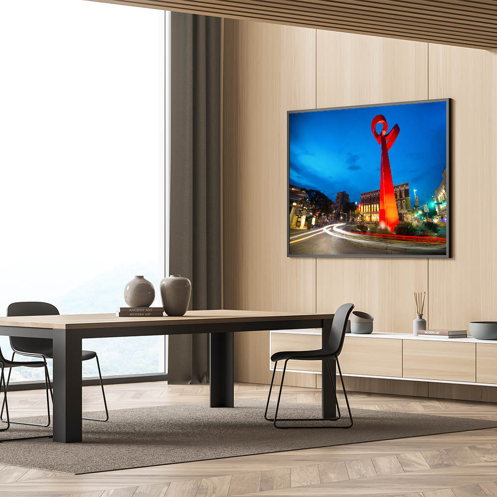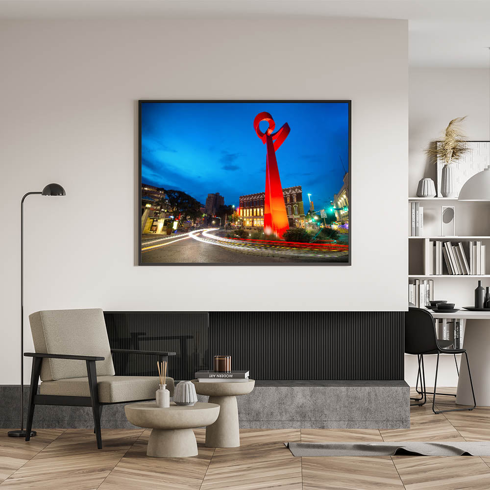 Celebrate the vibrant spirit of San Antonio with this stunning wall art featuring the iconic Torch of Friendship sculpture. Set against the deep blue of the evening sky, the vivid red sculpture stands out as a symbol of unity and friendship. This captivating artwork is perfect for anyone who loves modern architecture and the unique landmarks of Texas. Available in various formats, including stretched canvas, framed canvas, and acrylic glass, this piece will bring color and energy to any space.