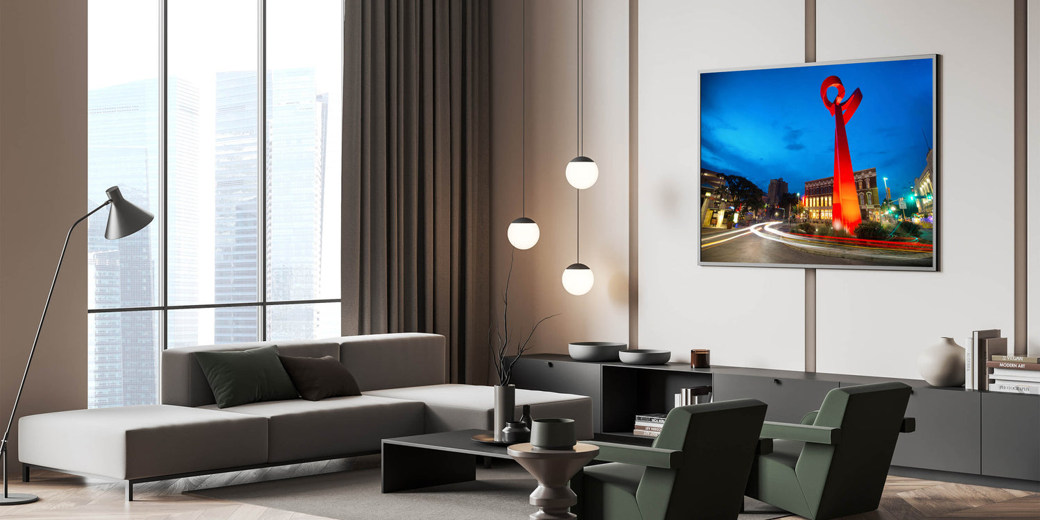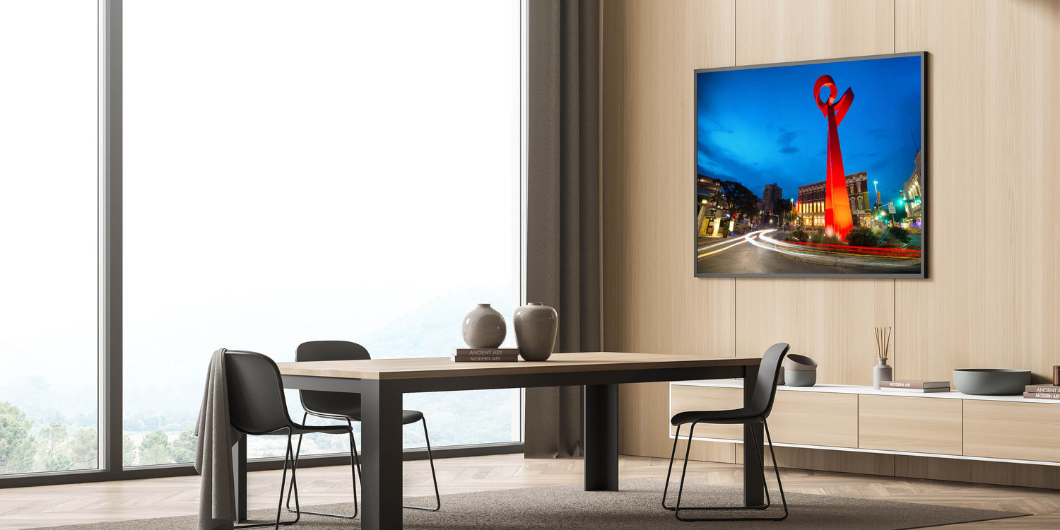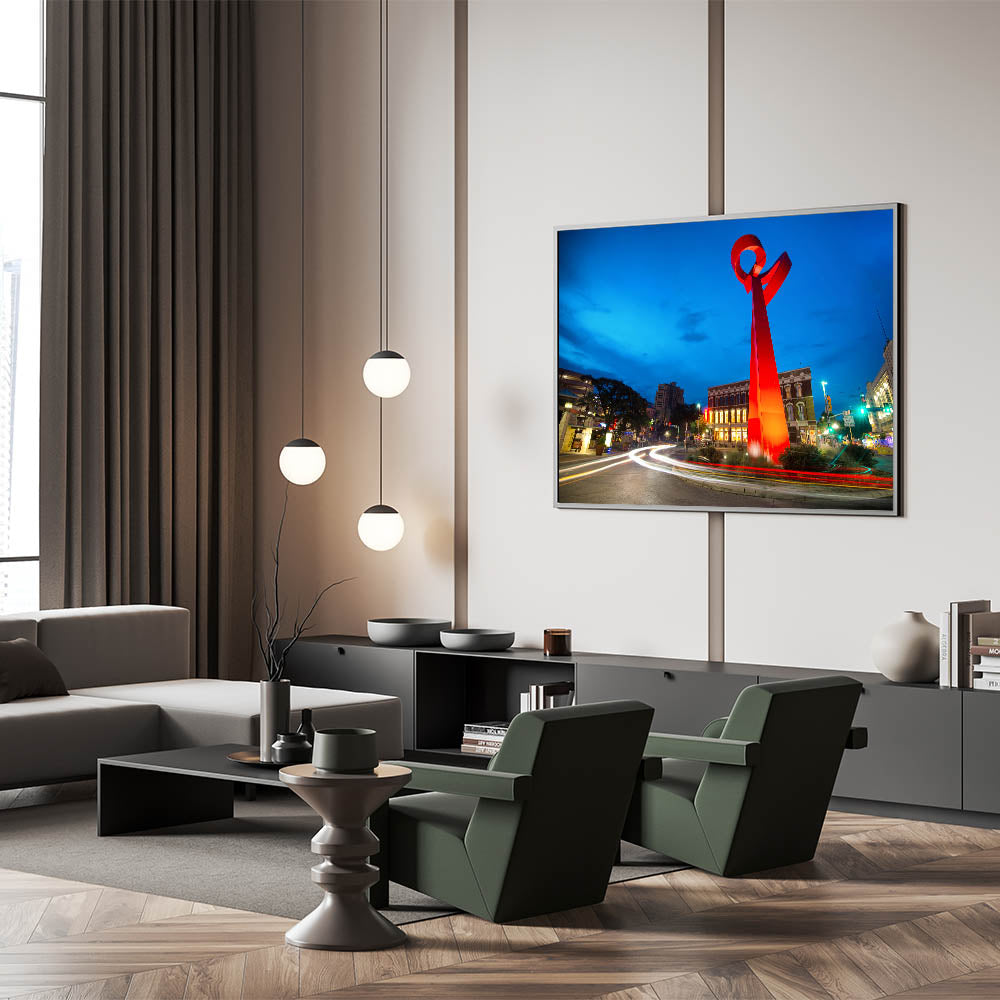 Celebrate the vibrant spirit of San Antonio with this stunning wall art featuring the iconic Torch of Friendship sculpture. Set against the deep blue of the evening sky, the vivid red sculpture stands out as a symbol of unity and friendship. This captivating artwork is perfect for anyone who loves modern architecture and the unique landmarks of Texas. Available in various formats, including stretched canvas, framed canvas, and acrylic glass, this piece will bring color and energy to any space.