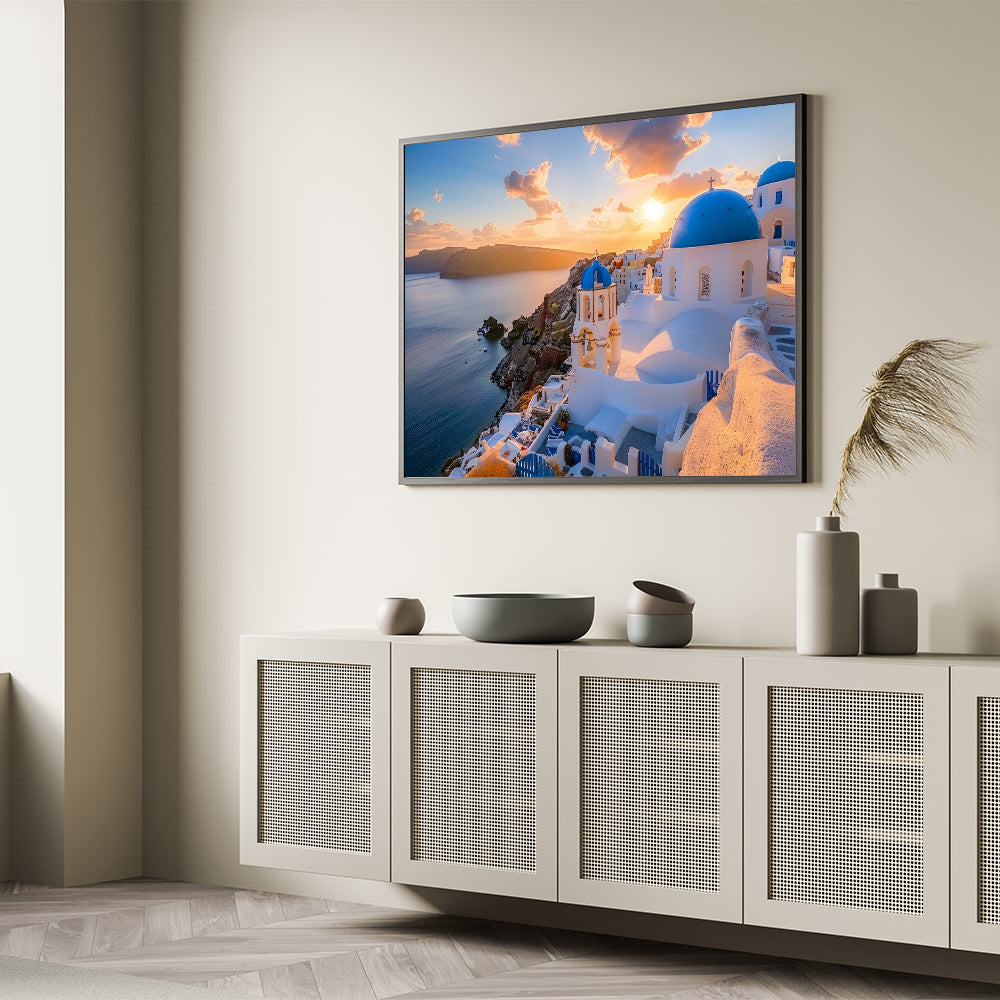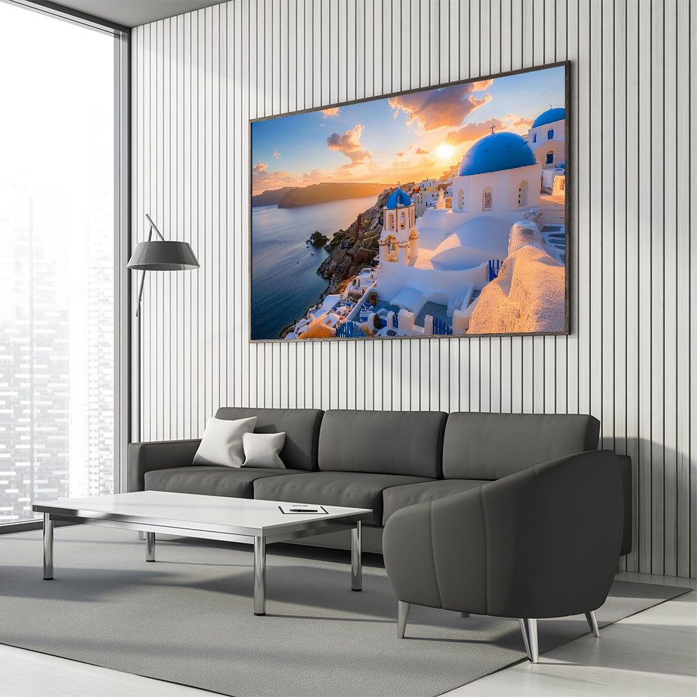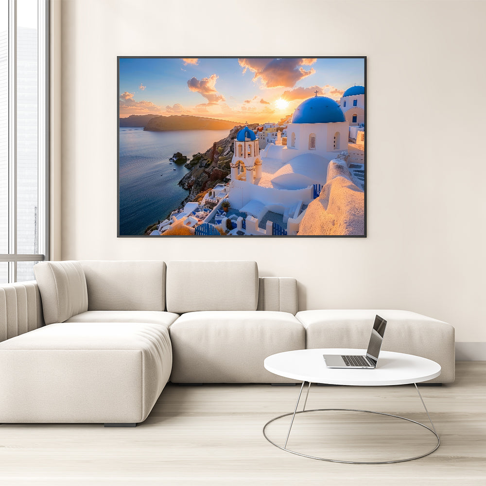 This piece is perfect for anyone who appreciates coastal scenes, Mediterranean architecture, or simply desires a touch of elegance and peace in their living space. Whether displayed in your living room, bedroom, or office, this Santorini wall art will transport you to the tranquil shores of the Aegean Sea every time you glance at it.