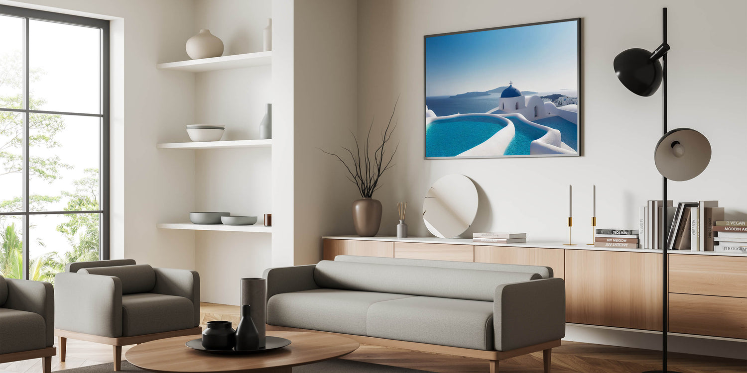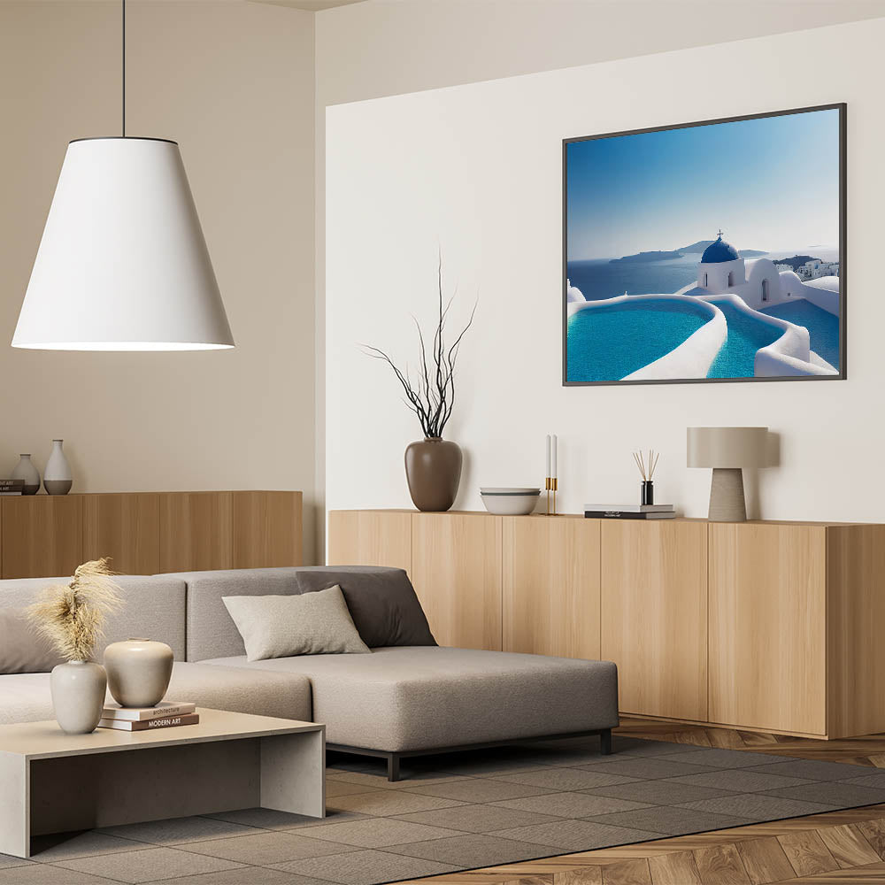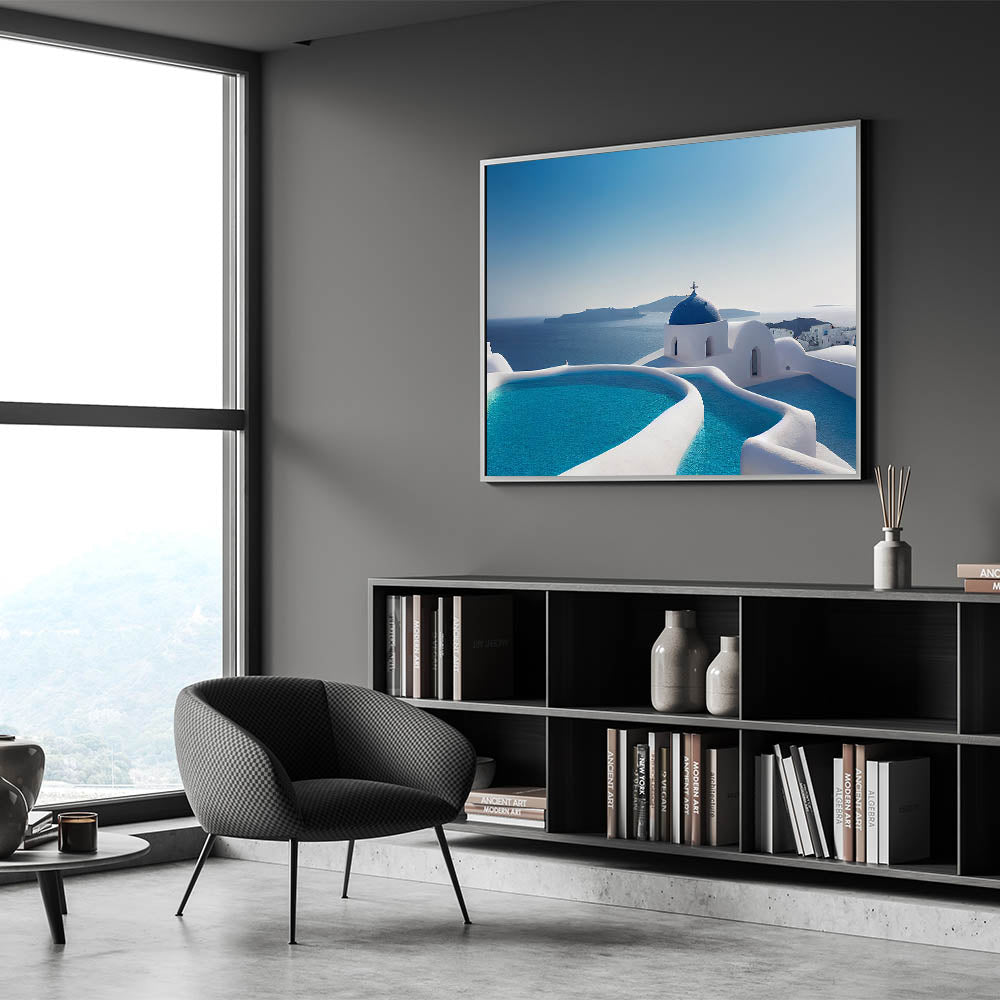 Capture the serene beauty of Santorini with this stunning wall art featuring the iconic whitewashed buildings and deep blue domes set against the sparkling Aegean Sea. This tranquil piece highlights the picturesque views of one of Greece's most famous islands, making it the perfect addition to any space seeking a touch of Mediterranean charm.