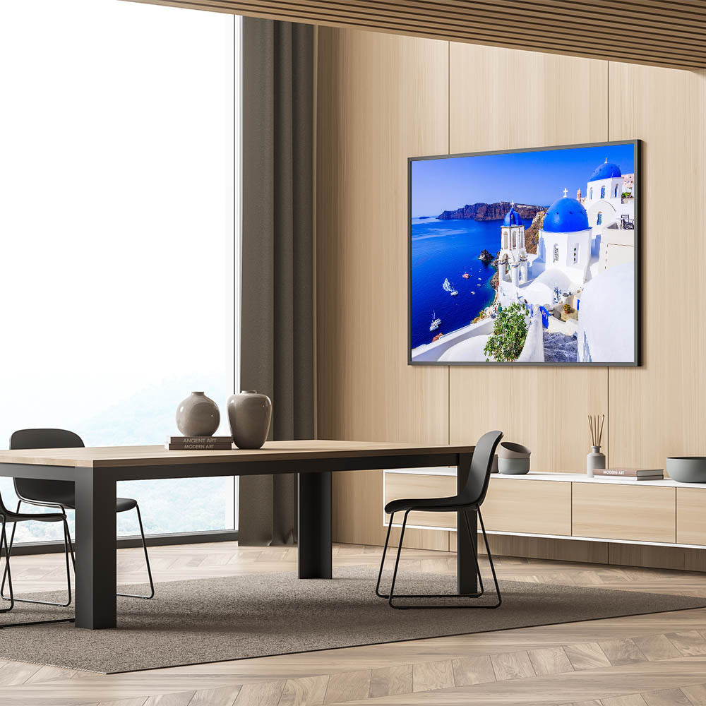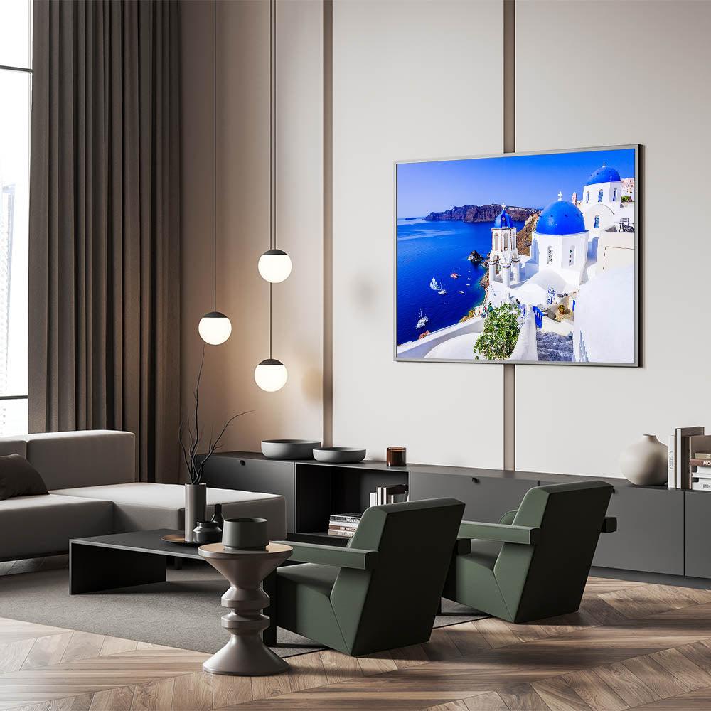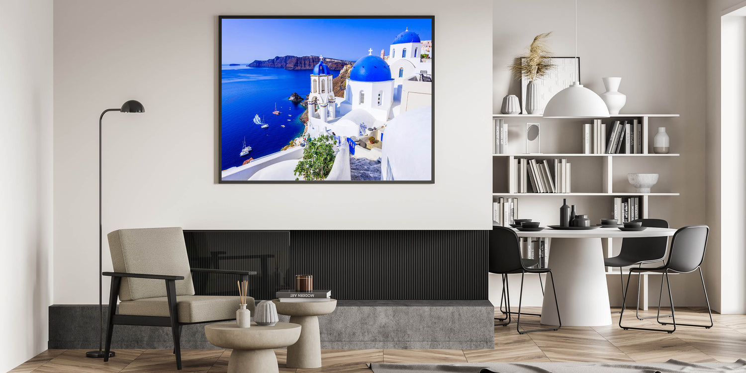 Bring the vibrant beauty of Santorini into your home with this stunning Santorini wall art. Featuring the island’s famous blue domes, whitewashed buildings, and the sparkling waters of the Aegean Sea, this Greece landscape art captures the essence of the Greek islands. The deep blues of the sea and sky contrast beautifully with the crisp white architecture, making this piece perfect for adding a touch of Greek island decor to any space.