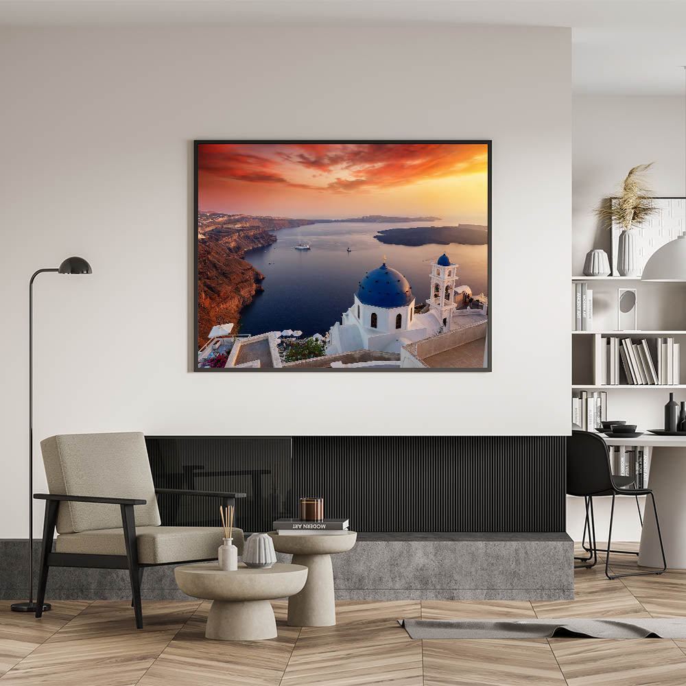 Immerse yourself in the breathtaking beauty of a Santorini sunset with this stunning Santorini wall art. The fiery hues of the sky perfectly complement the calm waters of the Aegean Sea, creating a dramatic contrast with the island’s iconic blue-domed church. This Greece landscape art captures the serene essence of Santorini scenery, making it the perfect addition to any room seeking a tranquil yet vibrant atmosphere.