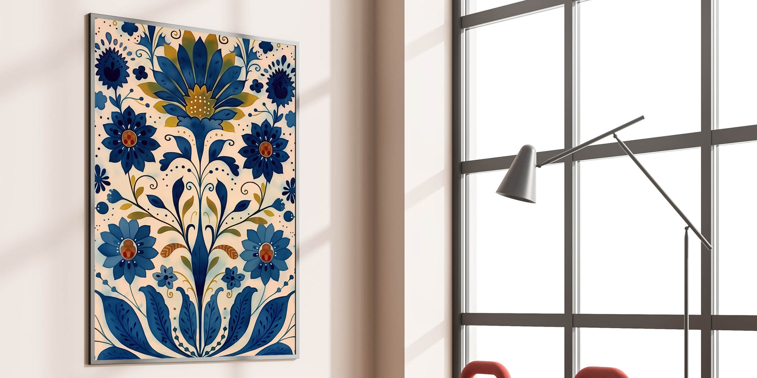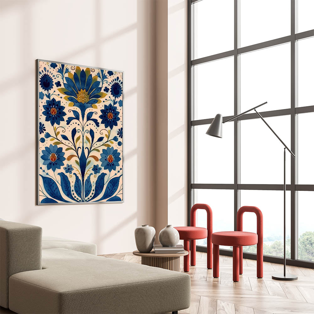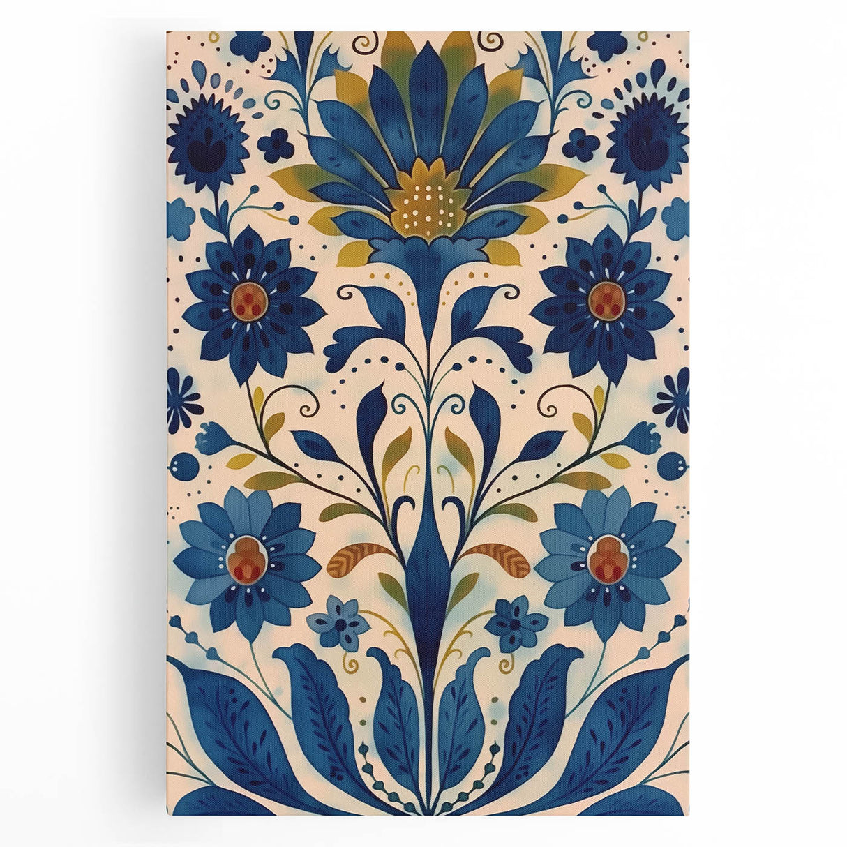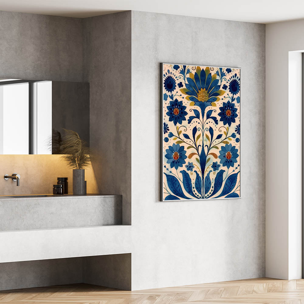 Transform your space with this beautiful Scandinavian wall art, featuring an intricate blue and gold floral design. The Nordic-inspired artwork showcases detailed floral patterns that blend deep blue hues with golden accents, creating a sophisticated and elegant look. The rich colors and delicate design embody the essence of Scandinavian decor, perfect for bringing a calming and inviting atmosphere into any room.