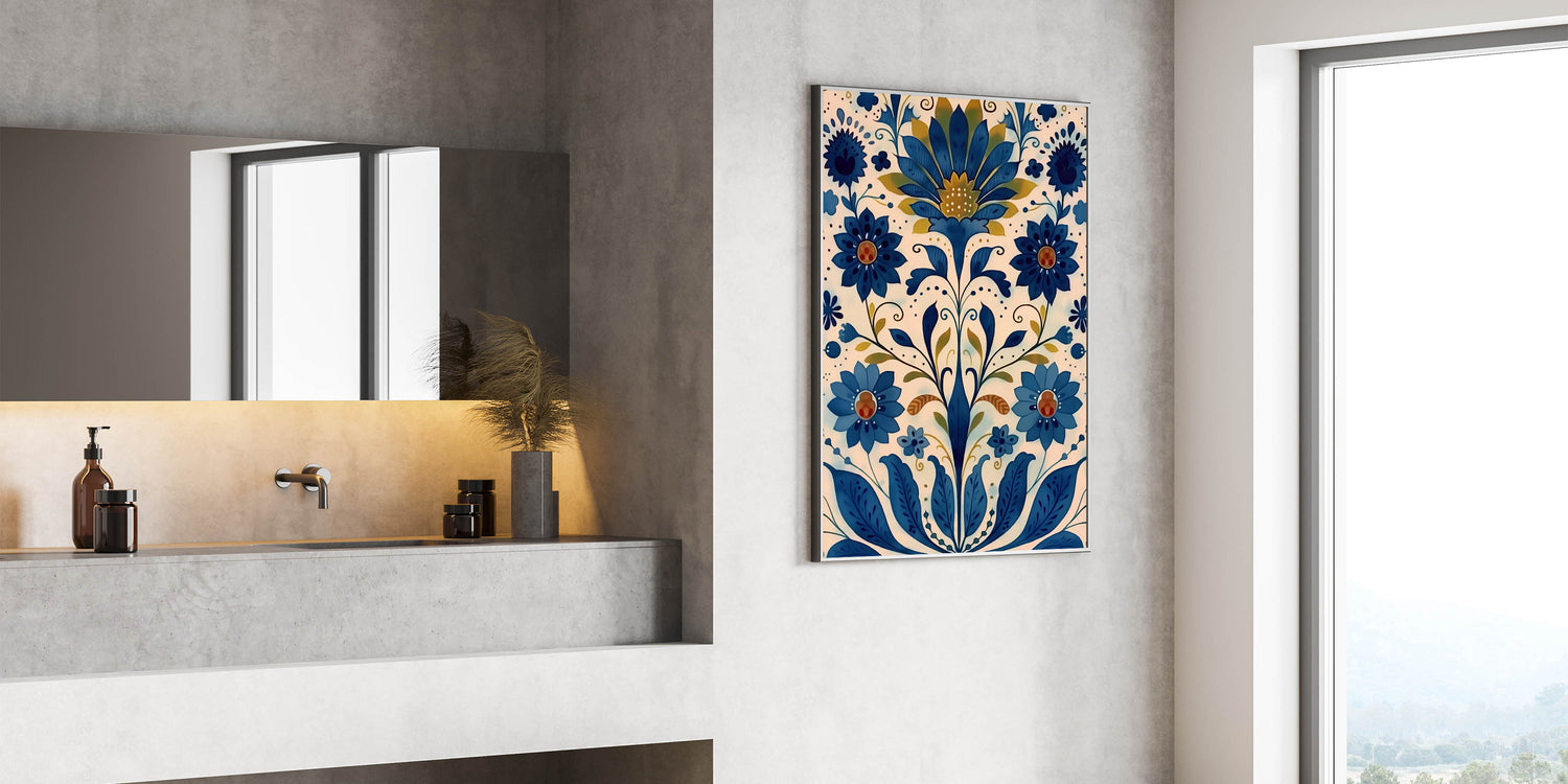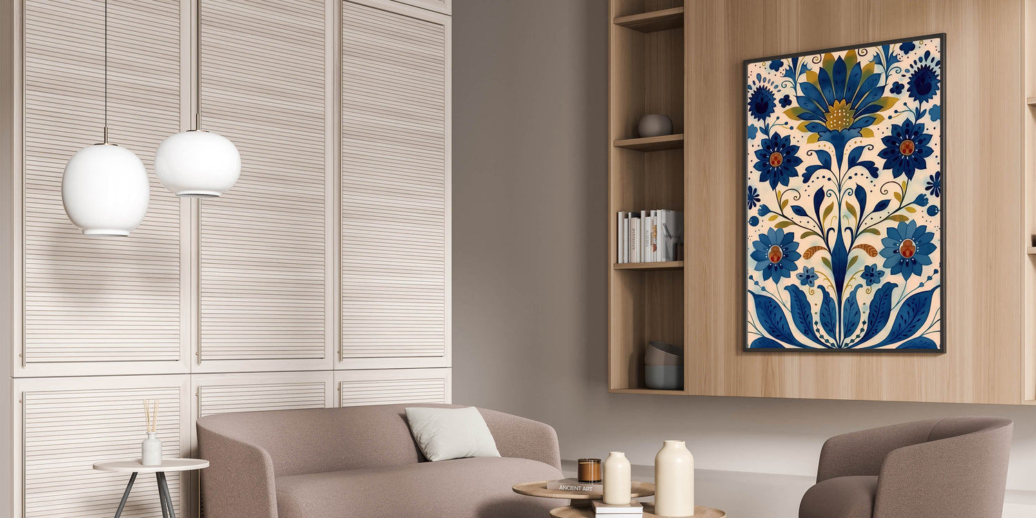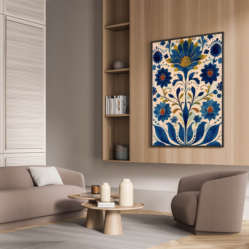Transform your space with this beautiful Scandinavian wall art, featuring an intricate blue and gold floral design. The Nordic-inspired artwork showcases detailed floral patterns that blend deep blue hues with golden accents, creating a sophisticated and elegant look. The rich colors and delicate design embody the essence of Scandinavian decor, perfect for bringing a calming and inviting atmosphere into any room.