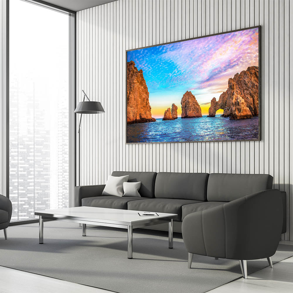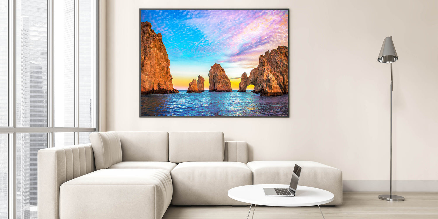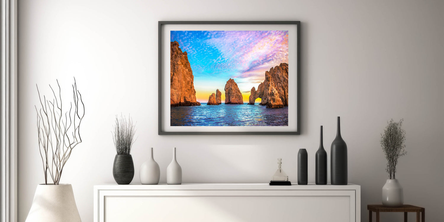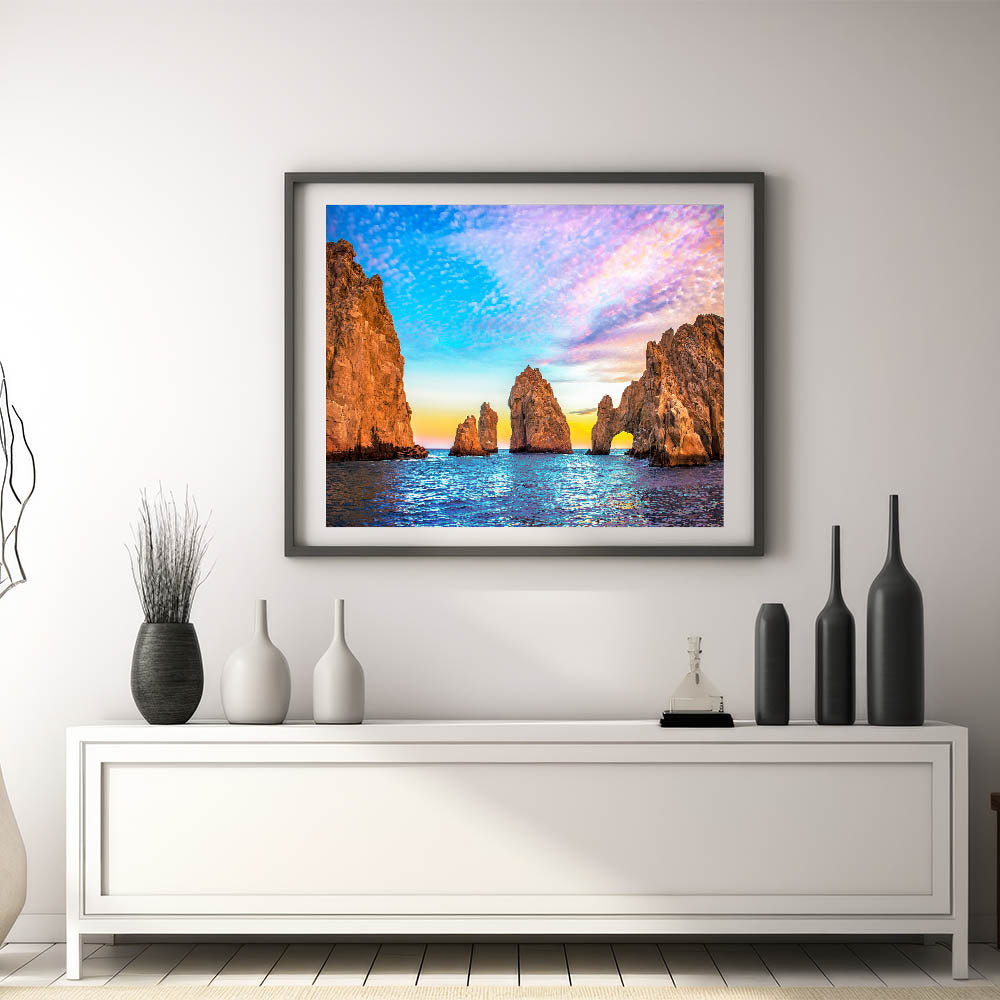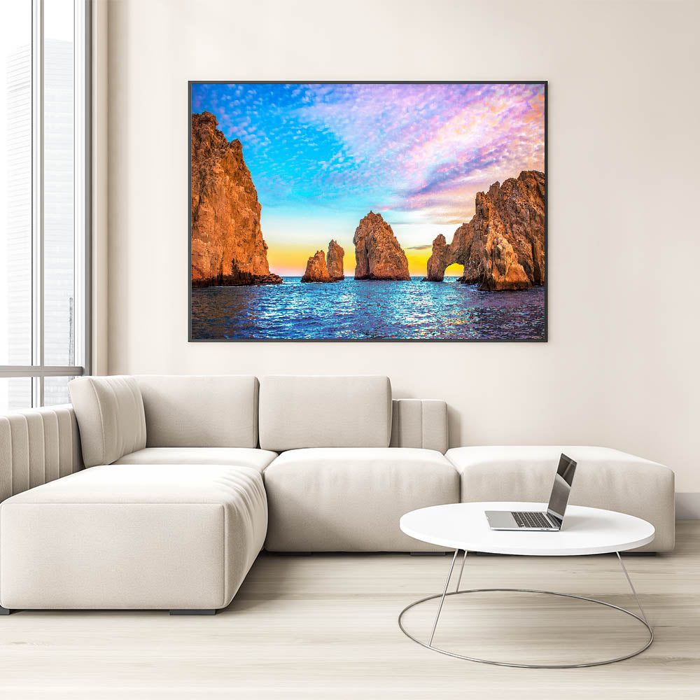 Bring the breathtaking beauty of Baja California into your space with this stunning wall art featuring the iconic rock formations of Mexico's Baja Peninsula. The vivid colors of the sunset and the serene ocean waves create a captivating coastal scene that embodies the natural wonders of this region.