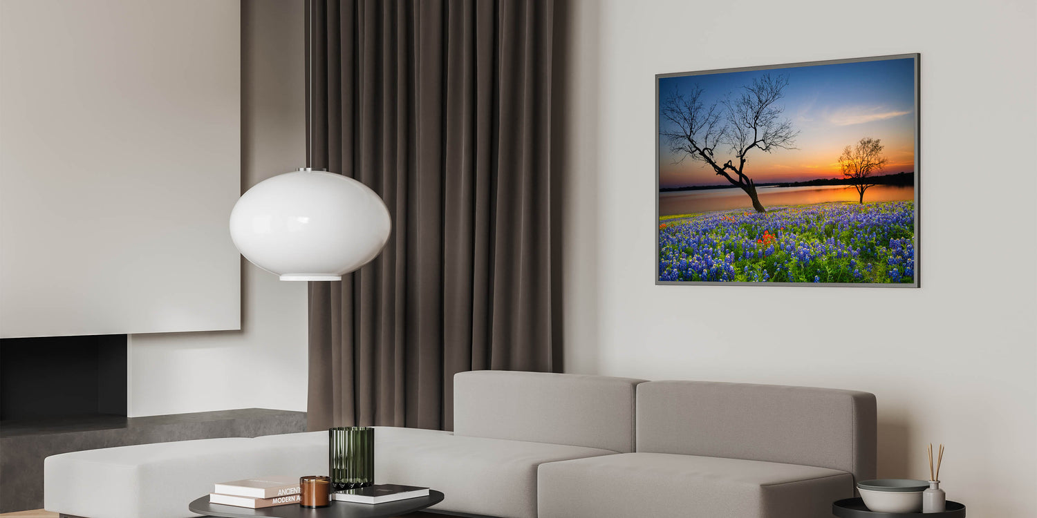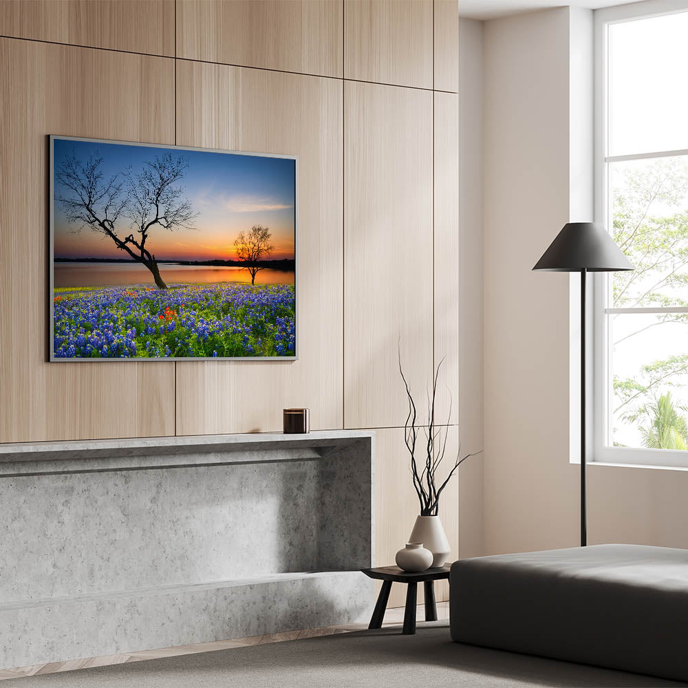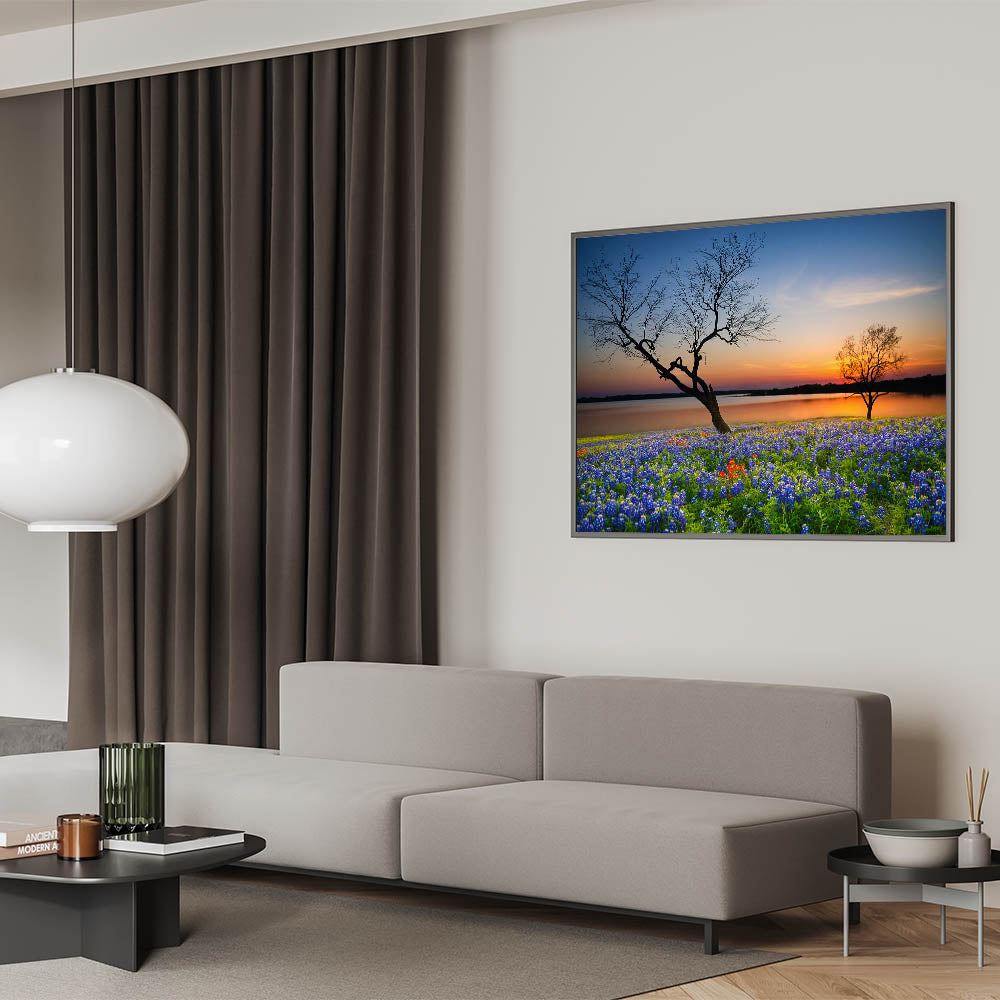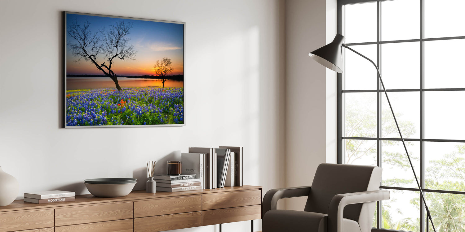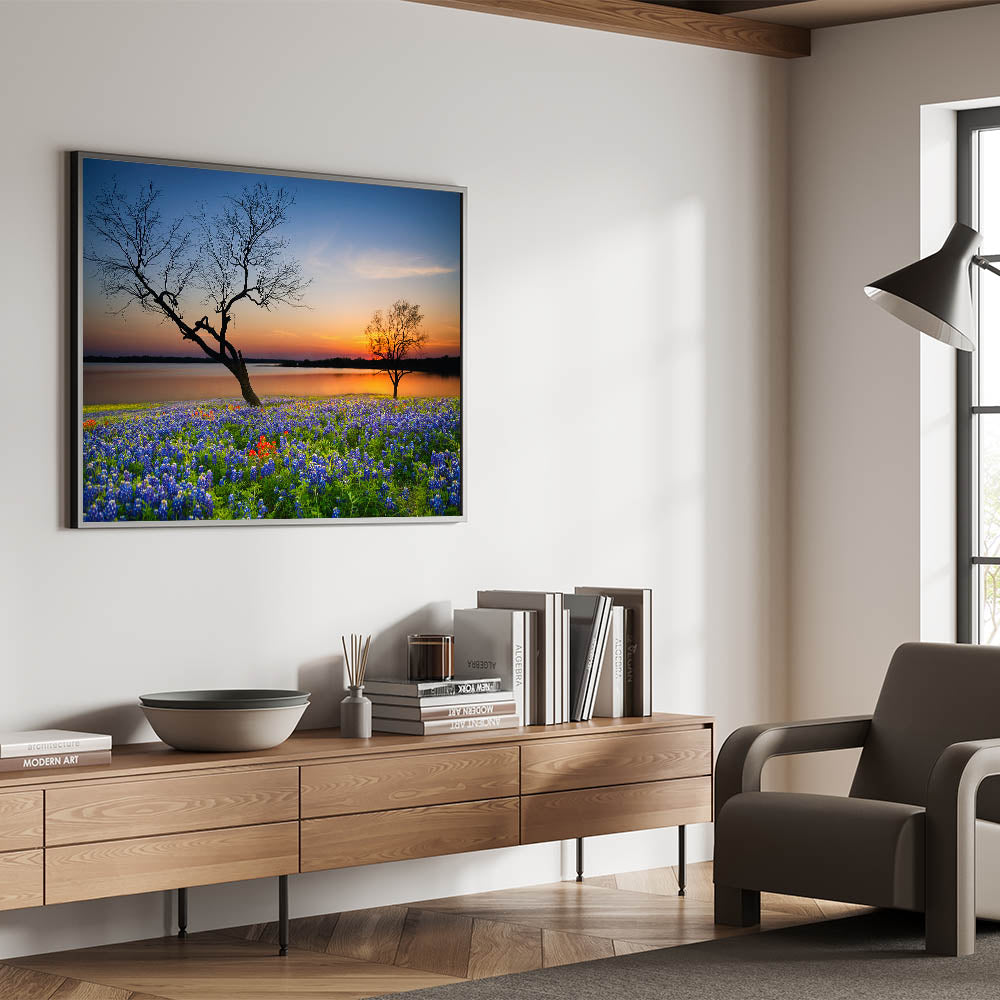 Bring the vibrant beauty of Texas wildflowers into your home with this stunning Bluebonnet field wall art. Featuring a breathtaking sunset over a serene lake and blooming Bluebonnets, this piece captures the essence of nature's tranquility. Perfect for lovers of scenic views and Texas wildflower art, this masterpiece transforms any space with its rich colors and peaceful ambiance.