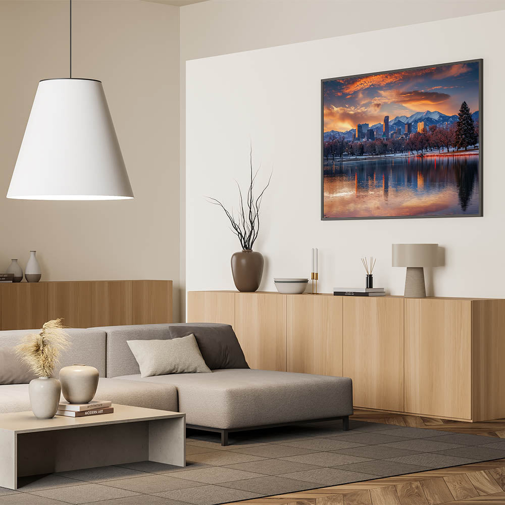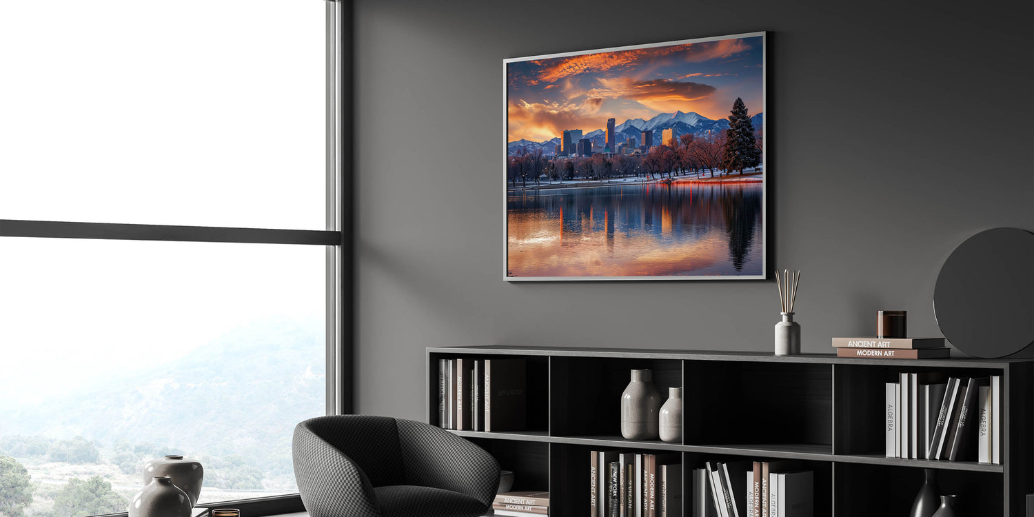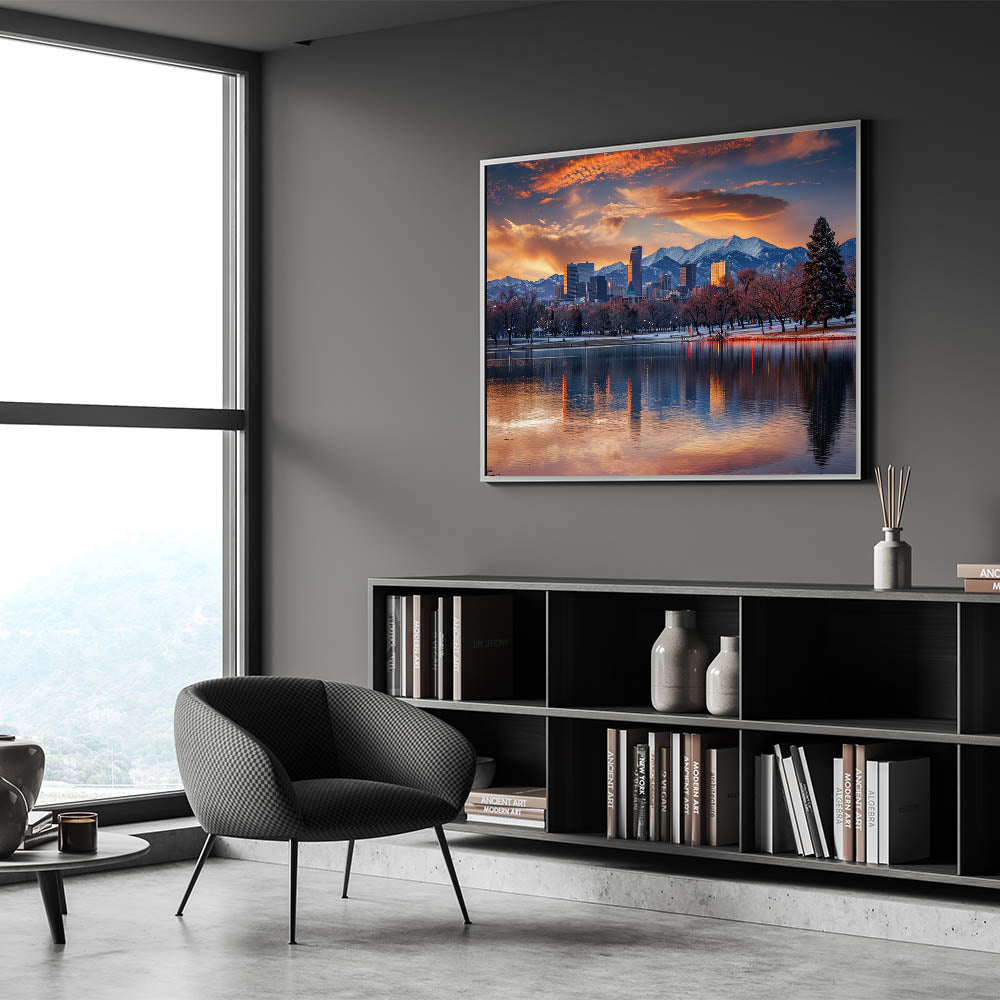 Experience the breathtaking beauty of Denver with this majestic skyline art, featuring the city set against the backdrop of the Rocky Mountains during a stunning sunset. This artwork captures the serene reflection of the cityscape on the water, blending the vibrant colors of the sky with the crisp outlines of Denver’s architecture. Ideal for adding a touch of natural beauty and urban sophistication to any room, this cityscape print is a perfect addition to your home or office decor.