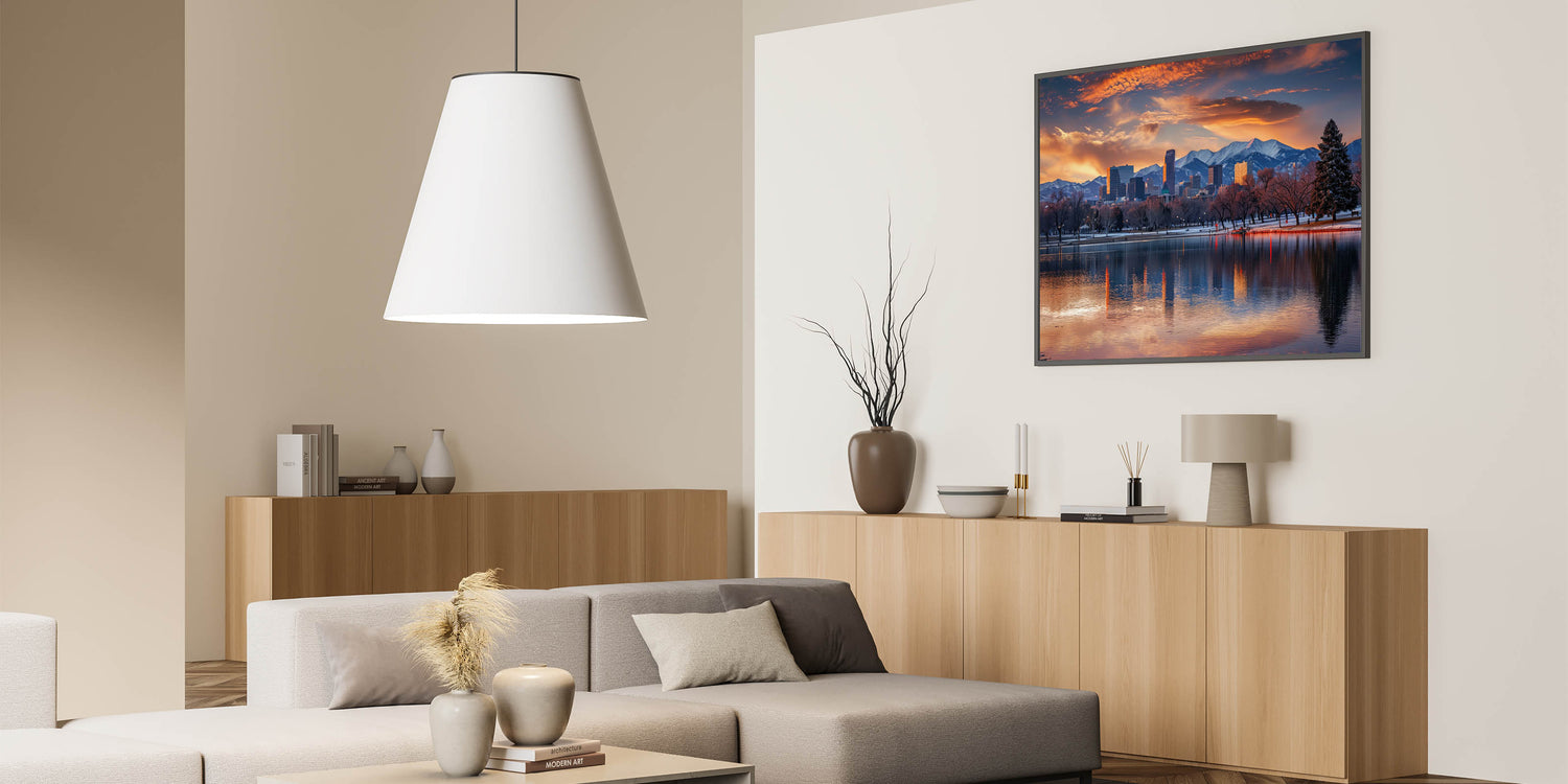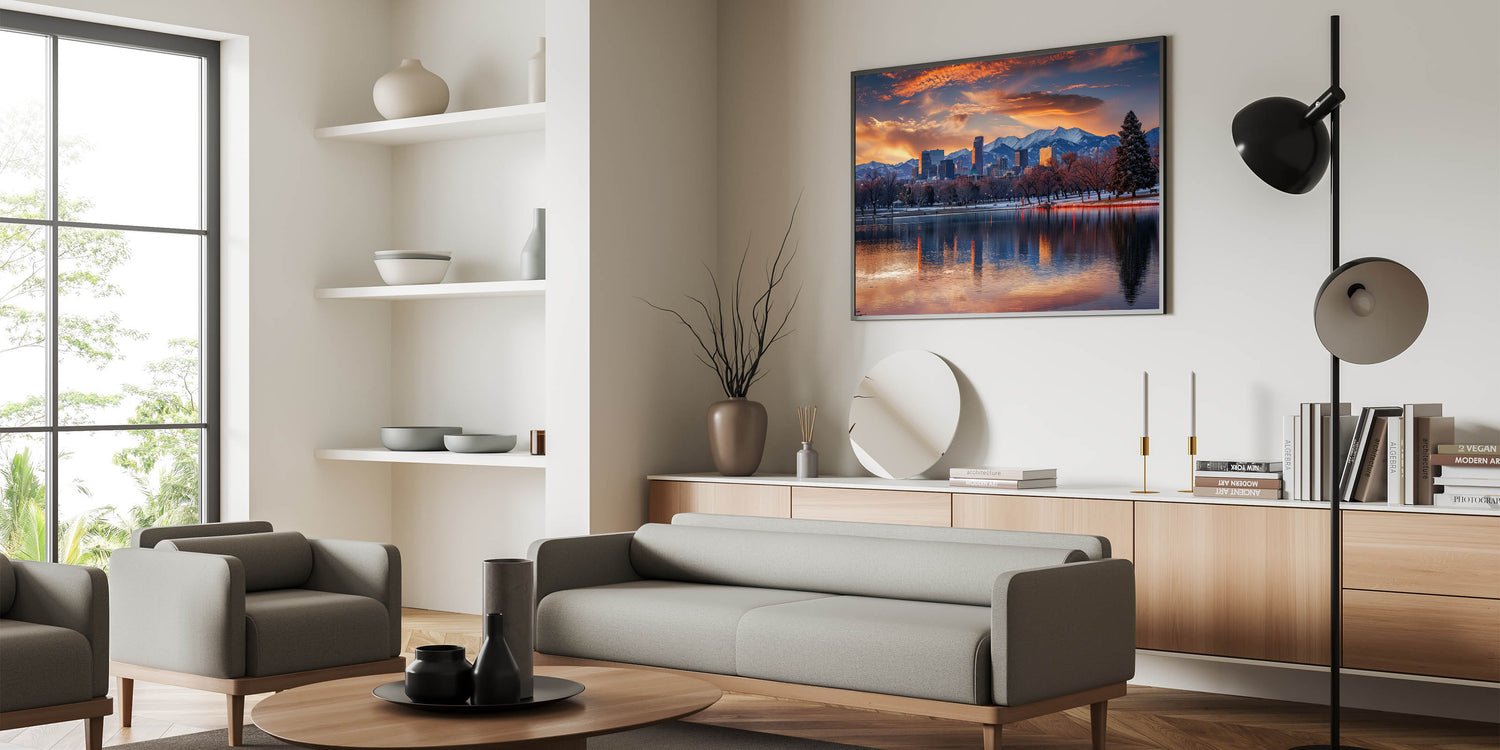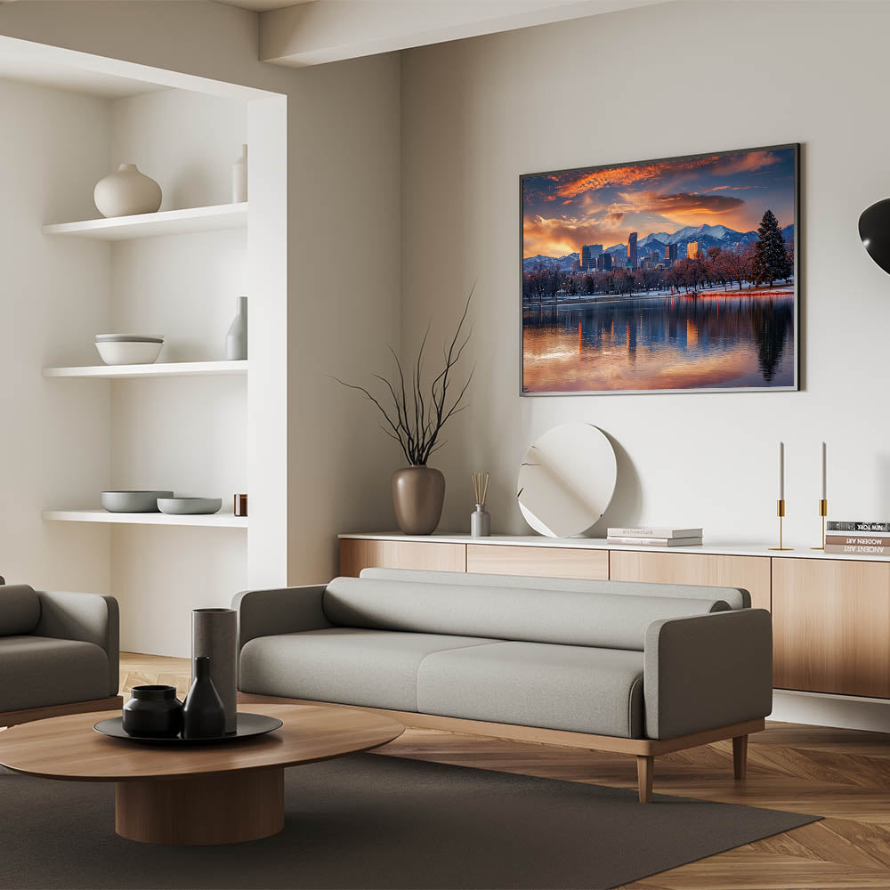 Experience the breathtaking beauty of Denver with this majestic skyline art, featuring the city set against the backdrop of the Rocky Mountains during a stunning sunset. This artwork captures the serene reflection of the cityscape on the water, blending the vibrant colors of the sky with the crisp outlines of Denver’s architecture. Ideal for adding a touch of natural beauty and urban sophistication to any room, this cityscape print is a perfect addition to your home or office decor.