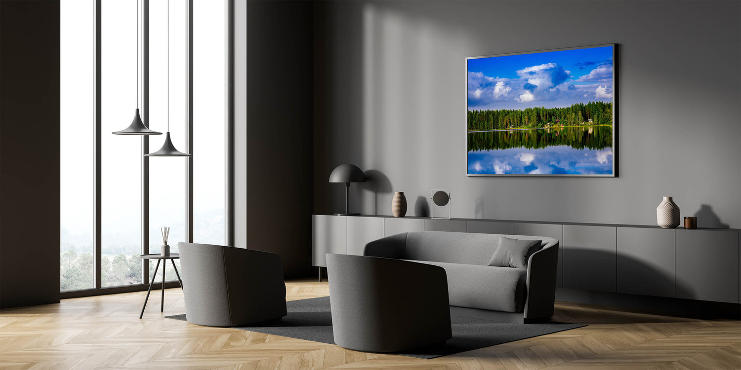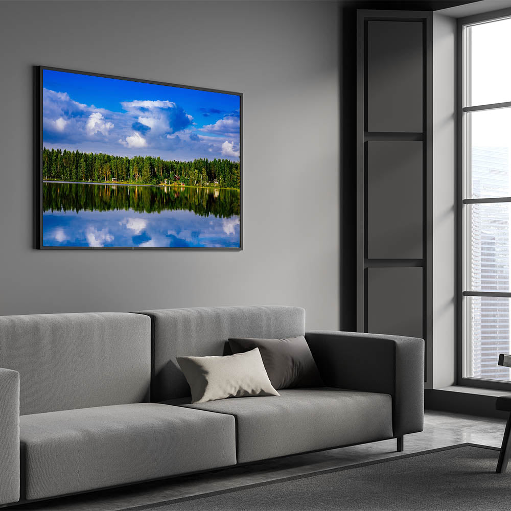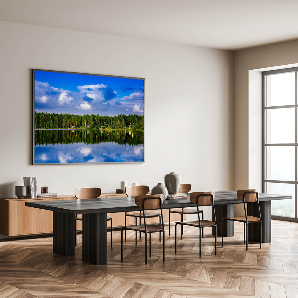 Bring the beauty of Finland’s untouched natural landscapes into your home or office with this serene piece of art. The reflection of the sky and trees on the water makes this artwork a calming and meditative addition to any decor.