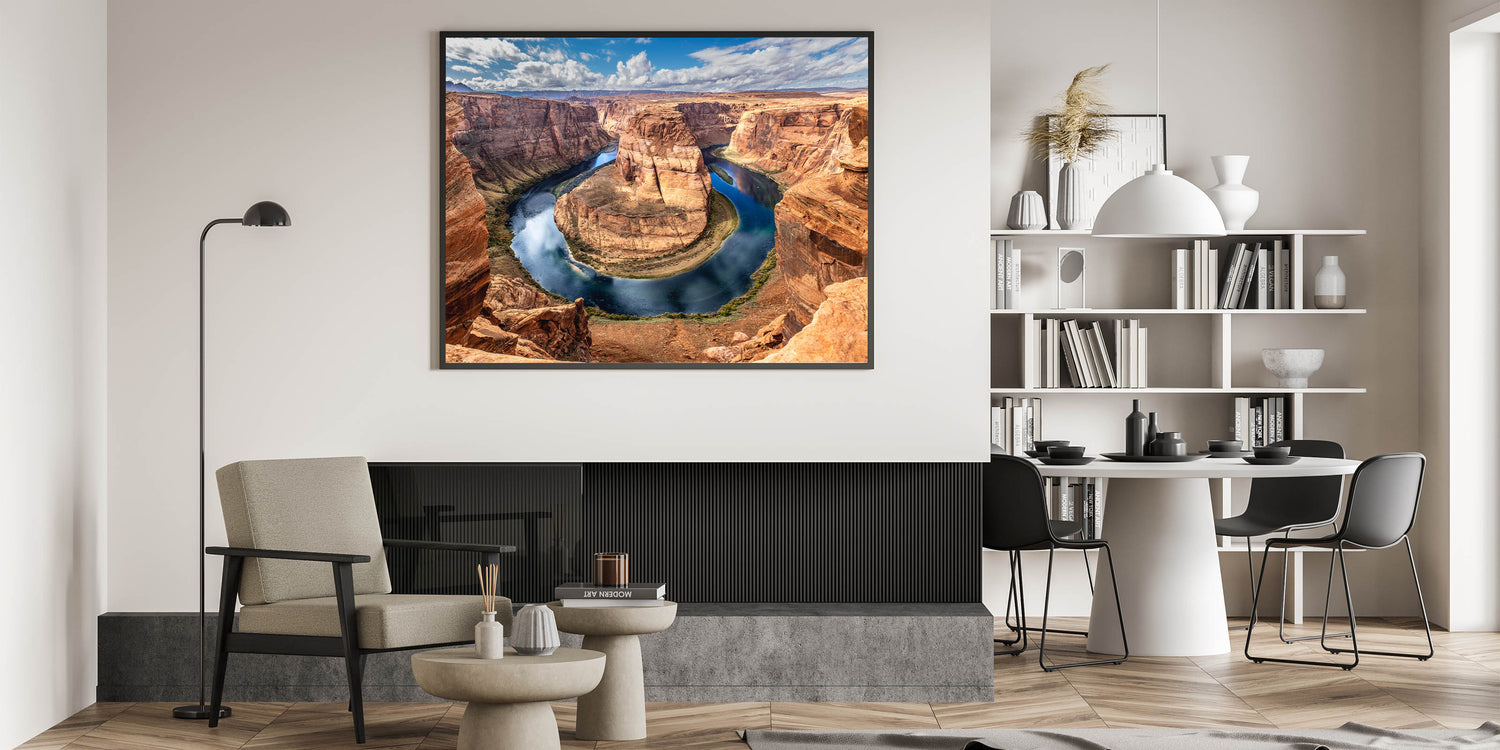 Transform your space with this awe-inspiring view of Glen Canyon, showcasing the dramatic curves of the Colorado River and the majestic Arizona desert landscape. This striking artwork captures the natural beauty of the Southwest with its towering canyon walls, vibrant sky, and rich earth tones. The blue of the river contrasts beautifully with the rugged, terracotta-hued rock formations, creating a breathtaking scene that adds depth and warmth to any room.