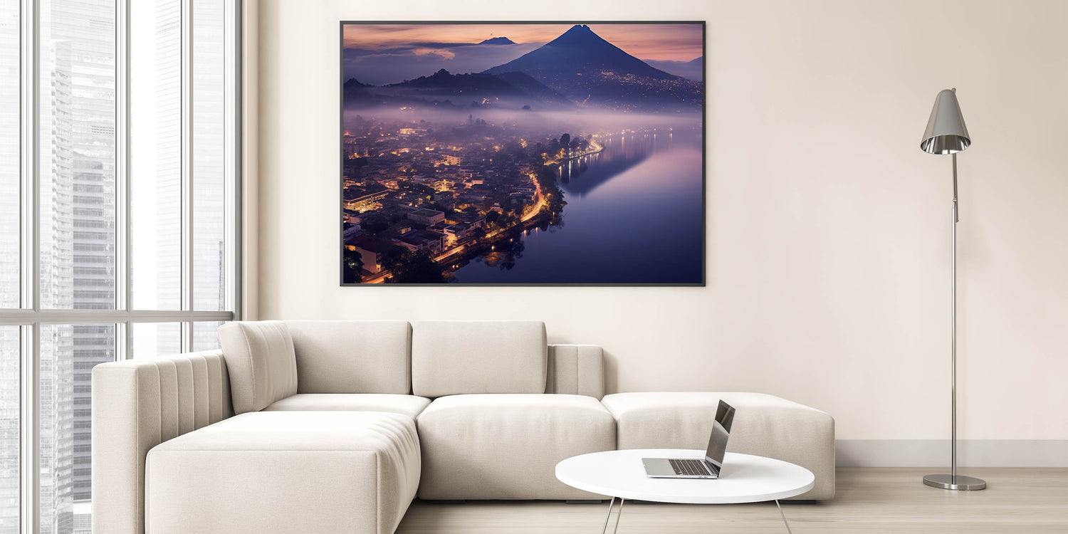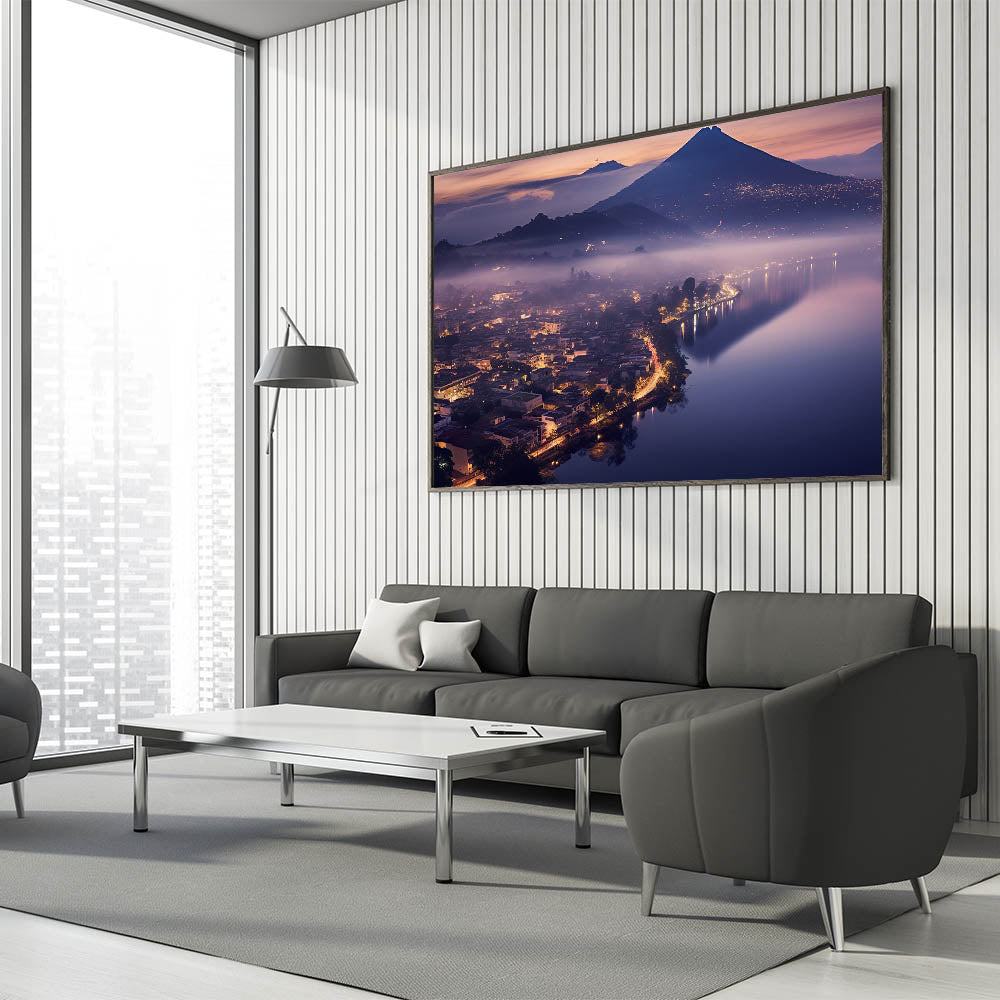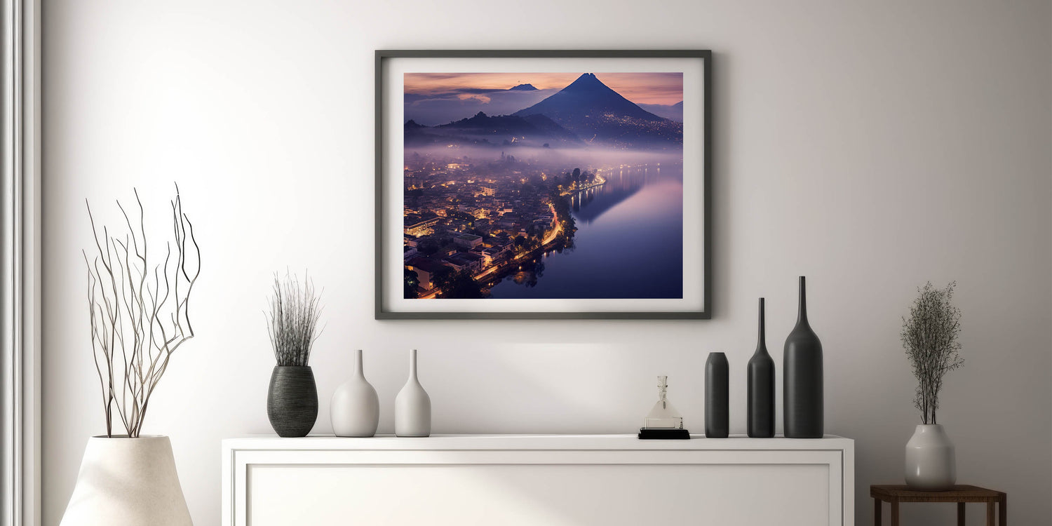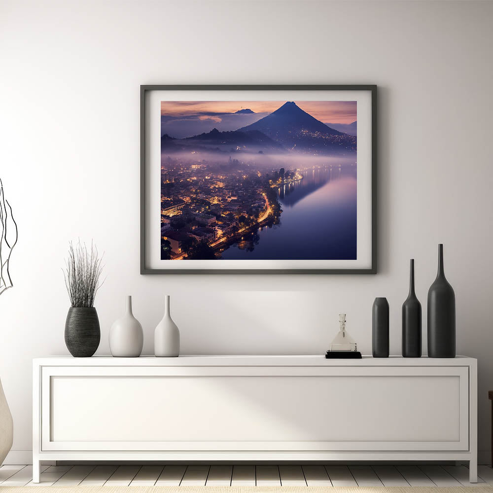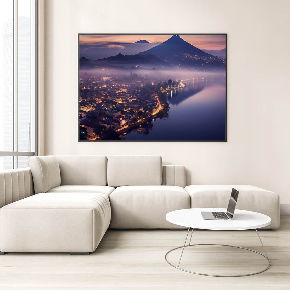 Experience the mystical allure of Guatemala at dusk with our "Misty Twilight Cityscape," a captivating piece from our Scenic Guatemala Canvas collection. This artwork features a panoramic view of a Guatemalan city as it is gently enveloped by twilight mists, with glowing lights scattered across the mountainside and the serene lake reflecting the fading light.
