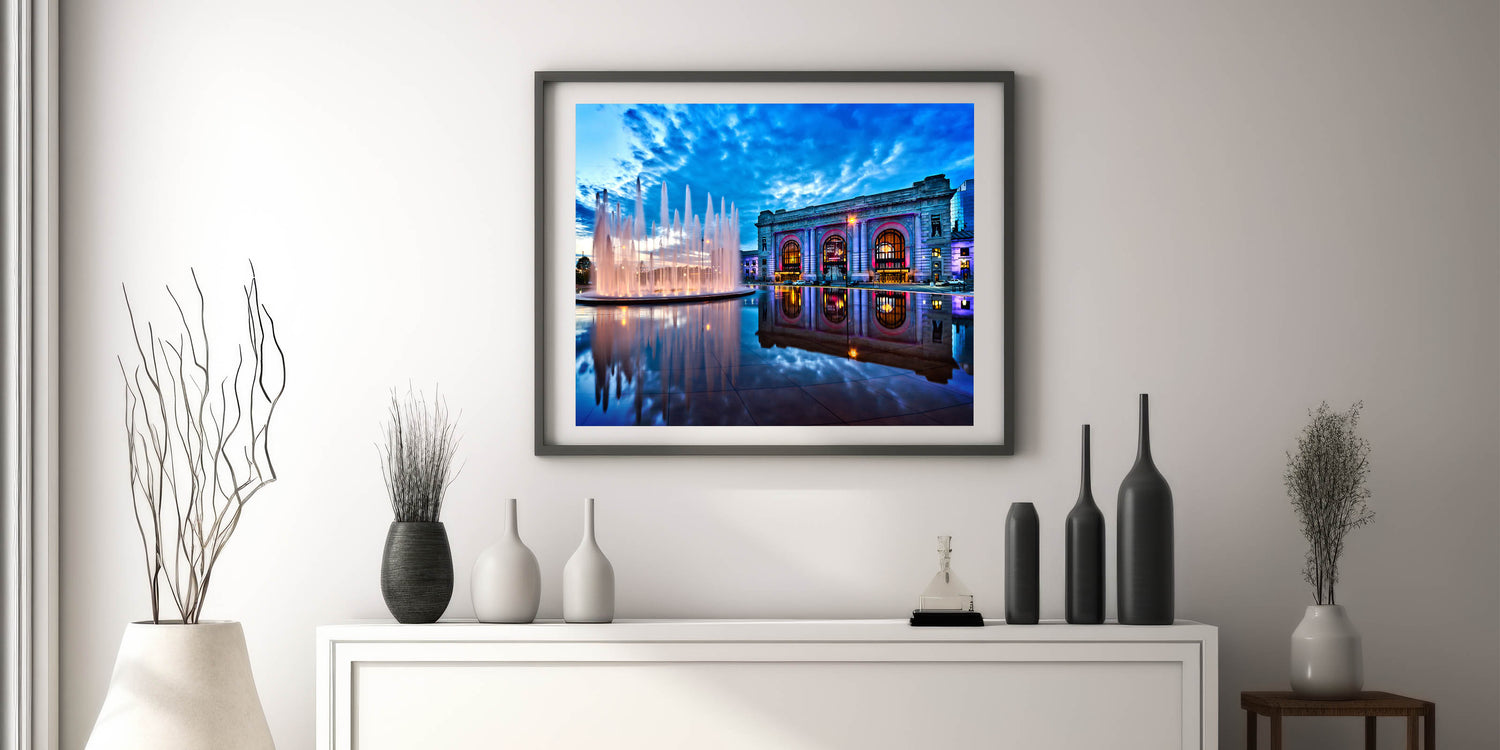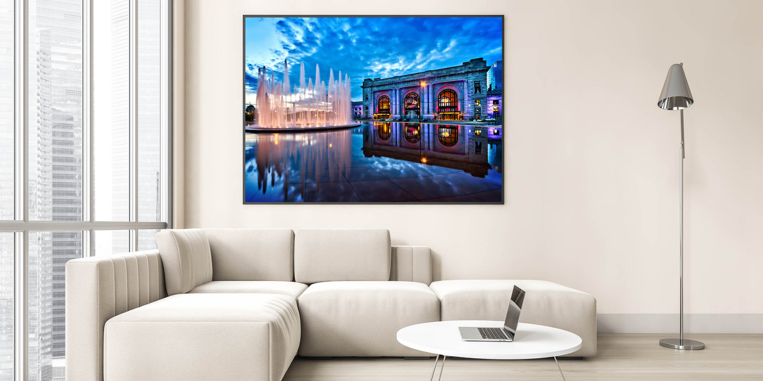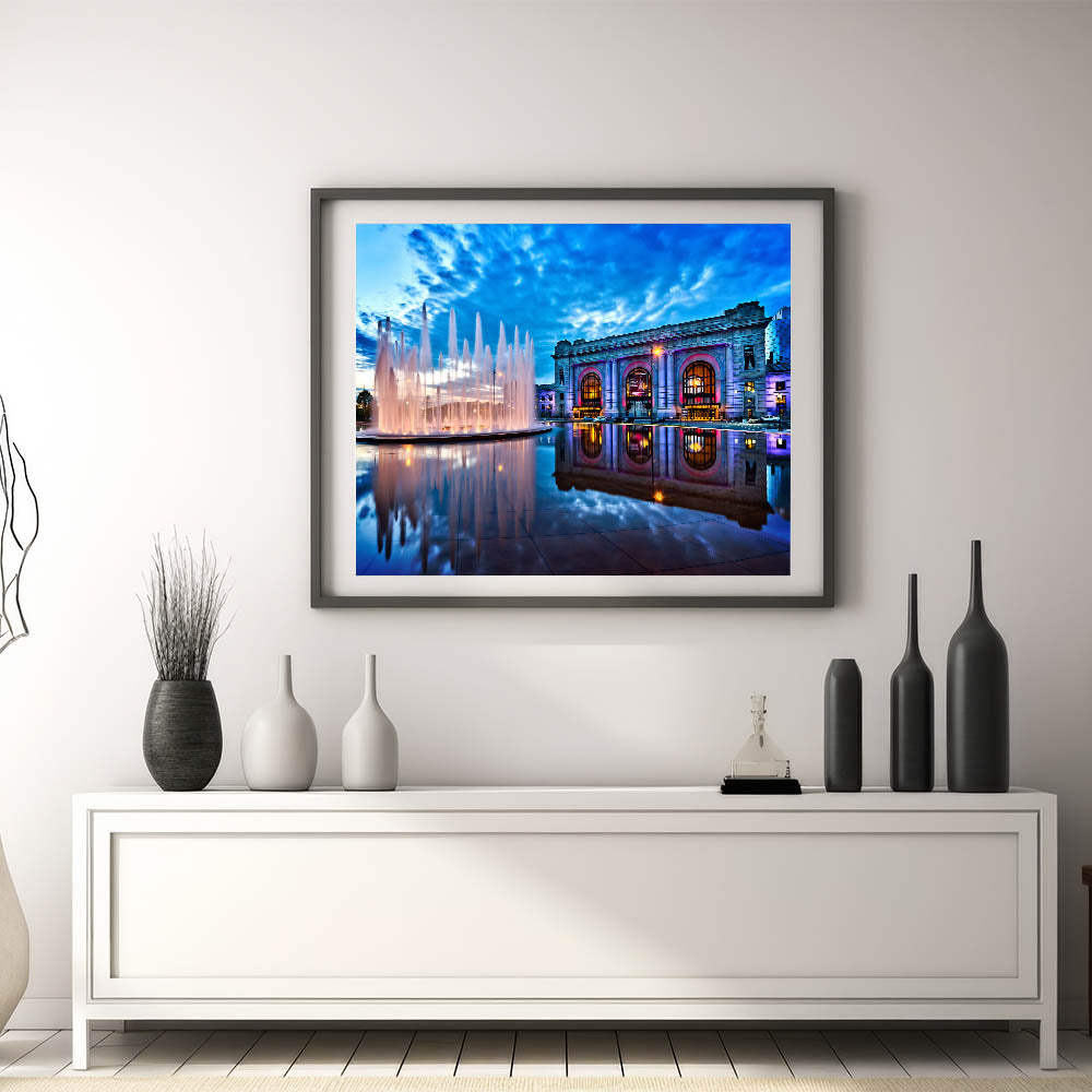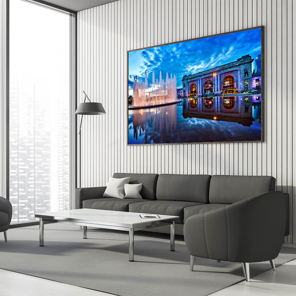 Experience the iconic beauty of Kansas City with this stunning wall art featuring the Union Station and its vibrant fountain at dusk. The reflection of the fountain on the smooth surface below, coupled with the vivid colors of the building and the dramatic sky above, makes this piece a perfect addition to any space. This Kansas City photography print captures the essence of the city’s architectural and natural charm, blending history and modernity in one frame.
