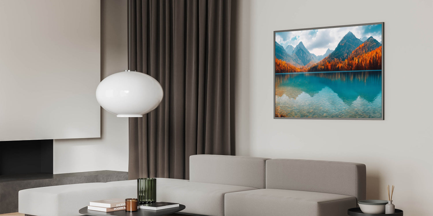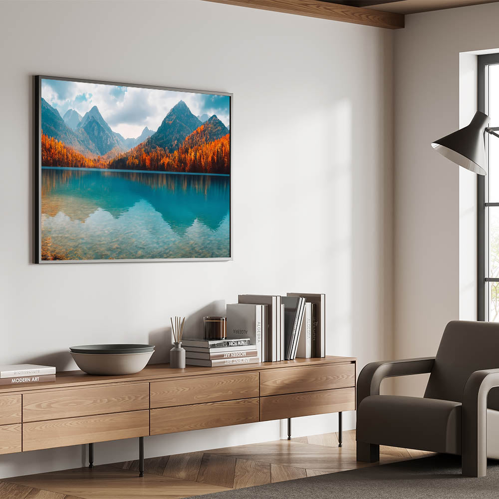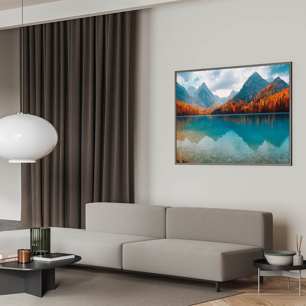 Enhance your wall decor with this nature-inspired lake print, perfect for creating a cozy and inviting atmosphere. This autumn lake scene adds warmth and elegance to any setting, making it a must-have for those who appreciate the beauty of the outdoors.