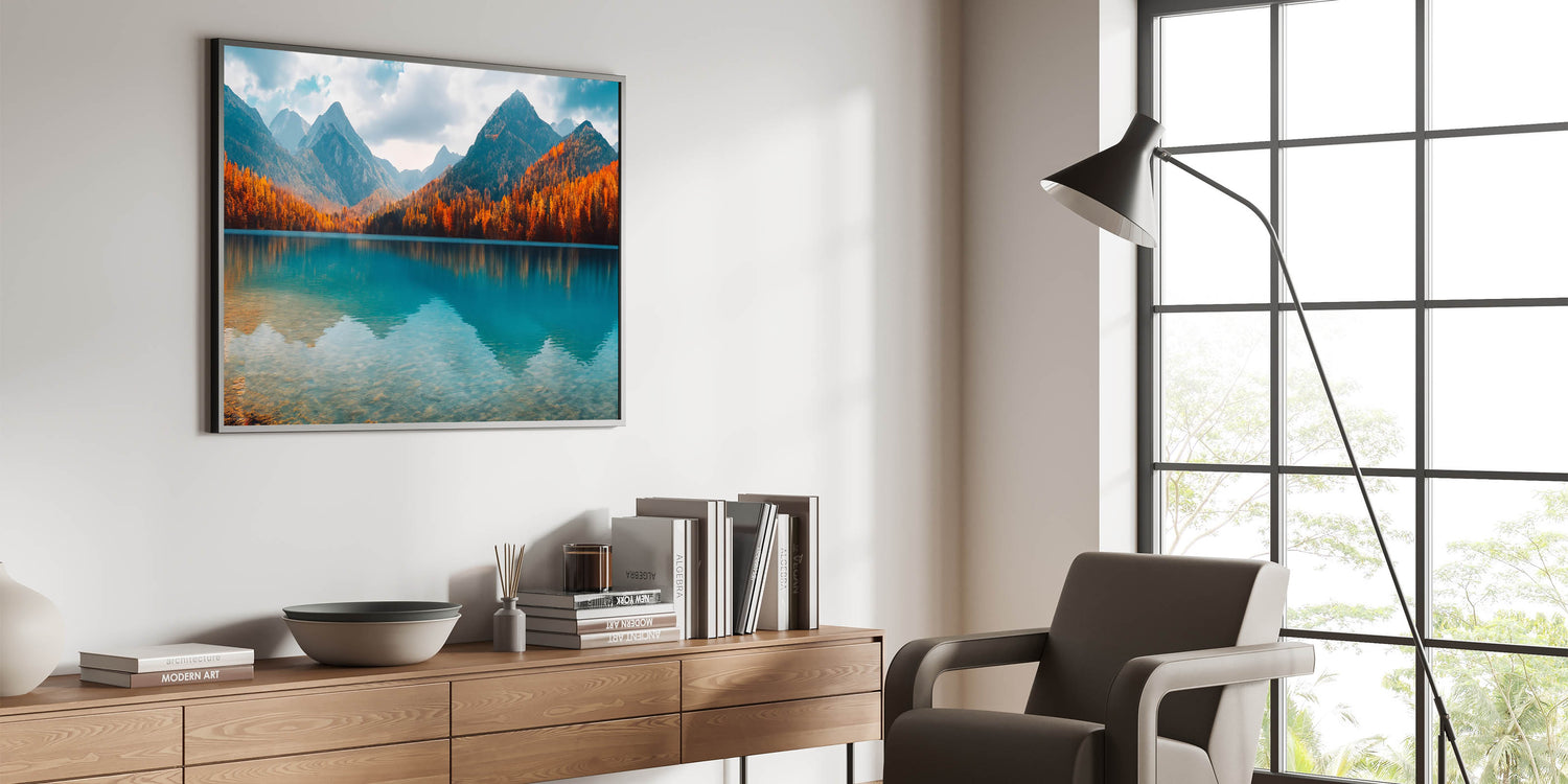 Bring the vibrant colors of autumn into your home with this stunning lake photography print. This artwork captures a serene lakeside scene surrounded by rich fall foliage, reflecting beautifully off the calm, clear waters. The combination of deep blue water and fiery orange and red trees creates a striking contrast, making this piece a perfect focal point for any room.
