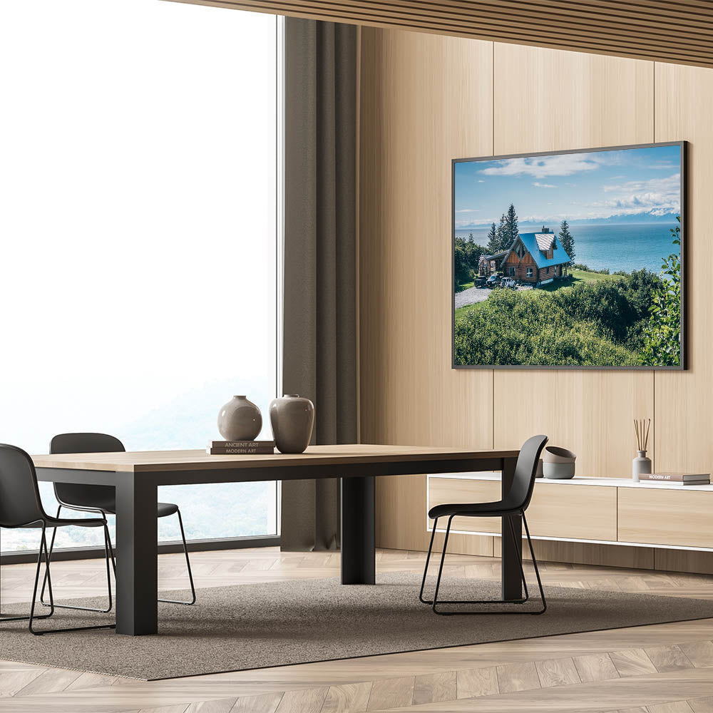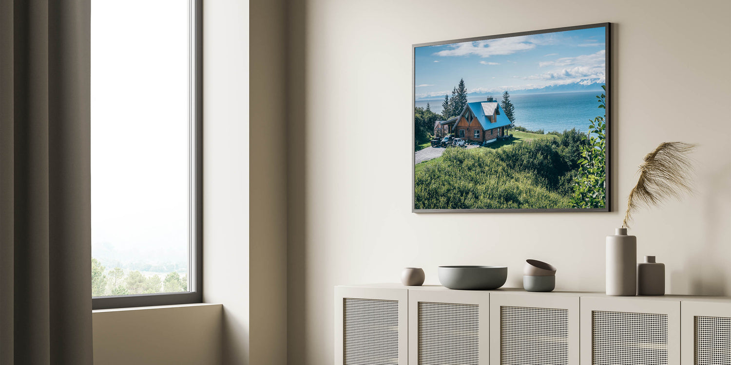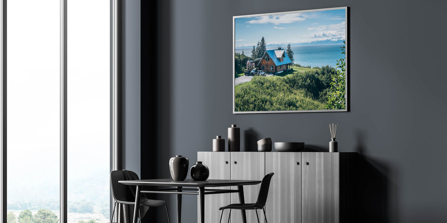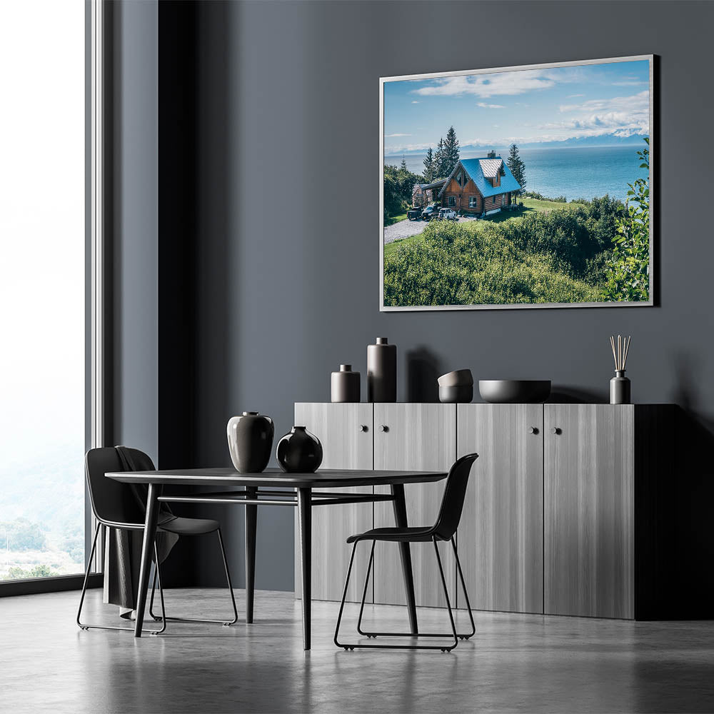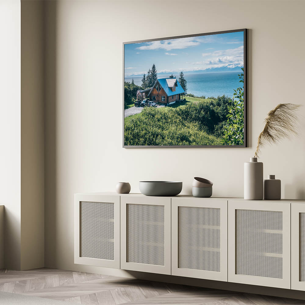 Escape to a tranquil retreat with this Scenic Lakeside Cabin Art, showcasing a rustic cabin perched above a stunning ocean view, surrounded by lush greenery. The crisp blue of the sky and water contrasts beautifully with the rich green foliage, creating a serene and inviting atmosphere. The cabin's charming architecture adds a touch of warmth and coziness, making this artwork a perfect addition to any space that seeks to embody the peace and beauty of nature.