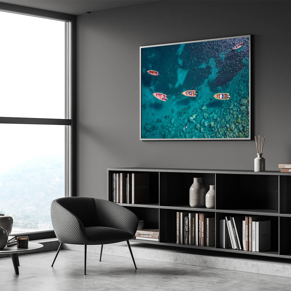 Bring the vibrant Caribbean island decor into your space with this stunning depiction of boats gently floating above a coral-filled seabed. This Martinique canvas print will transform any room into a tropical paradise.