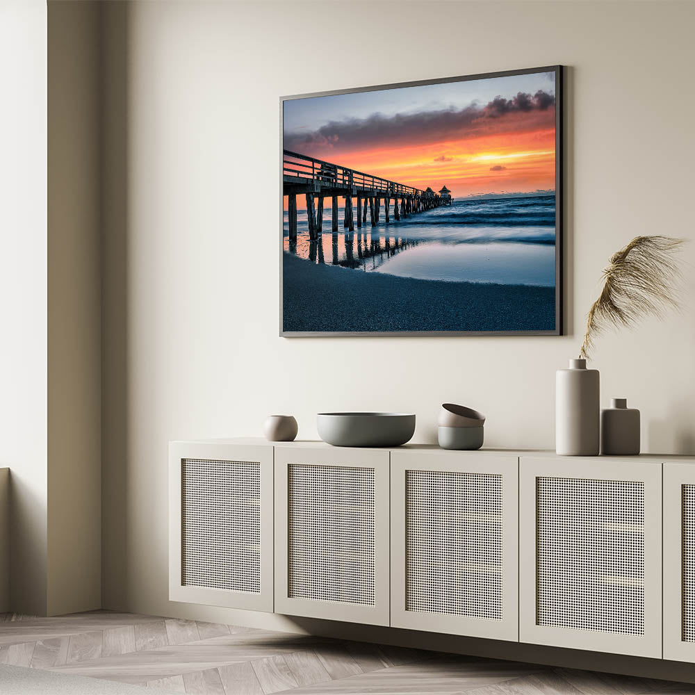 Immerse yourself in the tranquility of Naples with this stunning Scenic Naples Canvas Print. This artwork captures the peaceful beauty of a pier at sunset, with the sky ablaze in vibrant hues and the waves gently lapping against the shore. Part of the Beautiful Naples Wall Art Collection, this piece is perfect for adding a sense of calm and serenity to your home.