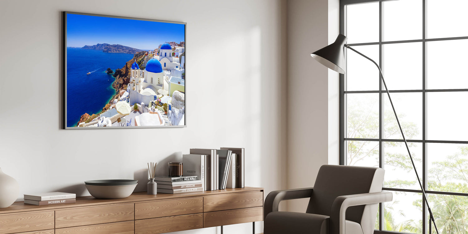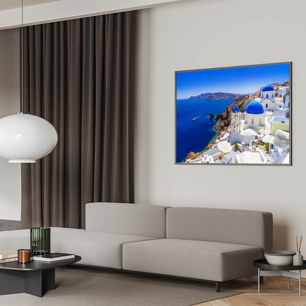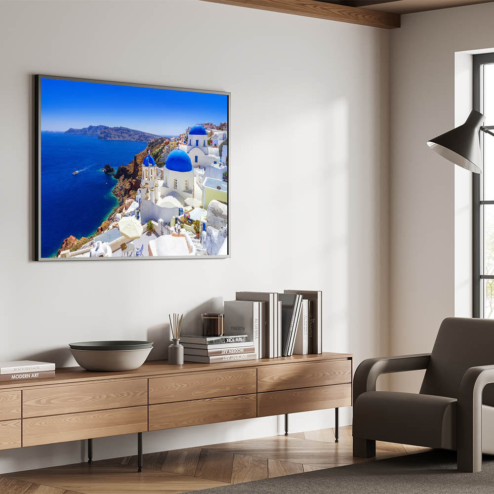 Immerse yourself in the beauty of Santorini with this stunning Santorini wall art. Capturing the breathtaking coastal landscape, this Greece landscape art showcases the island’s iconic blue domes, crisp white architecture, and the vibrant turquoise waters of the Aegean Sea. Perfect for adding a touch of Greek island decor to your home, this print brings a piece of the Mediterranean into any room.