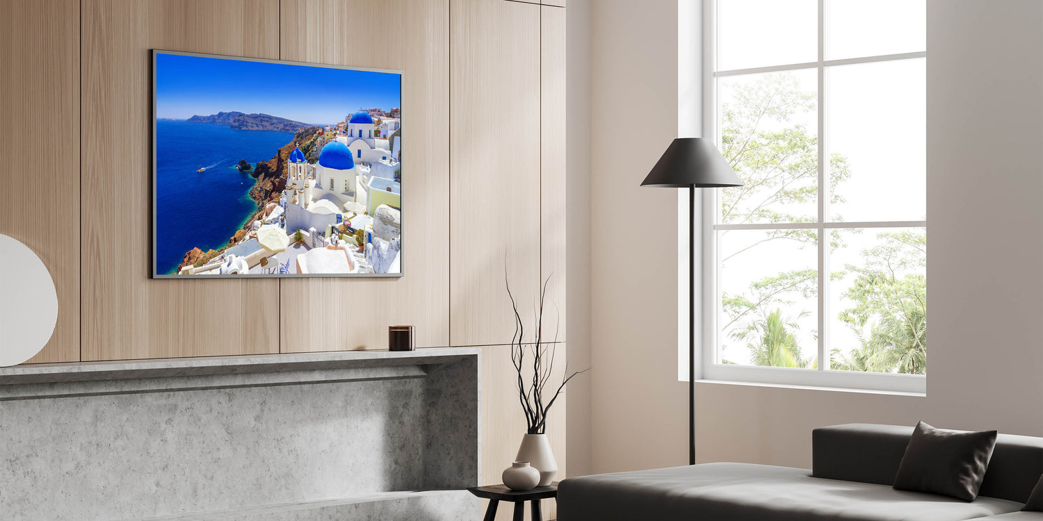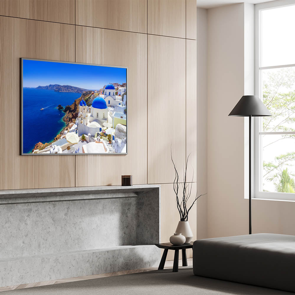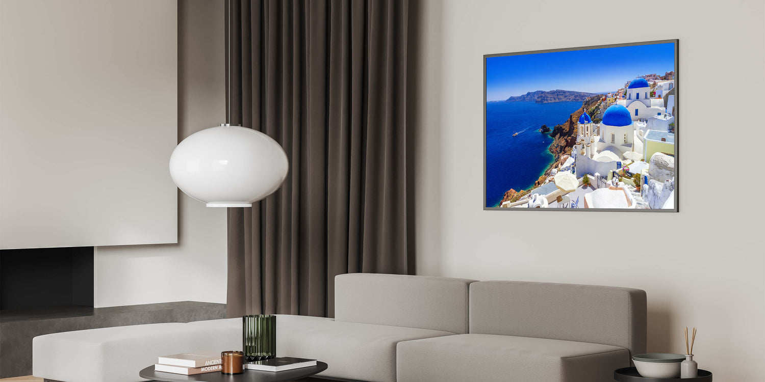 Immerse yourself in the beauty of Santorini with this stunning Santorini wall art. Capturing the breathtaking coastal landscape, this Greece landscape art showcases the island’s iconic blue domes, crisp white architecture, and the vibrant turquoise waters of the Aegean Sea. Perfect for adding a touch of Greek island decor to your home, this print brings a piece of the Mediterranean into any room.
